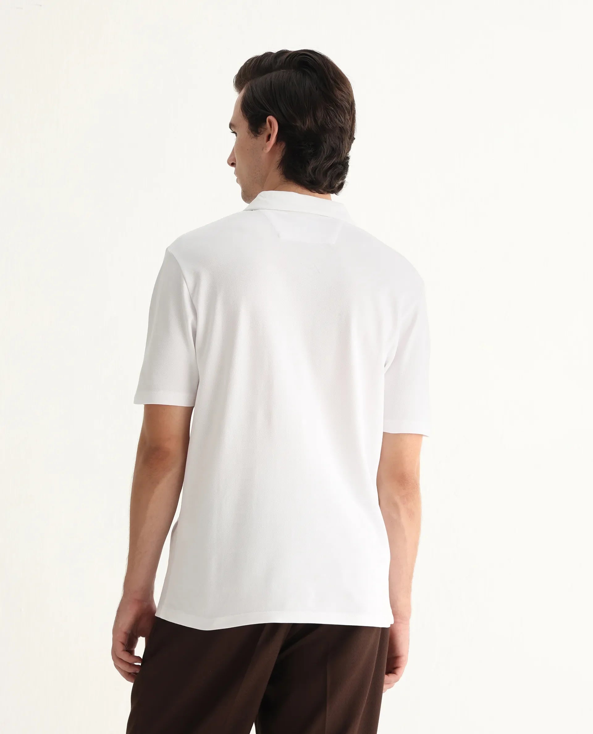 Rare Rabbit Men Berner White Cotton Lycra Fabric Short Sleeve Collared Neck Zipper Closure Graphic Print Polo