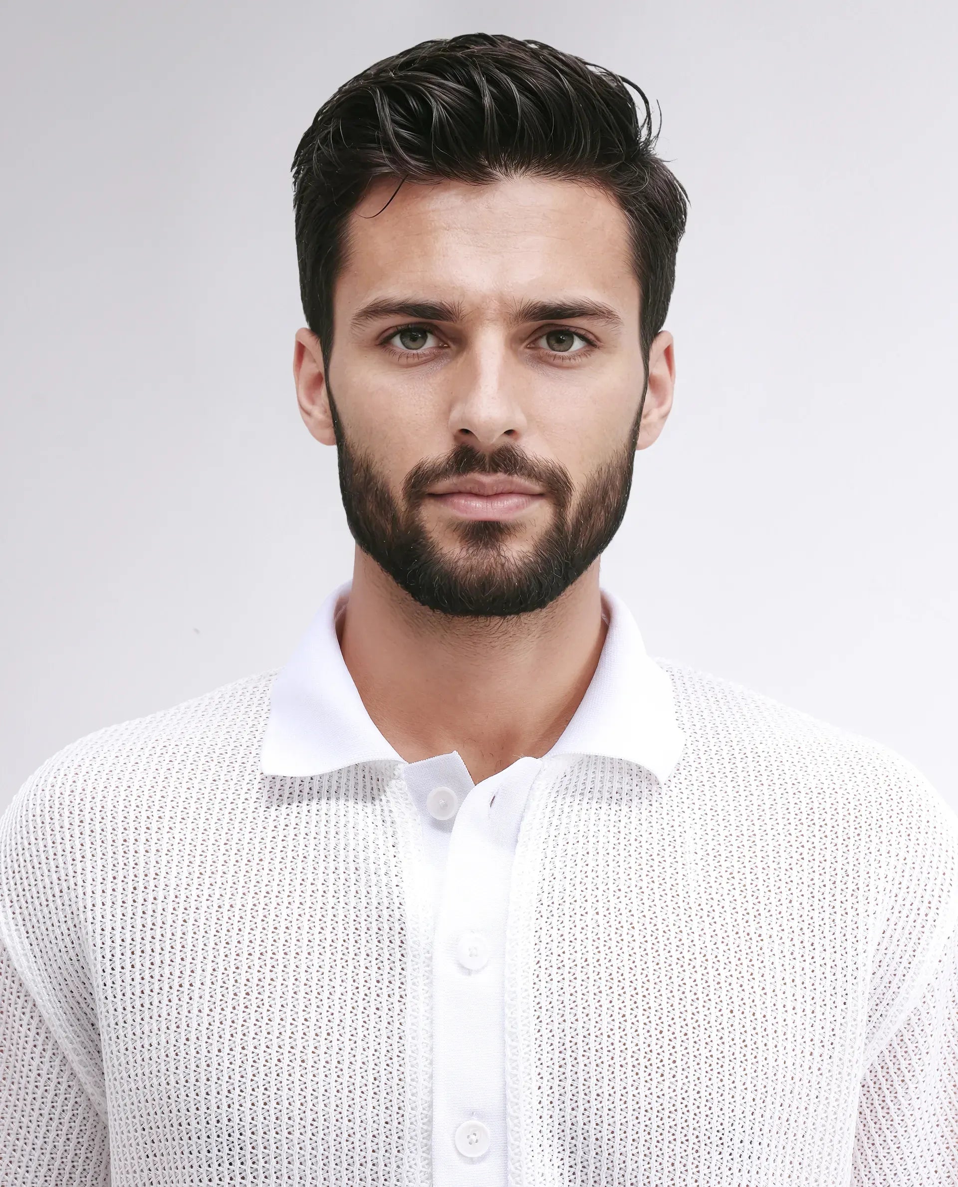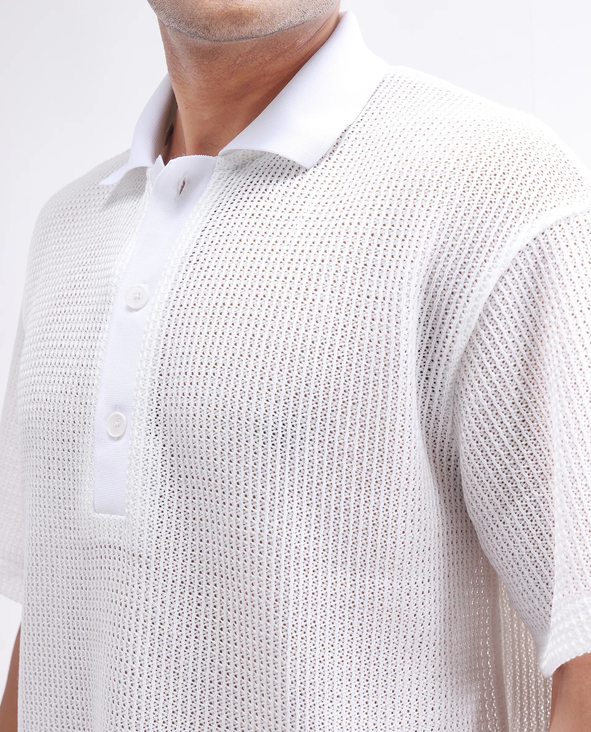 Rare Rabbit Men's Lbiza White Cotton Fabric Short Sleeve Collared Neck Button Closure Knitted Shirt