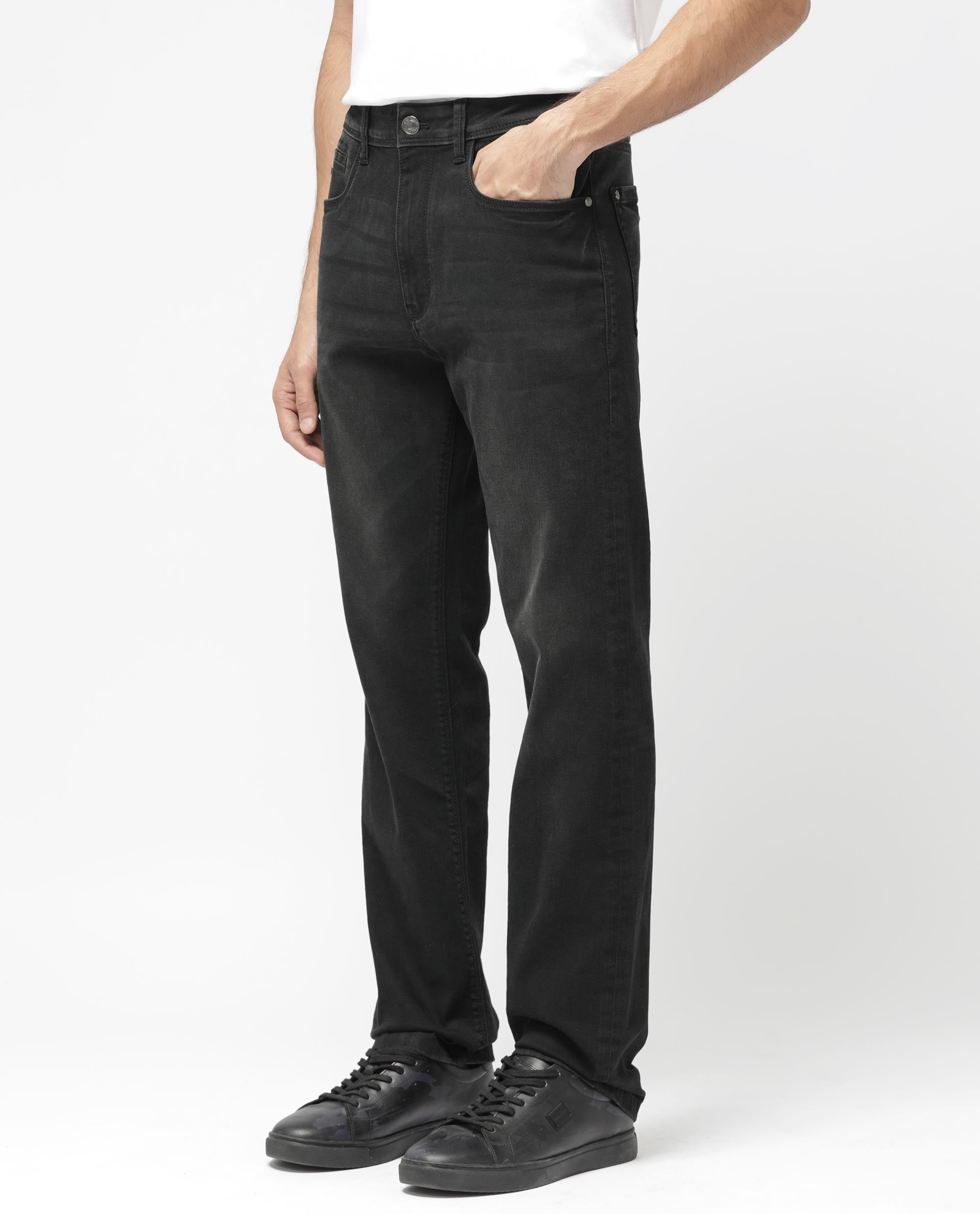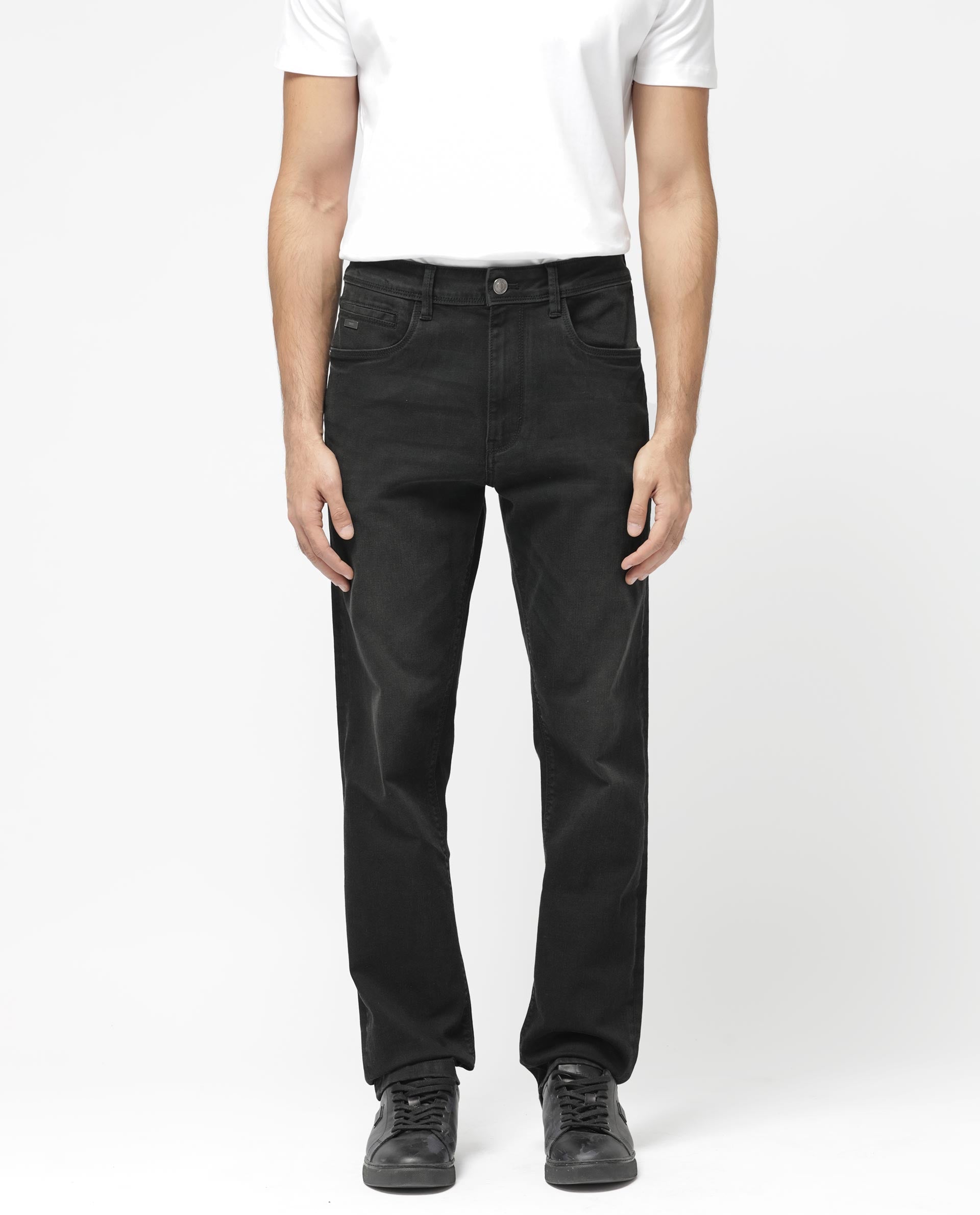 Rare Rabbit Men's Inky Black Regular Fit Mid Rise Dark Wash With Mild Whiskers Jeans