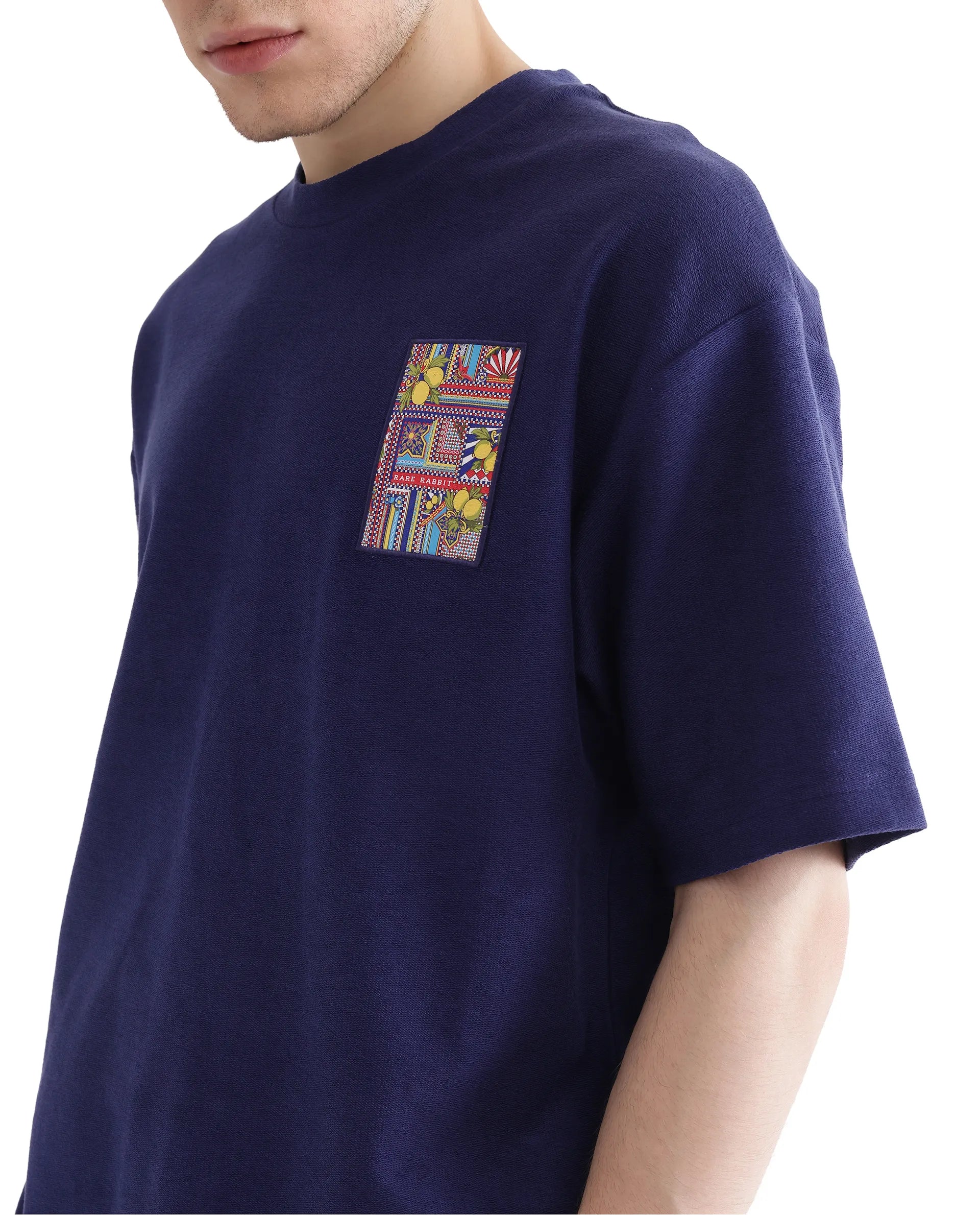 Rare Rabbit Men Oxo Dark Blue Cotton Fabric Short Sleeve Crew Neck Embroidered T-Shirt