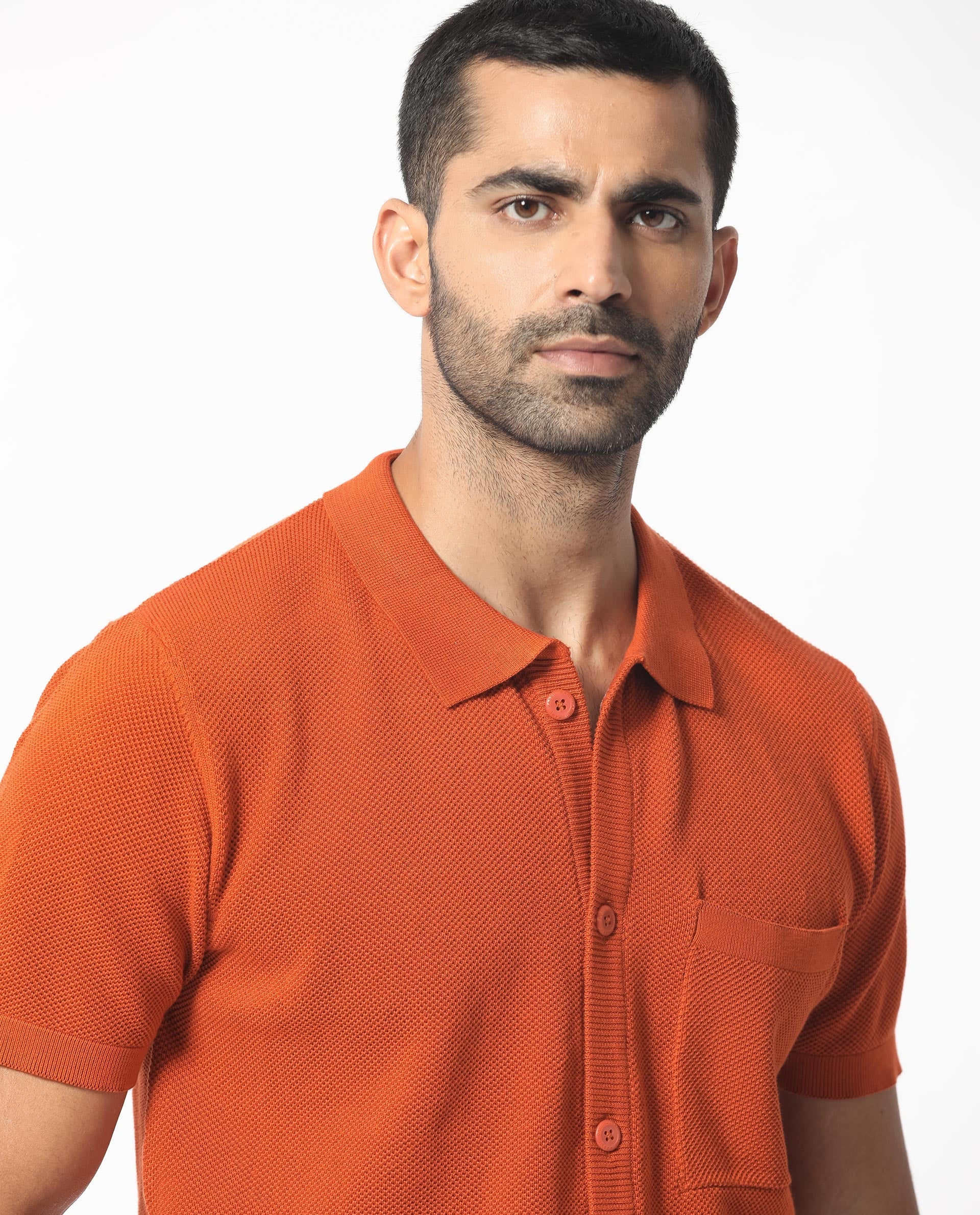 Rare Rabbit Men's Boise Ss Rust Cotton Fabric Half Sleeves Solid Knit Shirt