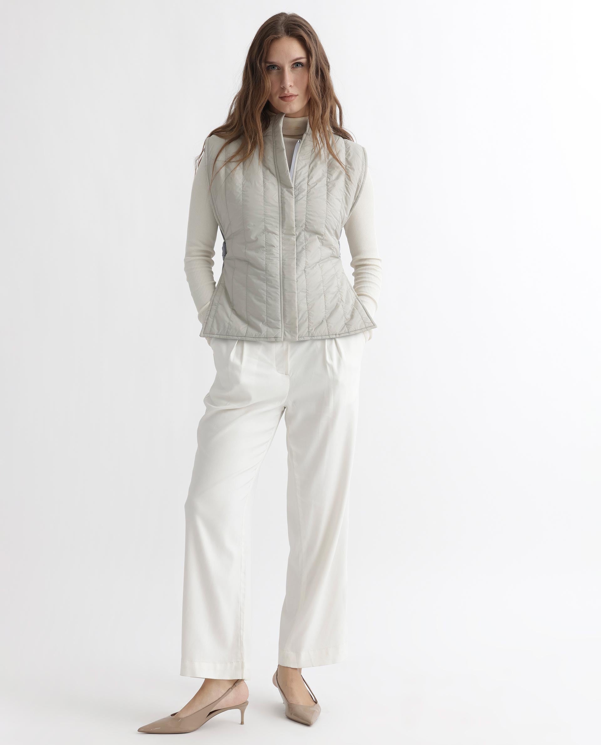 Rareism Women Aurora Beige Polyester Fabric Sleeveless Solid High Neck Jacket