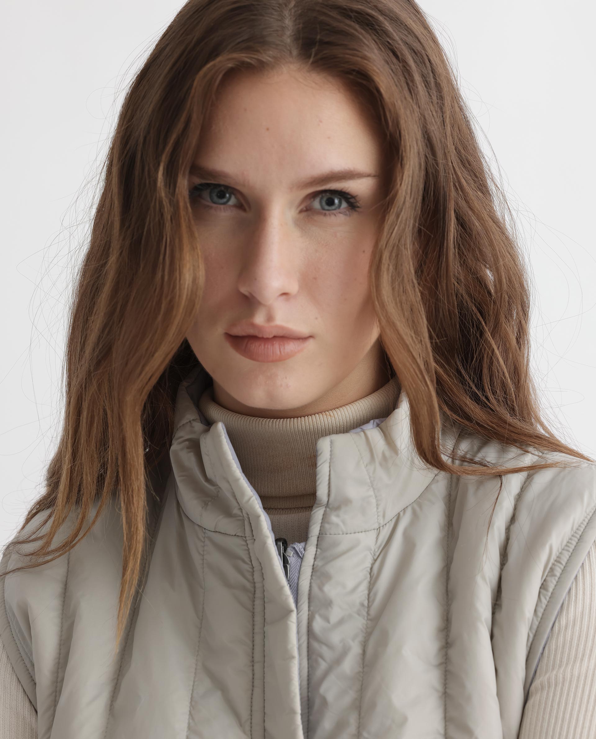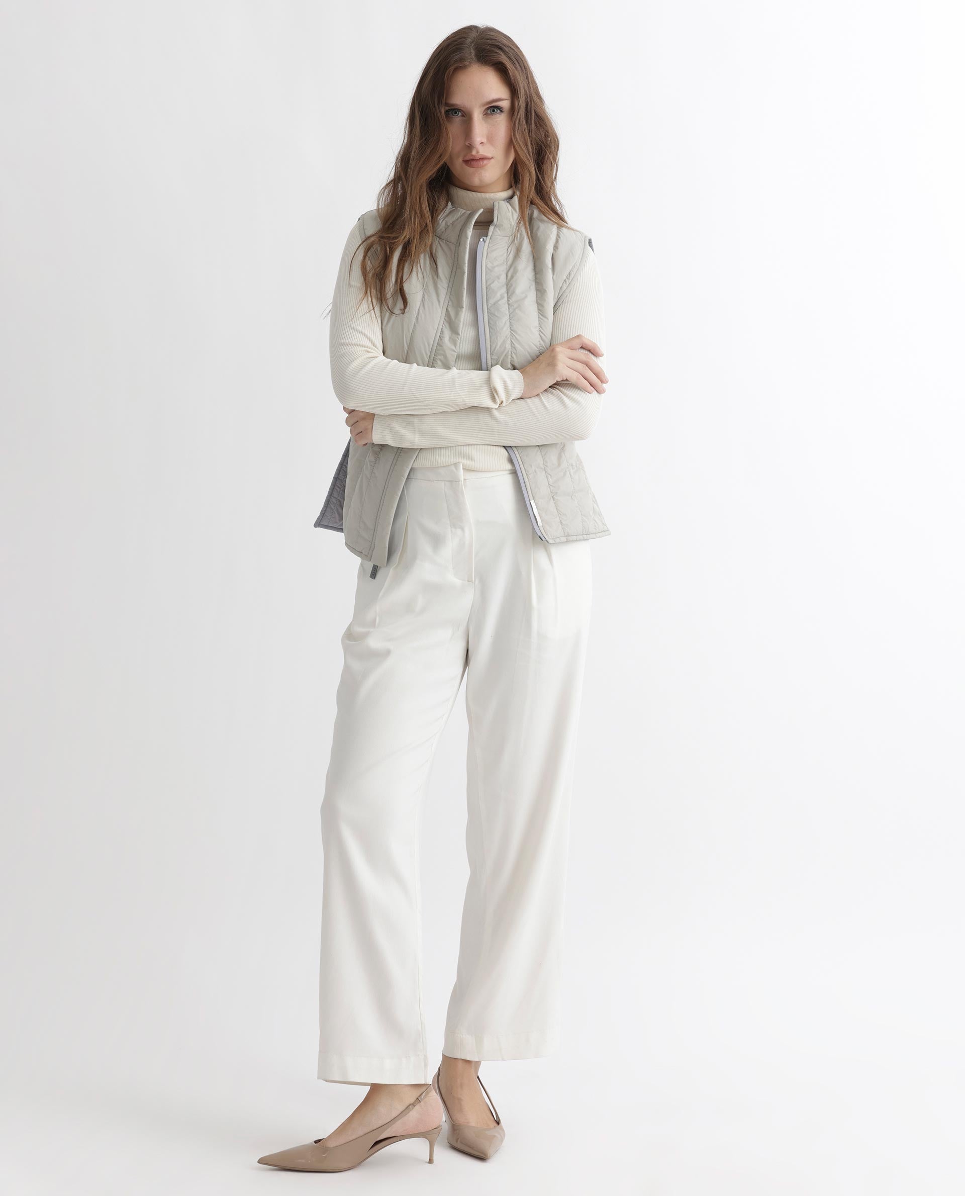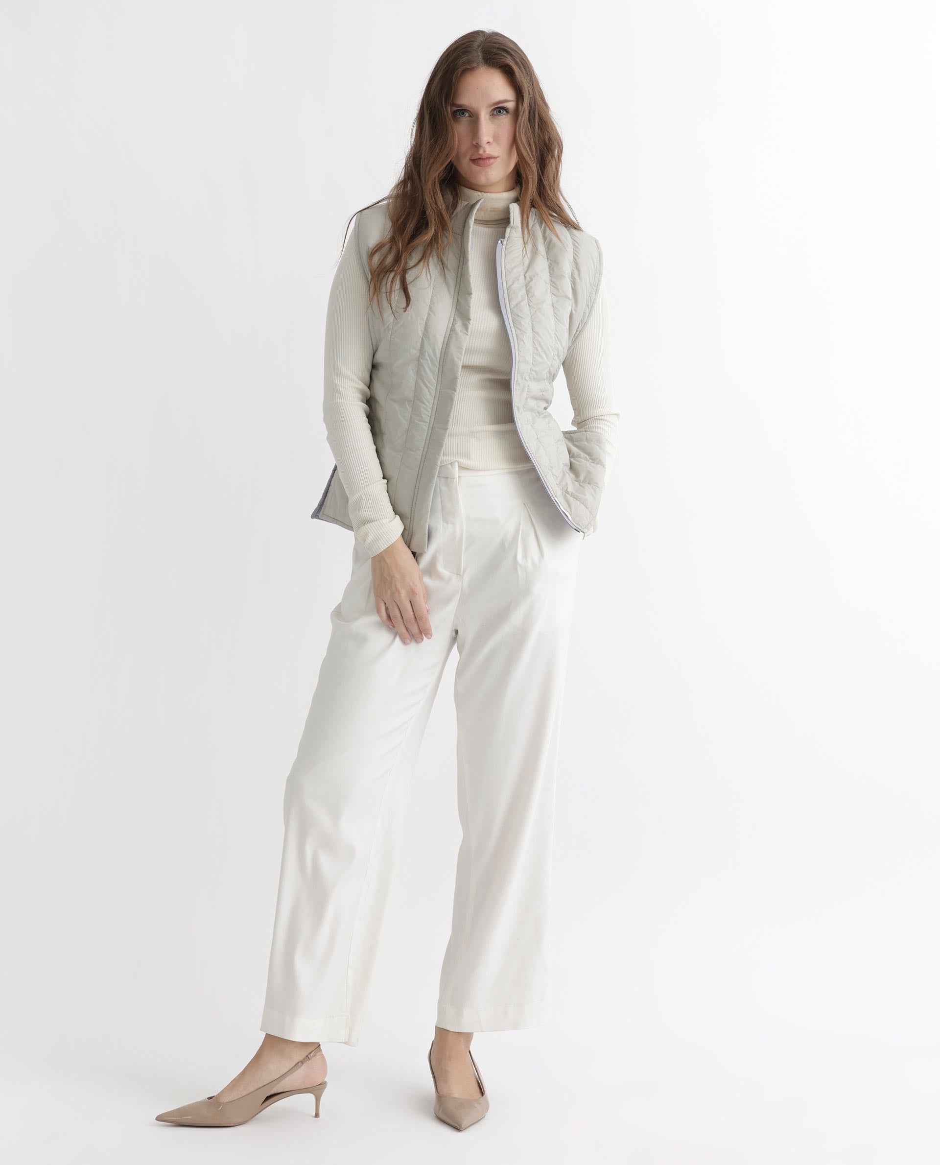 A contemporary style sleeveless puffer jacket with a quilted vertical structure.