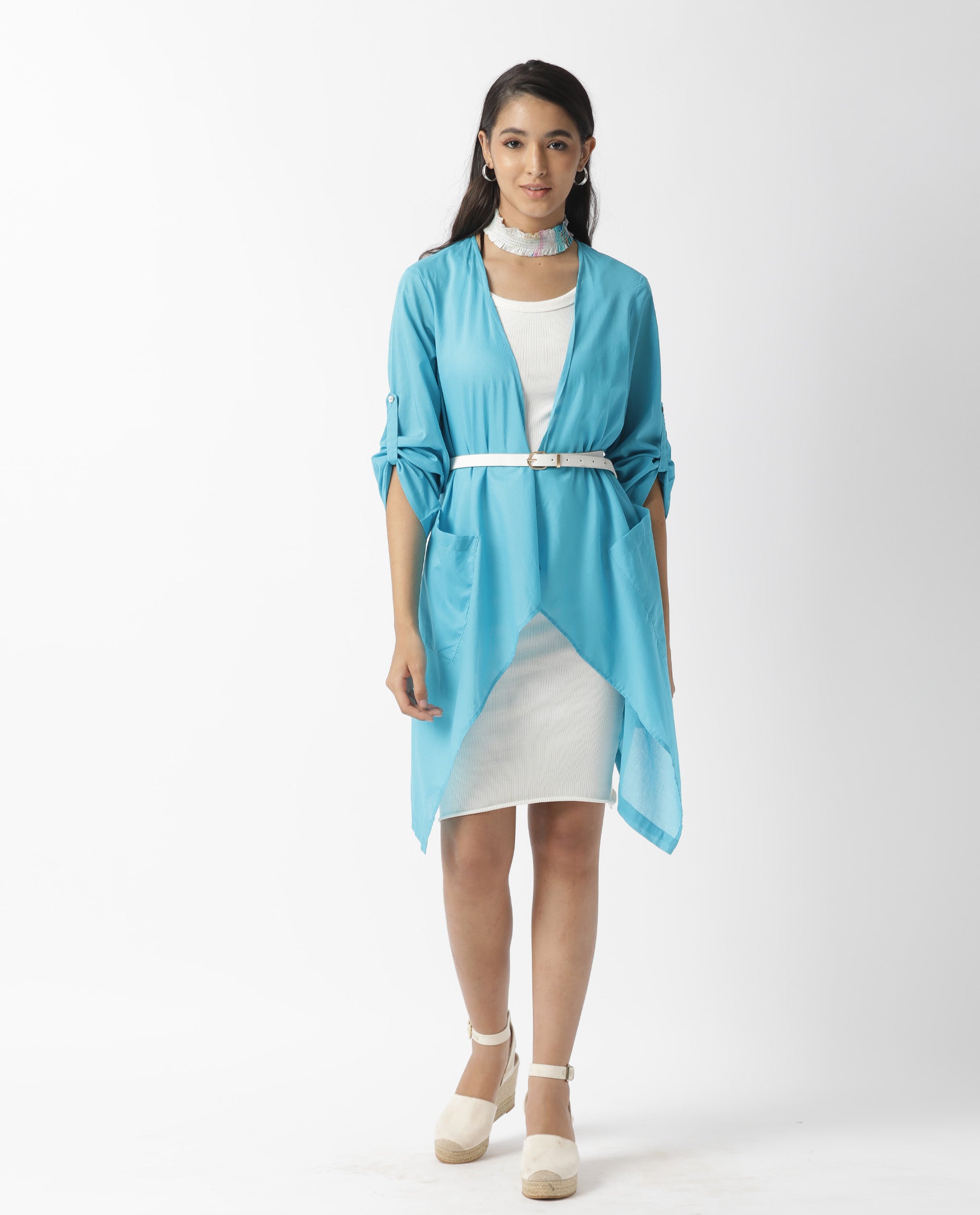 Rareism Women Gazer Blue Cotton Fabric Regular Fit Knee Length Solid Collarless Outer Wear