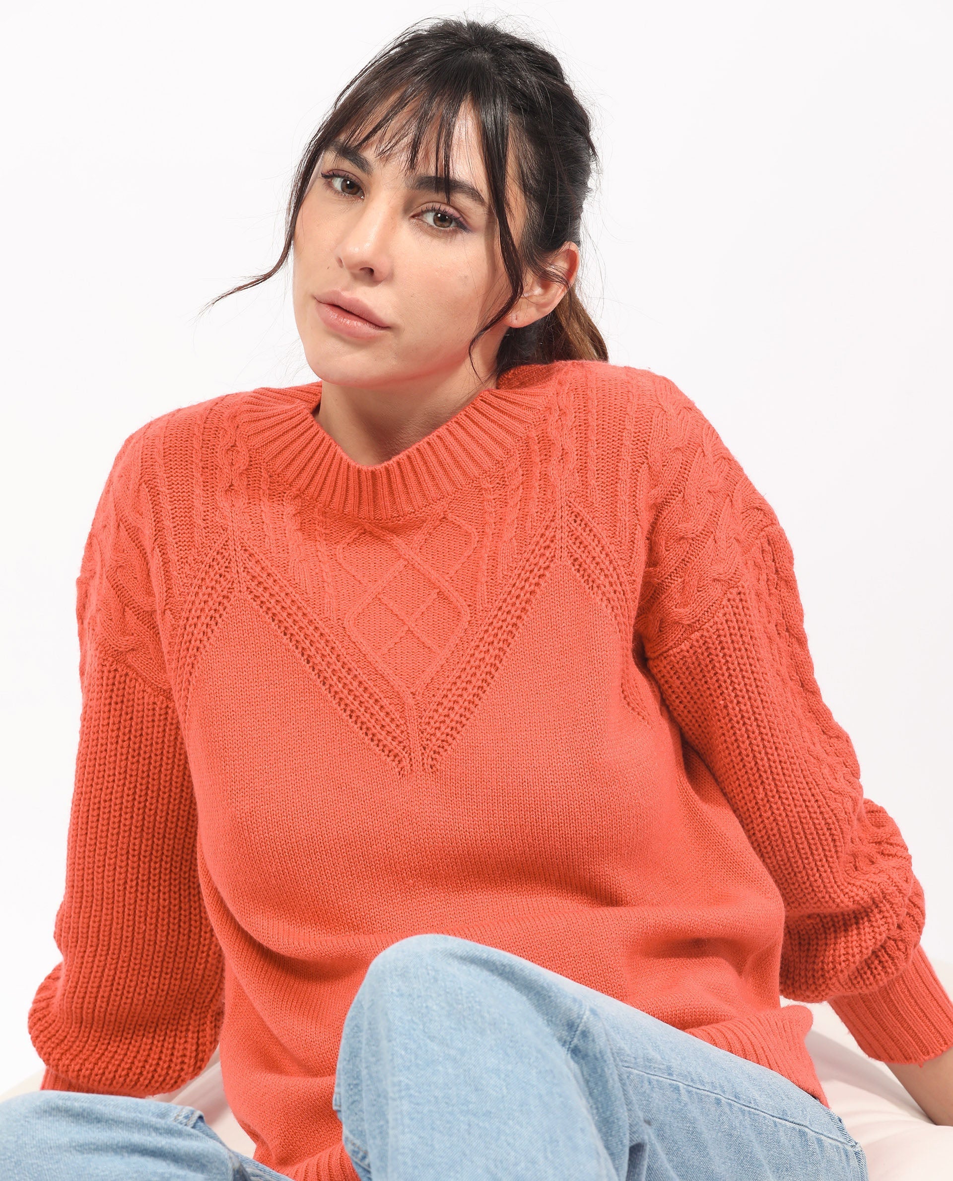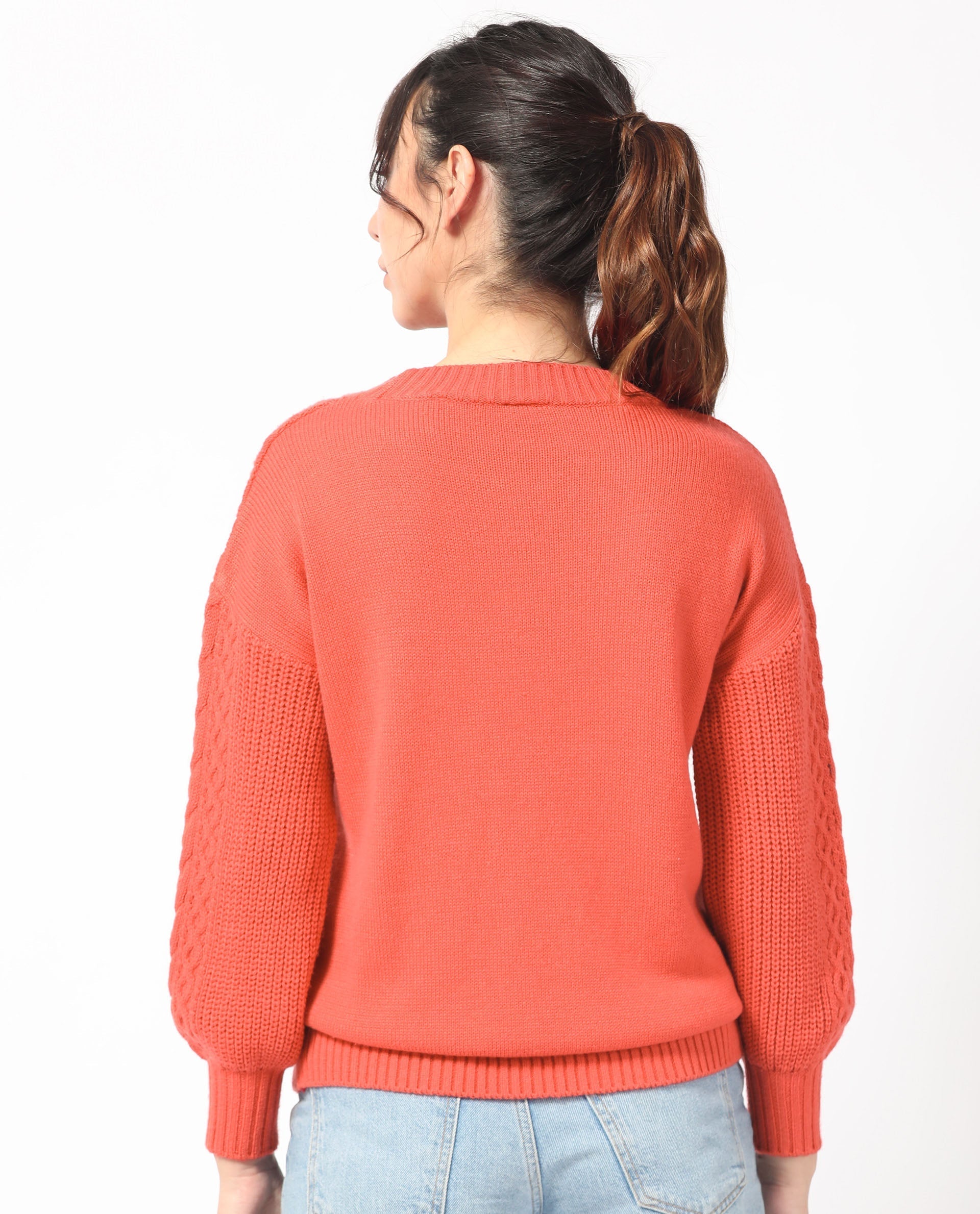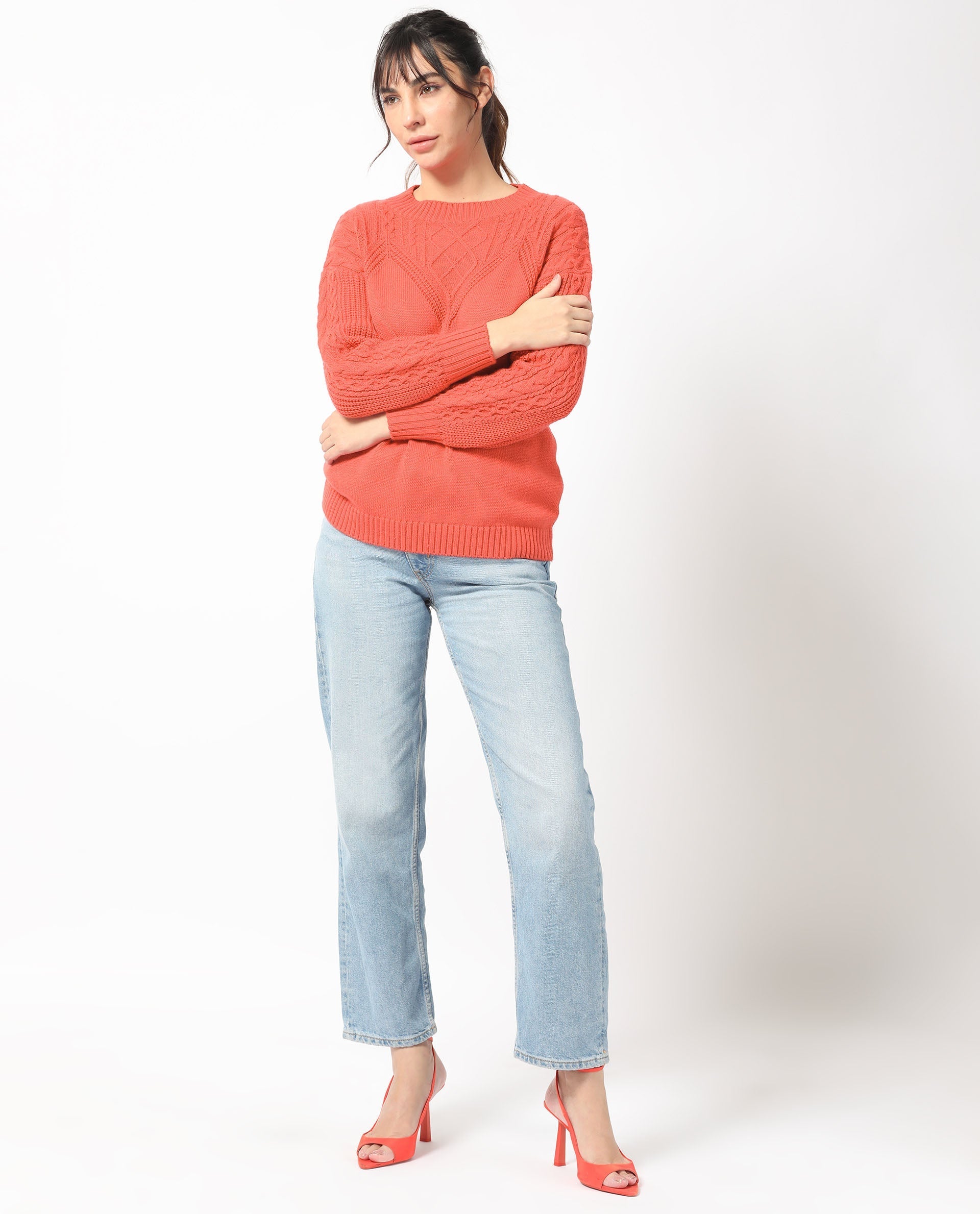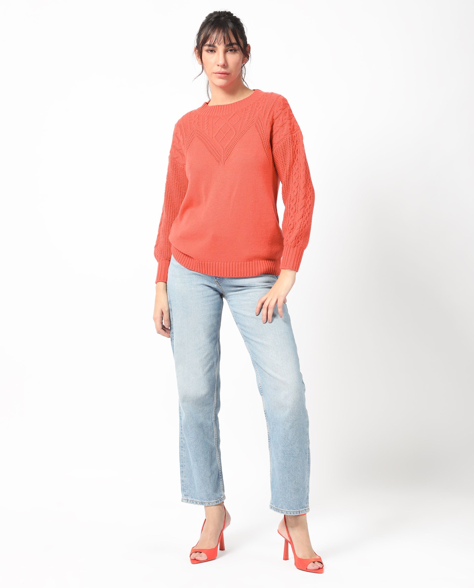 Rareism Women Klein Orange Acrylic Fabric Full Sleeves Regular Fit Solid Round Neck Sweater