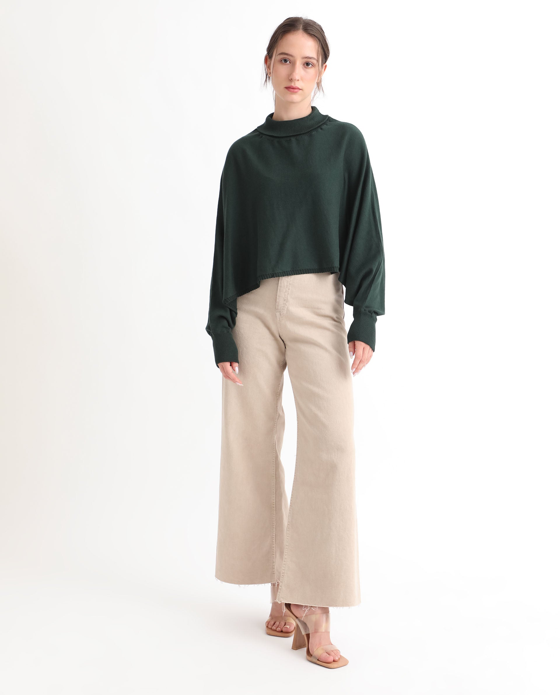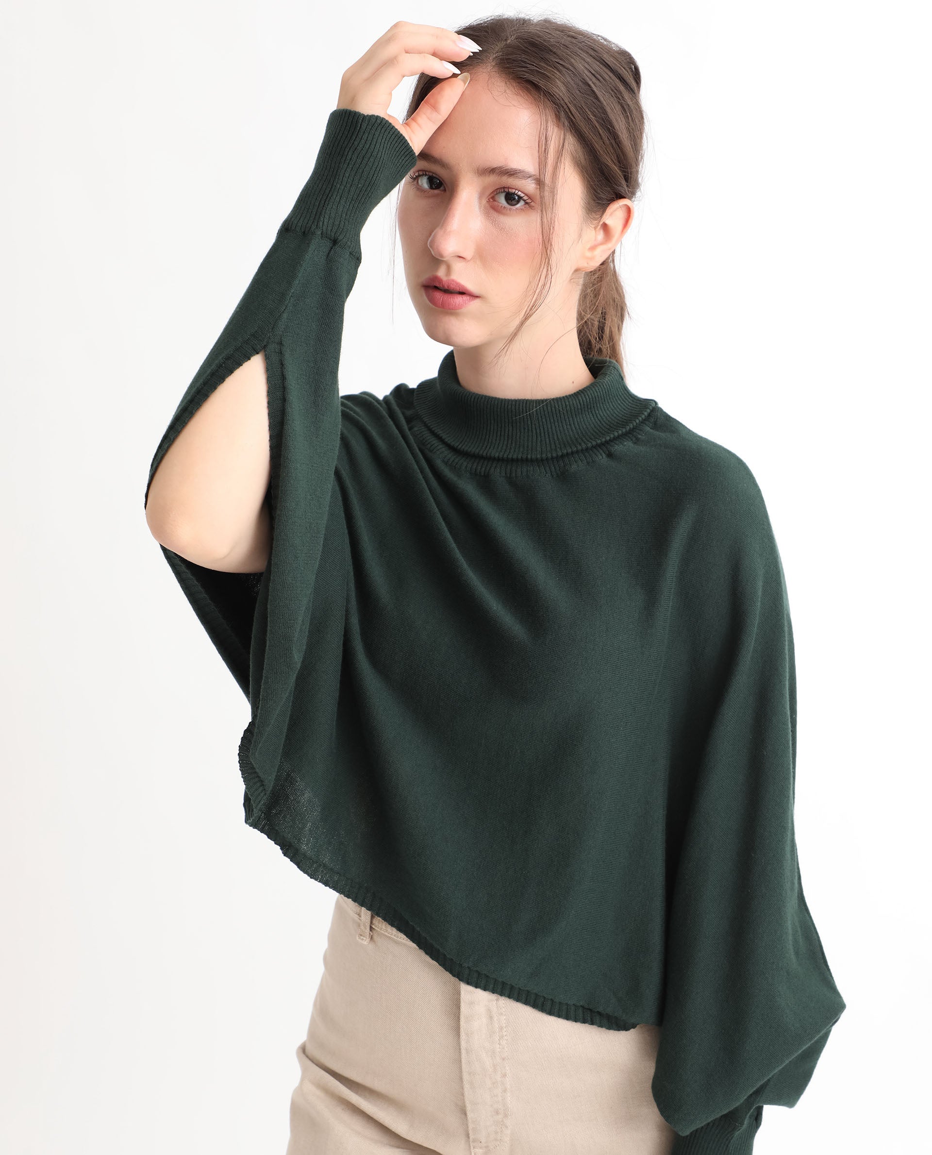 Rareism Women Modem Green Cotton Fabric Full Sleeves Regular Fit Solid High Neck Sweater