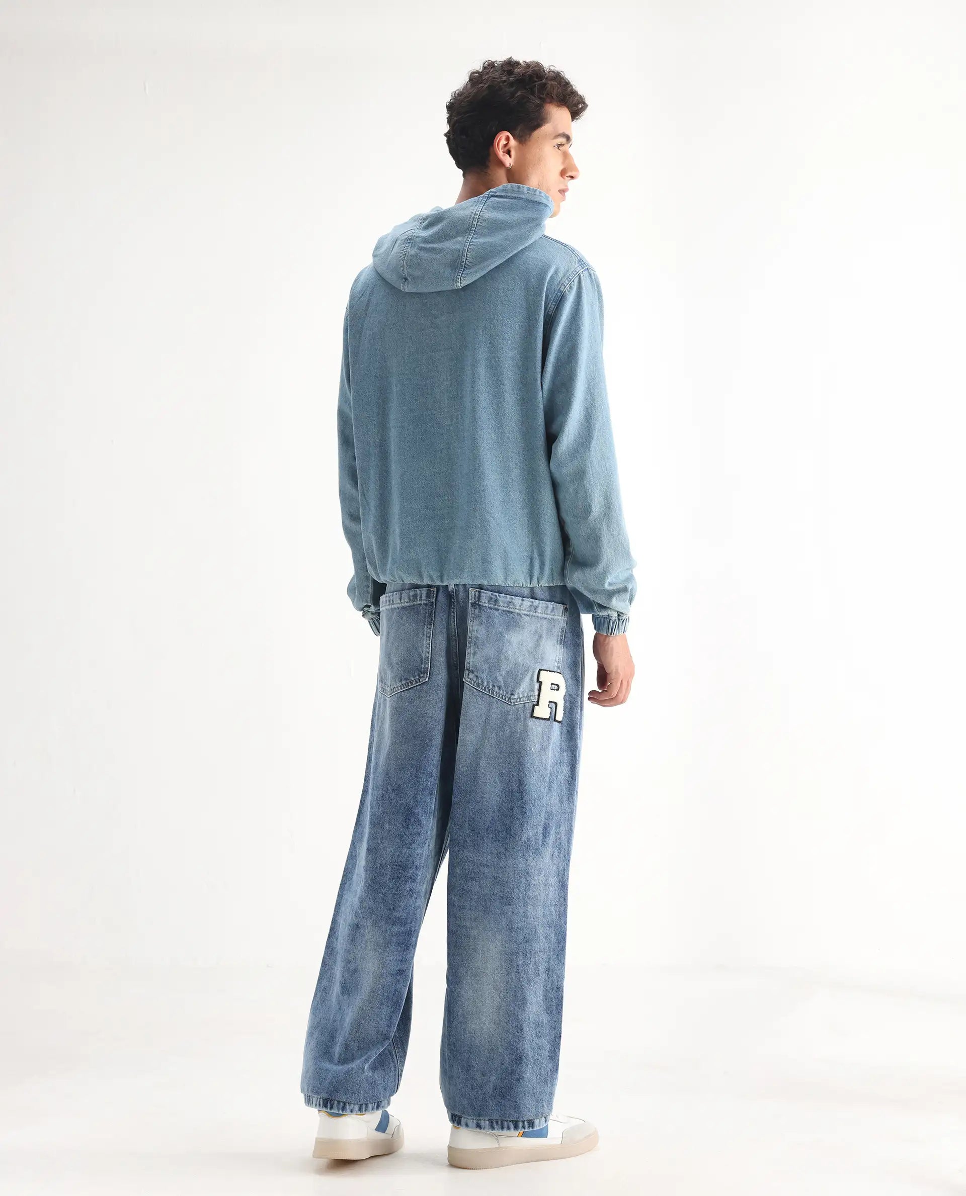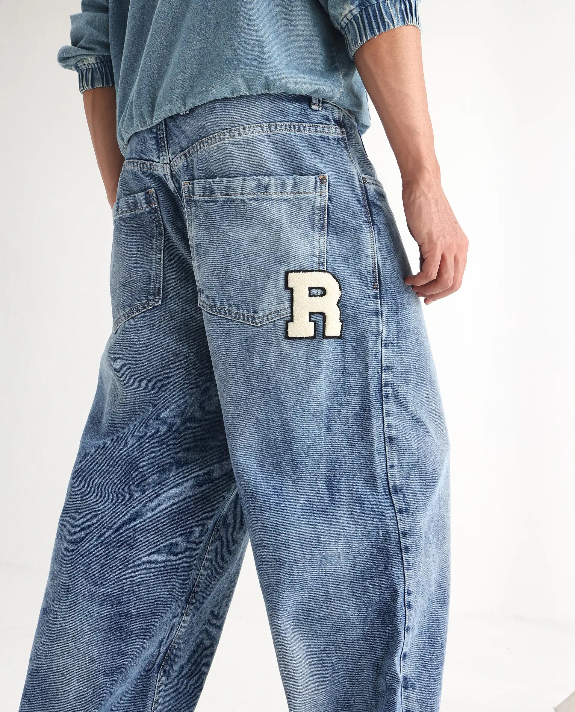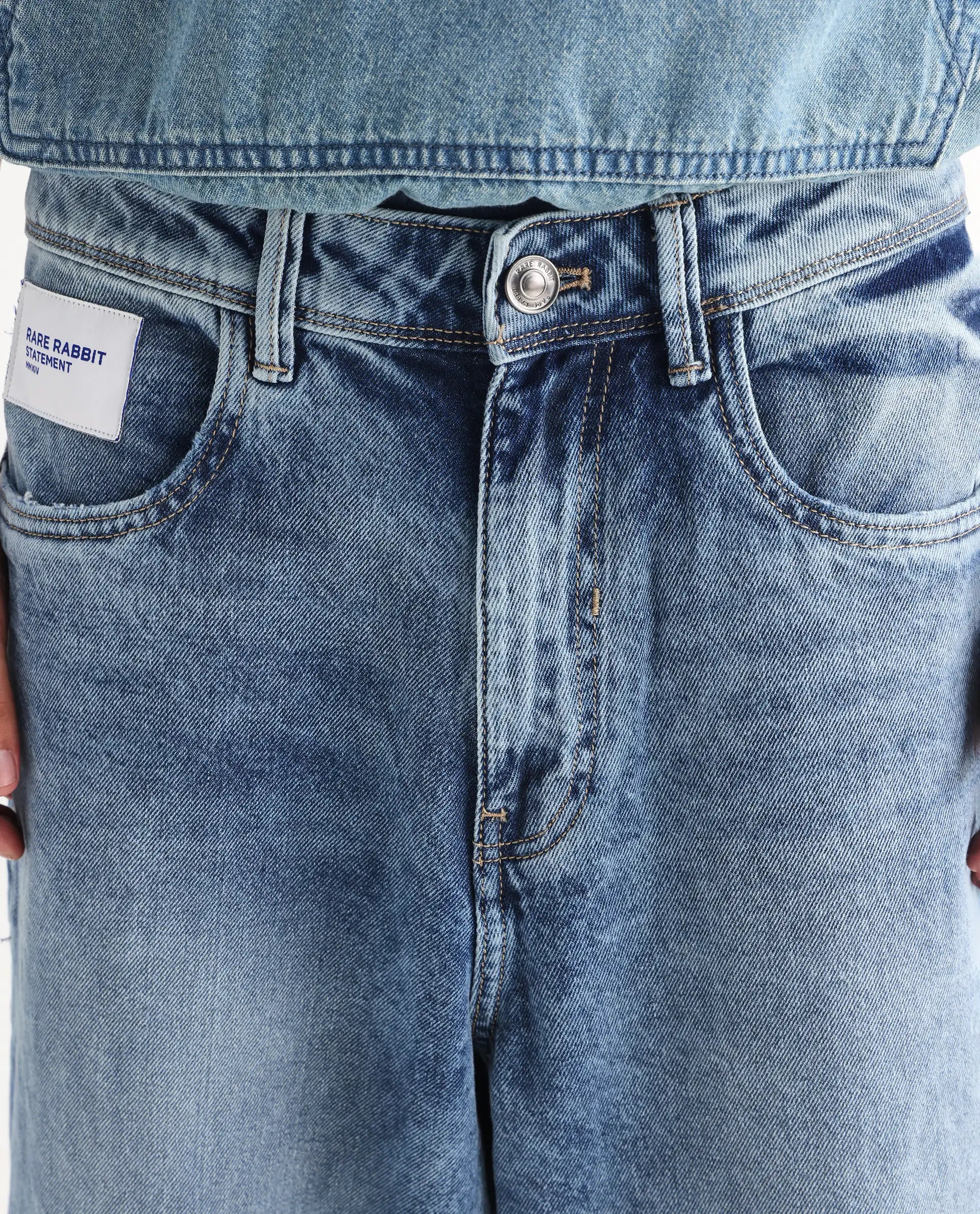 Rare Rabbit Men Riffin Light Blue Cotton Fabric Button And Zip Closure Baggy Fit Embroidered Logo Plain Jeans