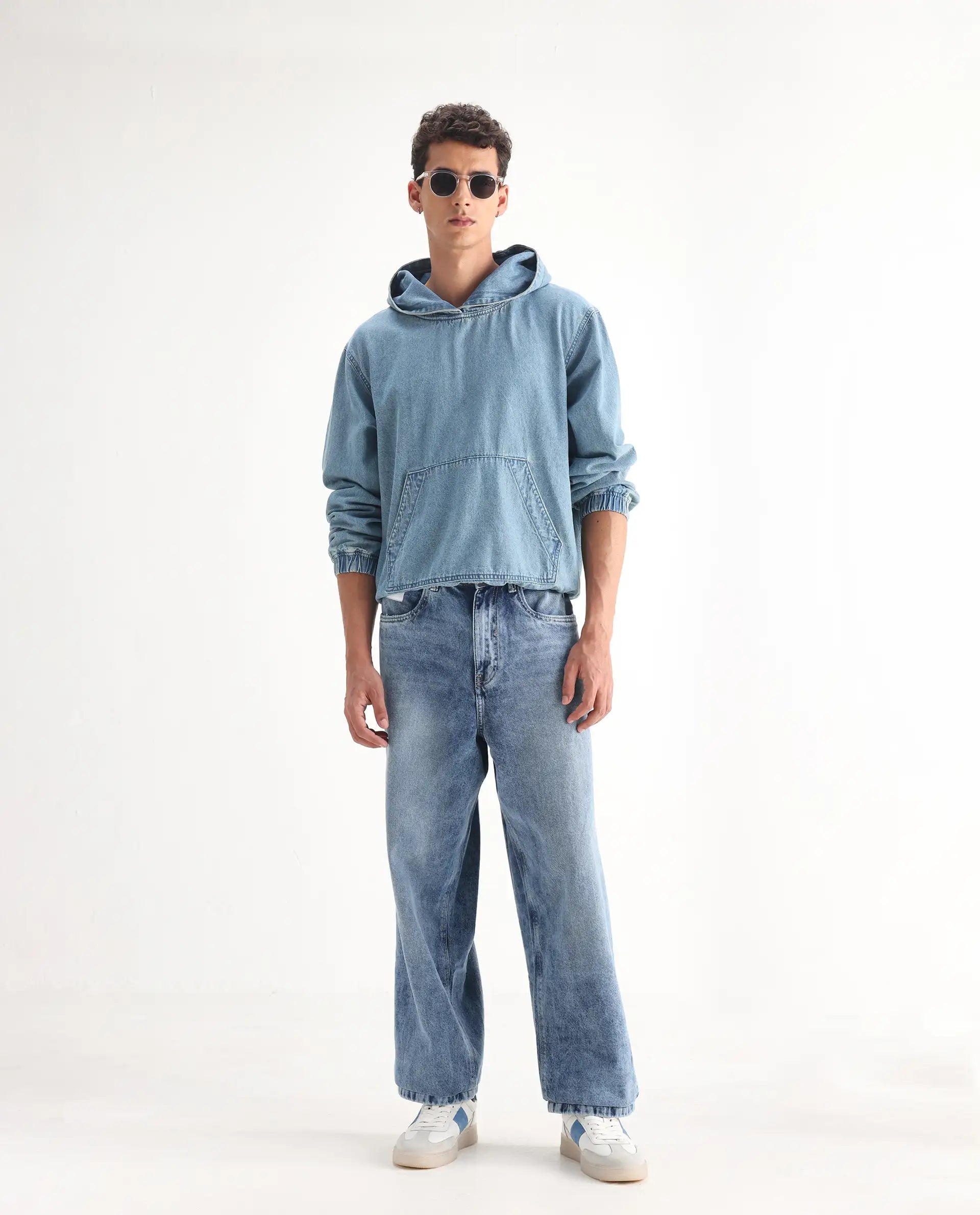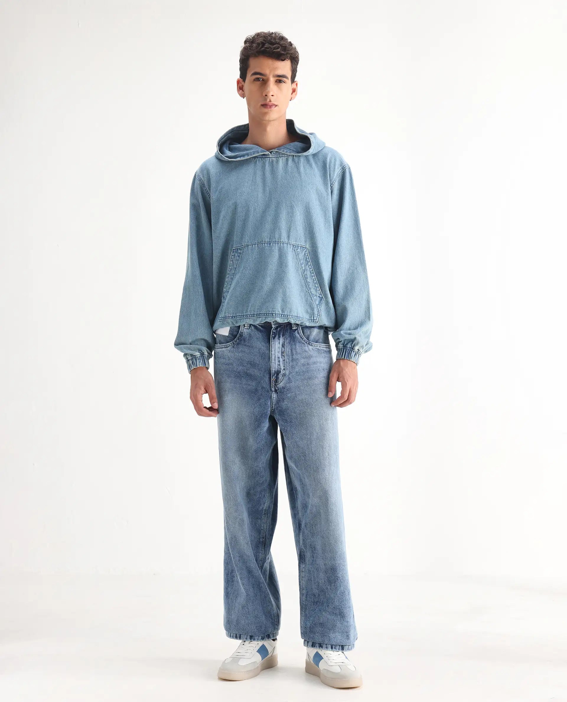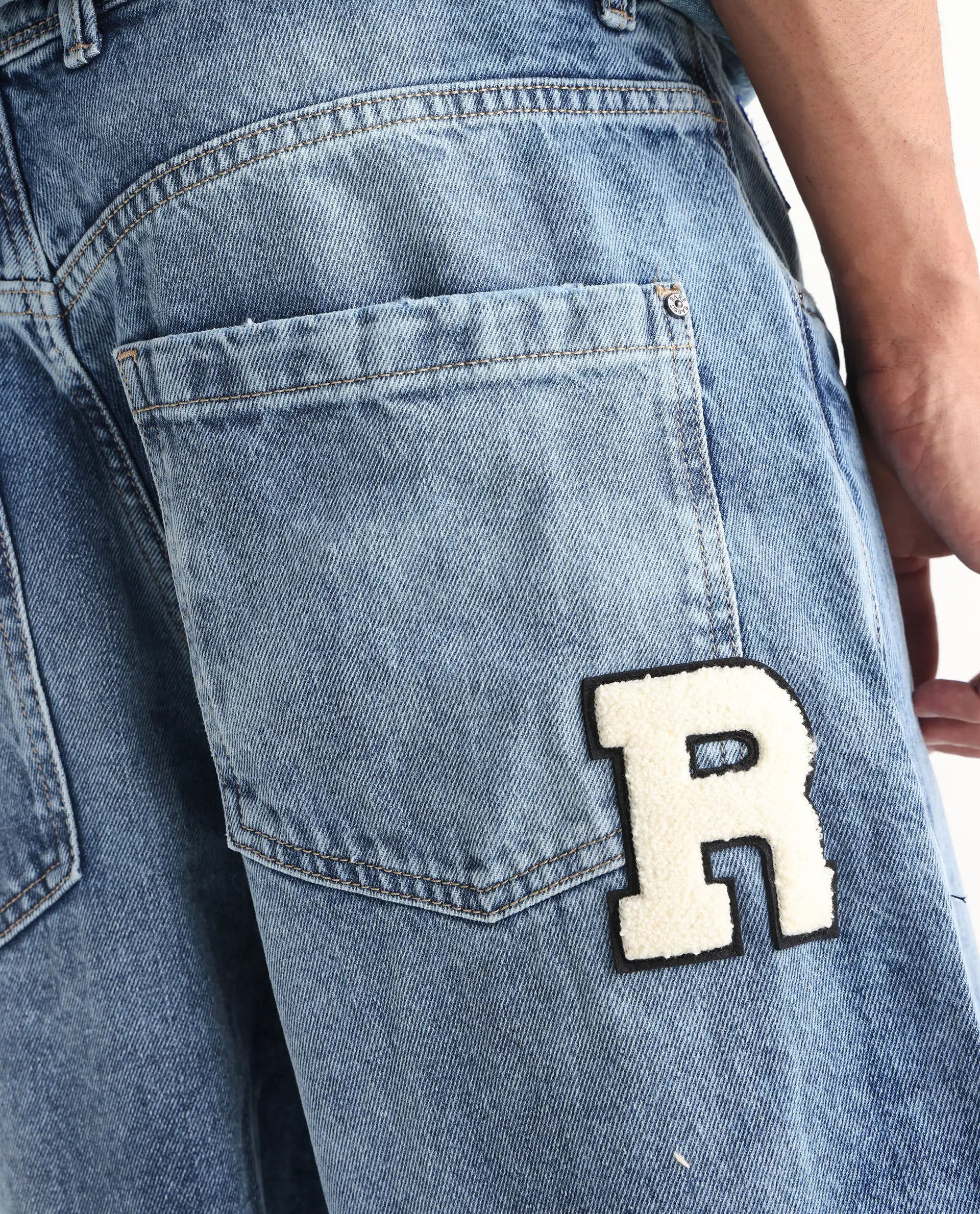 Rare Rabbit Men Riffin Light Blue Cotton Fabric Button And Zip Closure Baggy Fit Embroidered Logo Plain Jeans