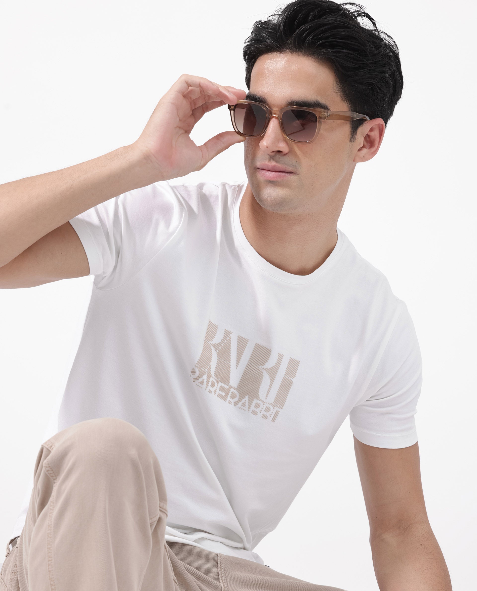 Rare Rabbit Mens Luno White Cotton Blrend Fabric Half Sleeve Graphic Printed T-Shirt