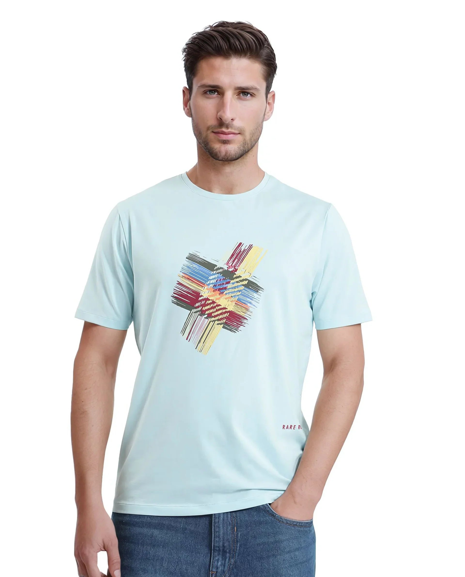 Rare Rabbit Men Brax Light Blue Cotton Blend Fabric Short Sleeve Crew Neck Graphic Print T-Shirt