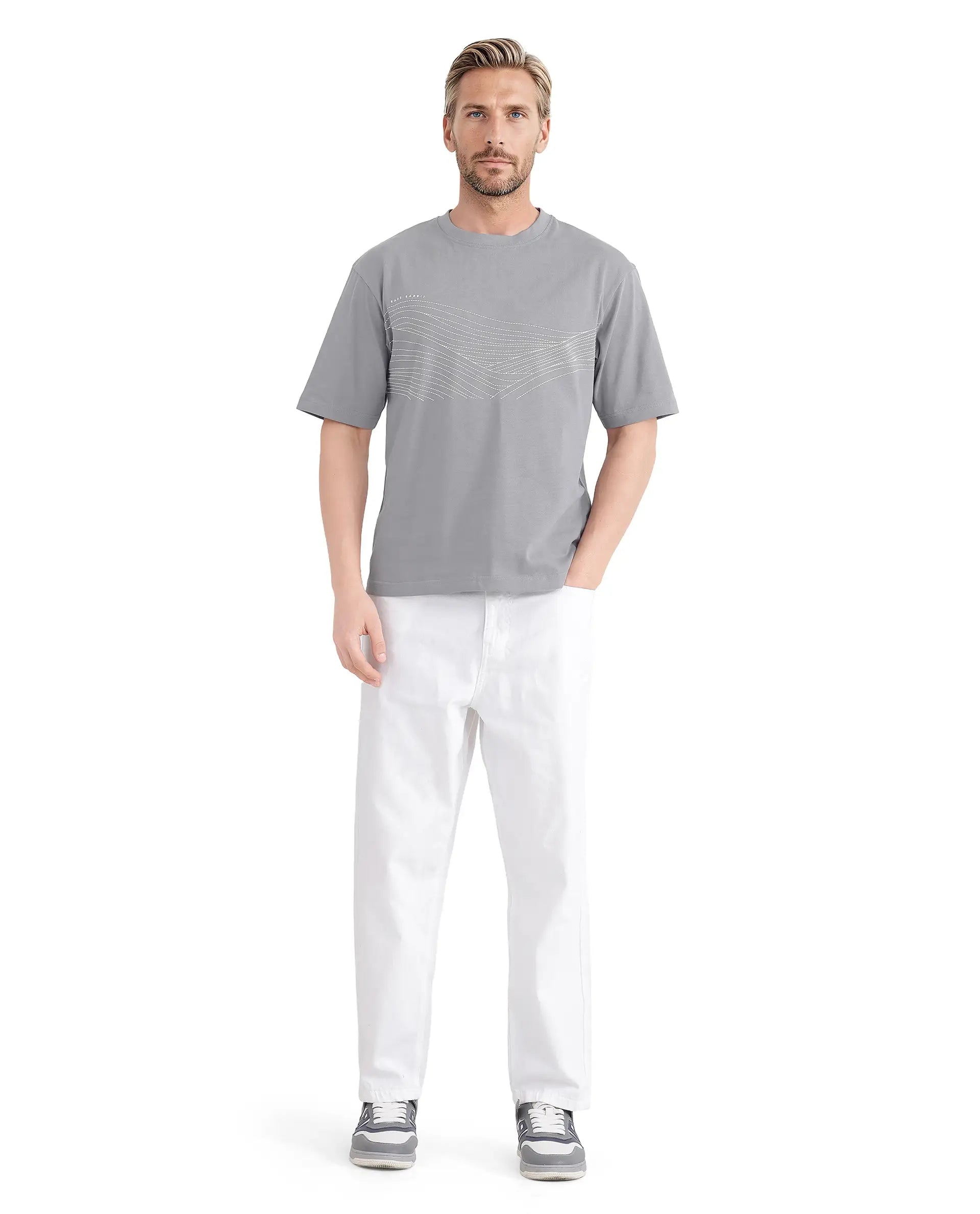 Upgrade your casual wardrobe with our light grey graphic print t-shirt, designed for modern men who value style and comfort. This crew neck, half-sleeve tee features a unique slip-on closure and is crafted from premium cotton fabric, ensuring a soft and breathable fit. The QLO fit enhances your silhouette, making it perfect for everyday wear. Ideal for those seeking a versatile piece, this t-shirt pairs effortlessly with jeans or shorts. Embrace the latest fashion trends with this must-have graphic print t-shirt, perfect for any casual occasion. Elevate your style game today with this essential wardrobe staple.