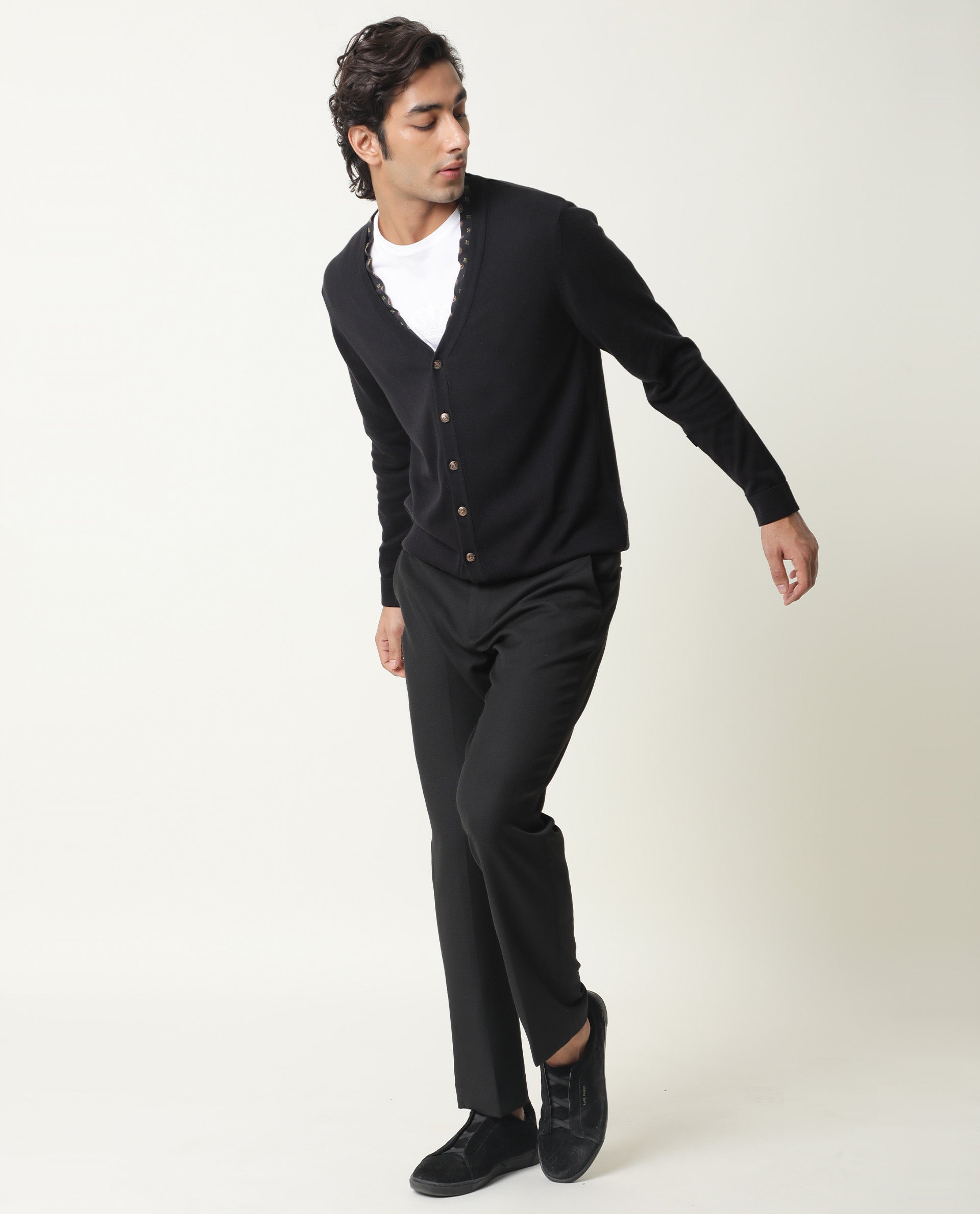 - Loose Fit V neck cardigan with premium printed fabric outer detail.