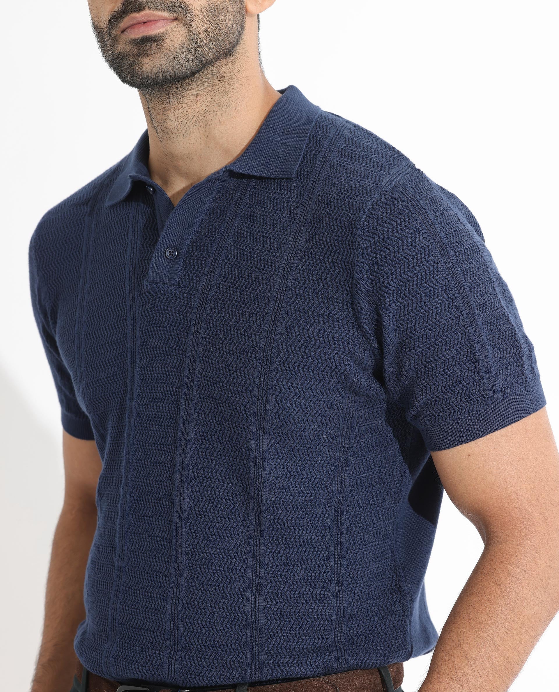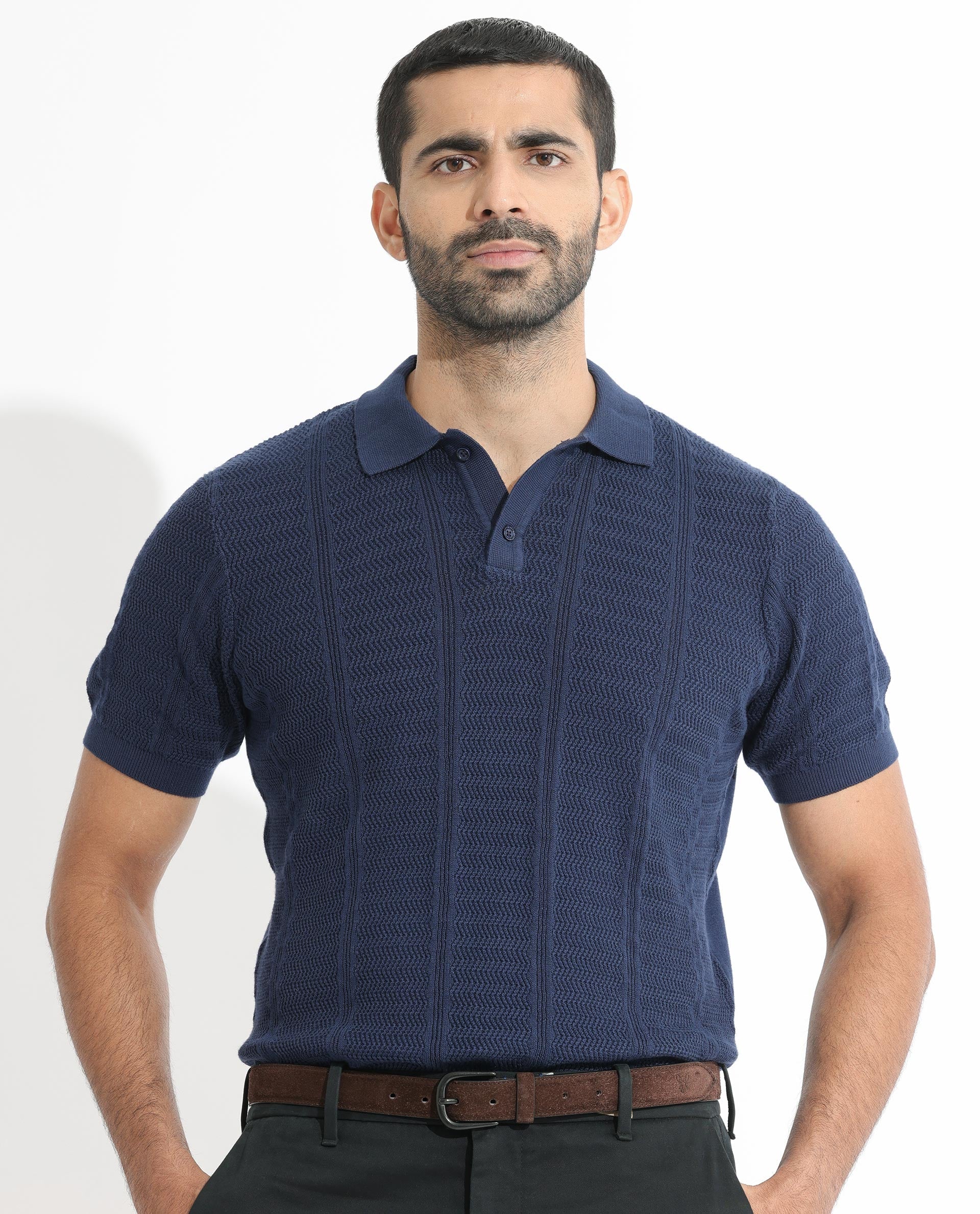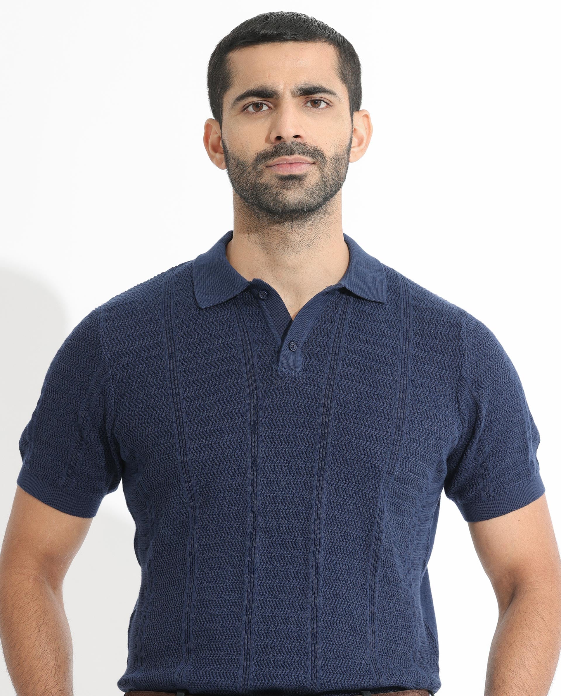 Rare Rabbit Men's Mesk Dark Blue Collared Neck Half Sleeves Knitted Polo T-Shirt