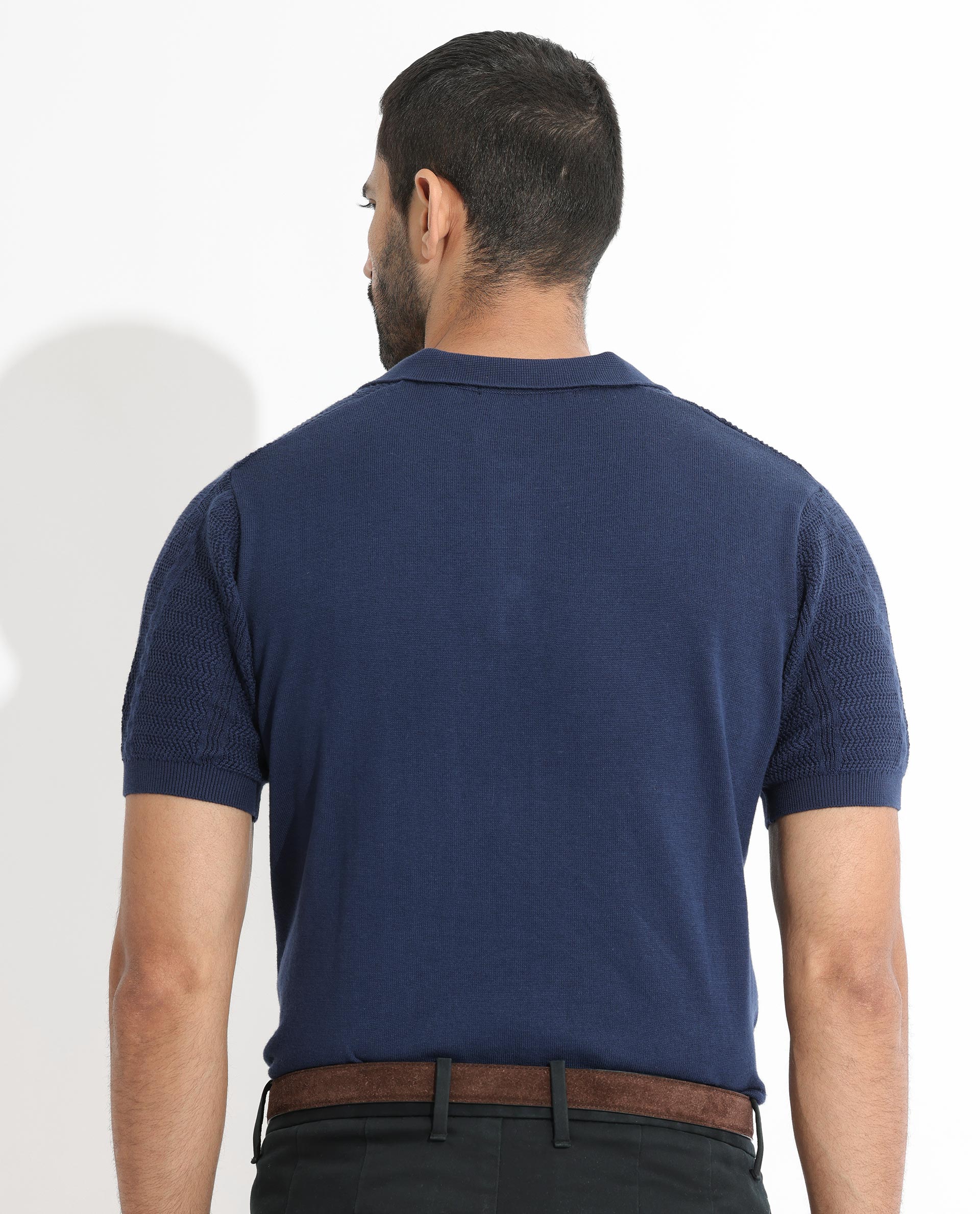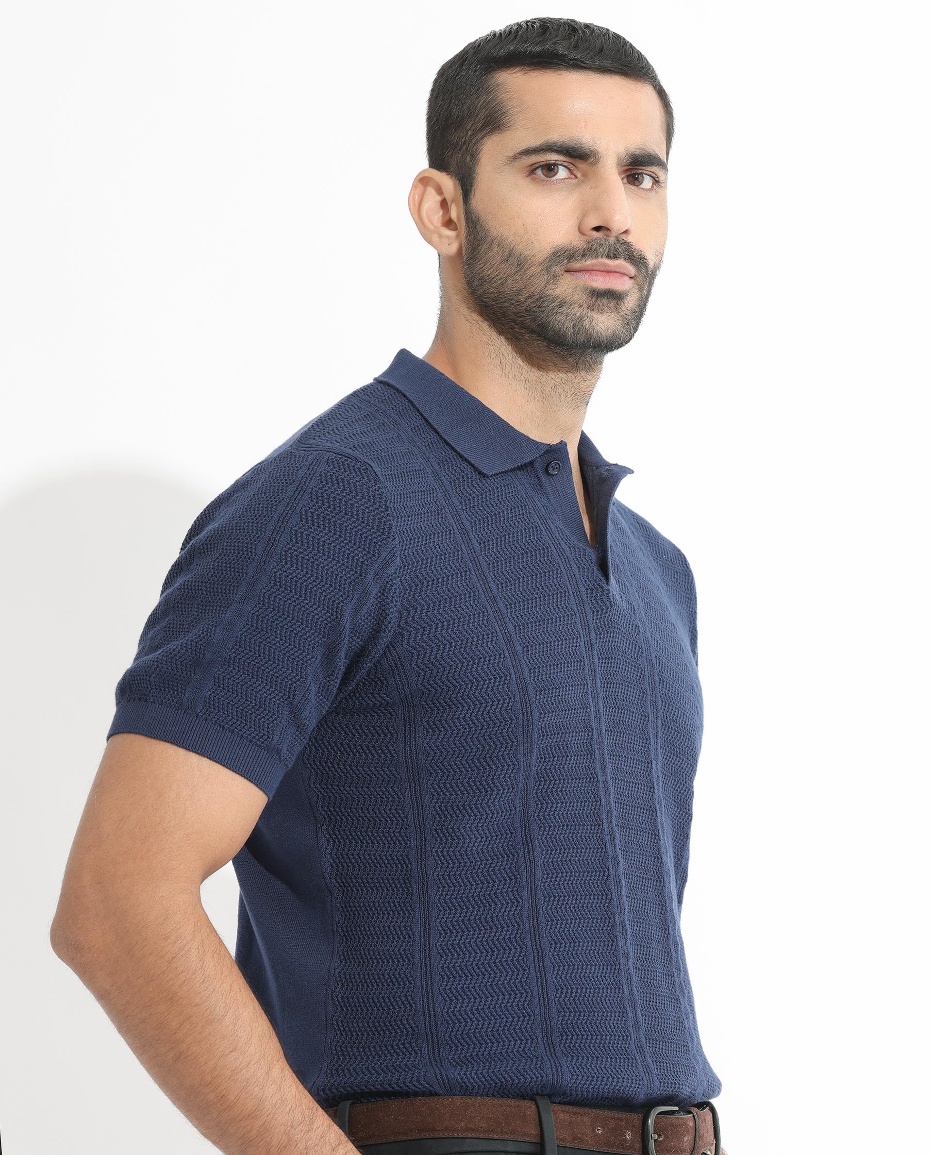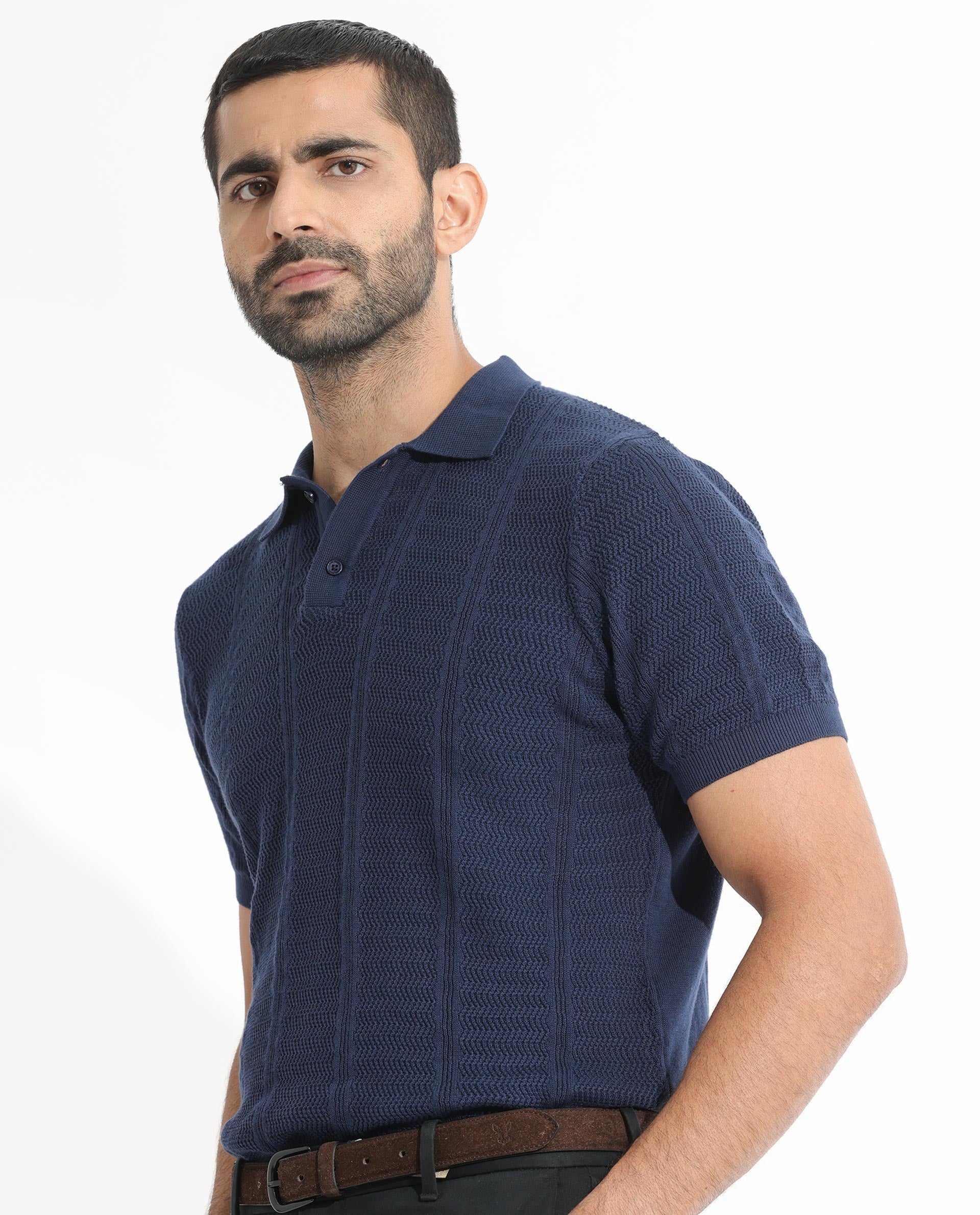 Rare Rabbit Men's Mesk Dark Blue Collared Neck Half Sleeves Knitted Polo T-Shirt