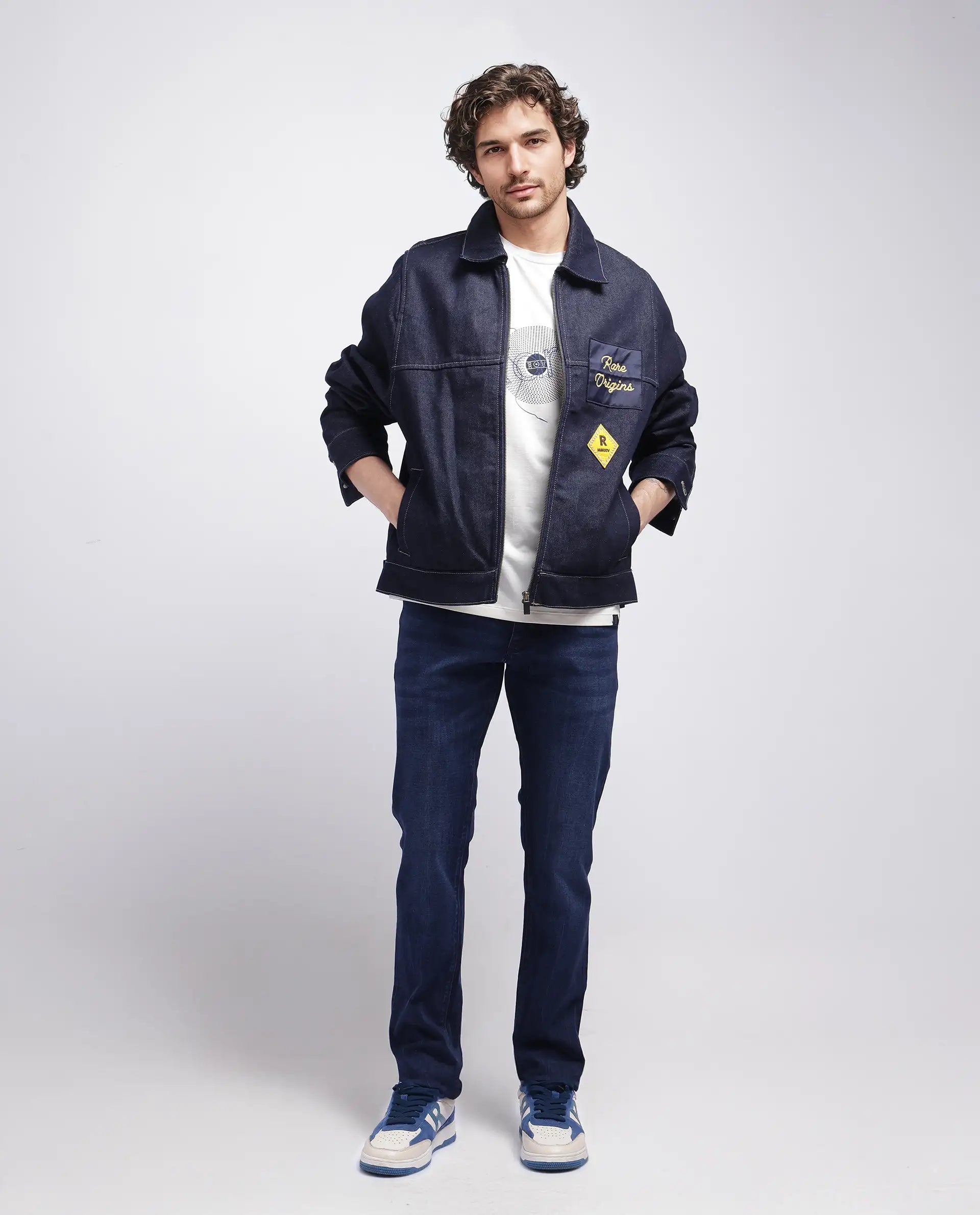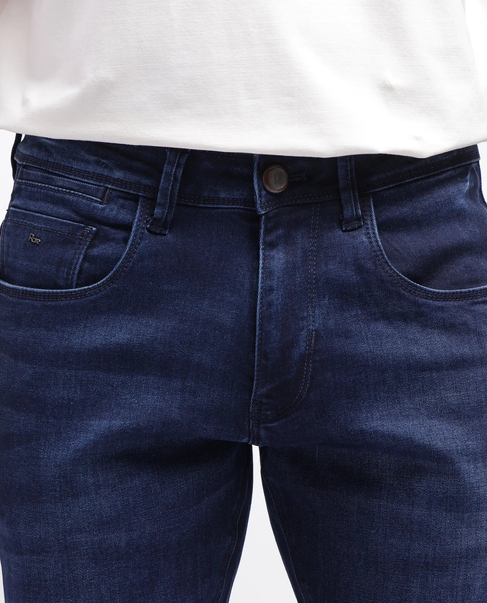 Rare Rabbit Men's Emil Dark Blue Cotton Polyester Fabric Zipper Closure Slim Fit Plain Jeans