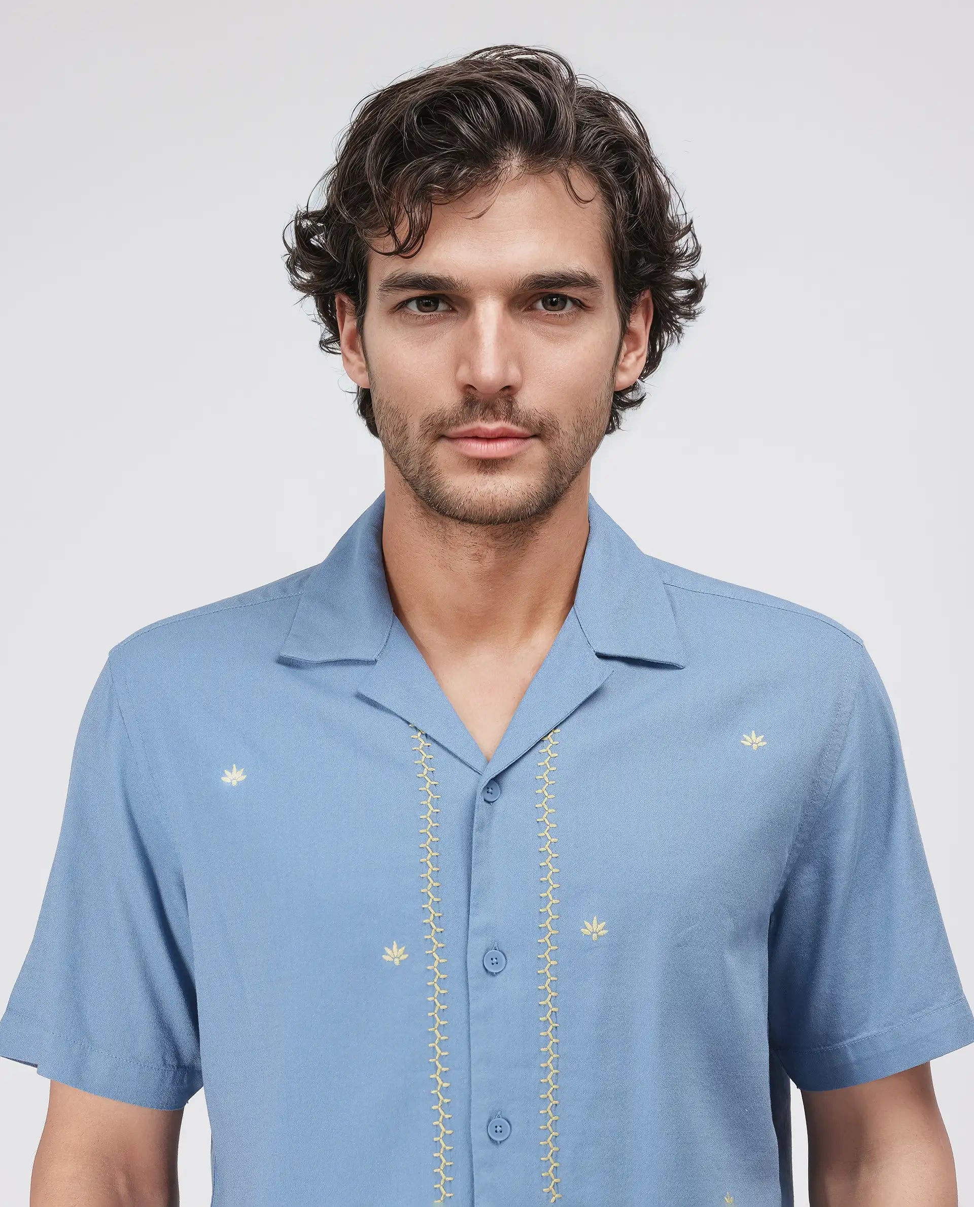 Rare Rabit Men's Tared Dusky Blue Cuban Collar Boxy Fit Embroidered Shirt
