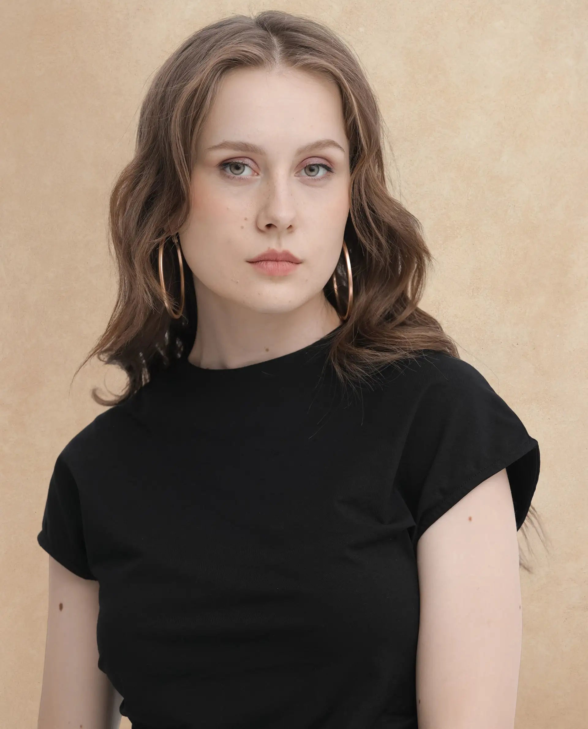 - The model (Bust-31, Waist-24, Hip-34, Height-5'8") is wearing XS
