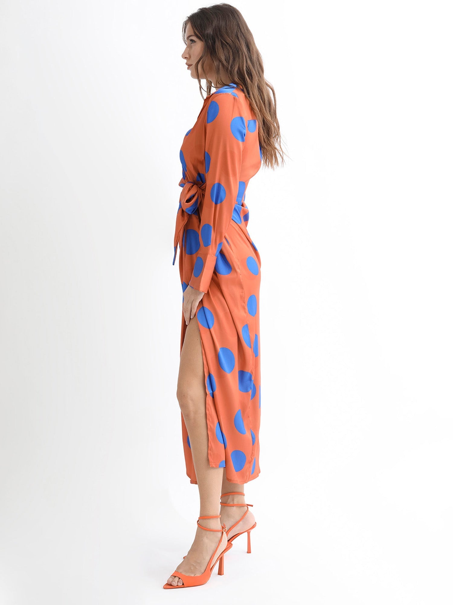 Rareism Women Farben Dark Orange Polyester Fabric Full Sleeves Tie-Up Closure Shirt Collar Regular Fit Polka Maxi Wrap Dress