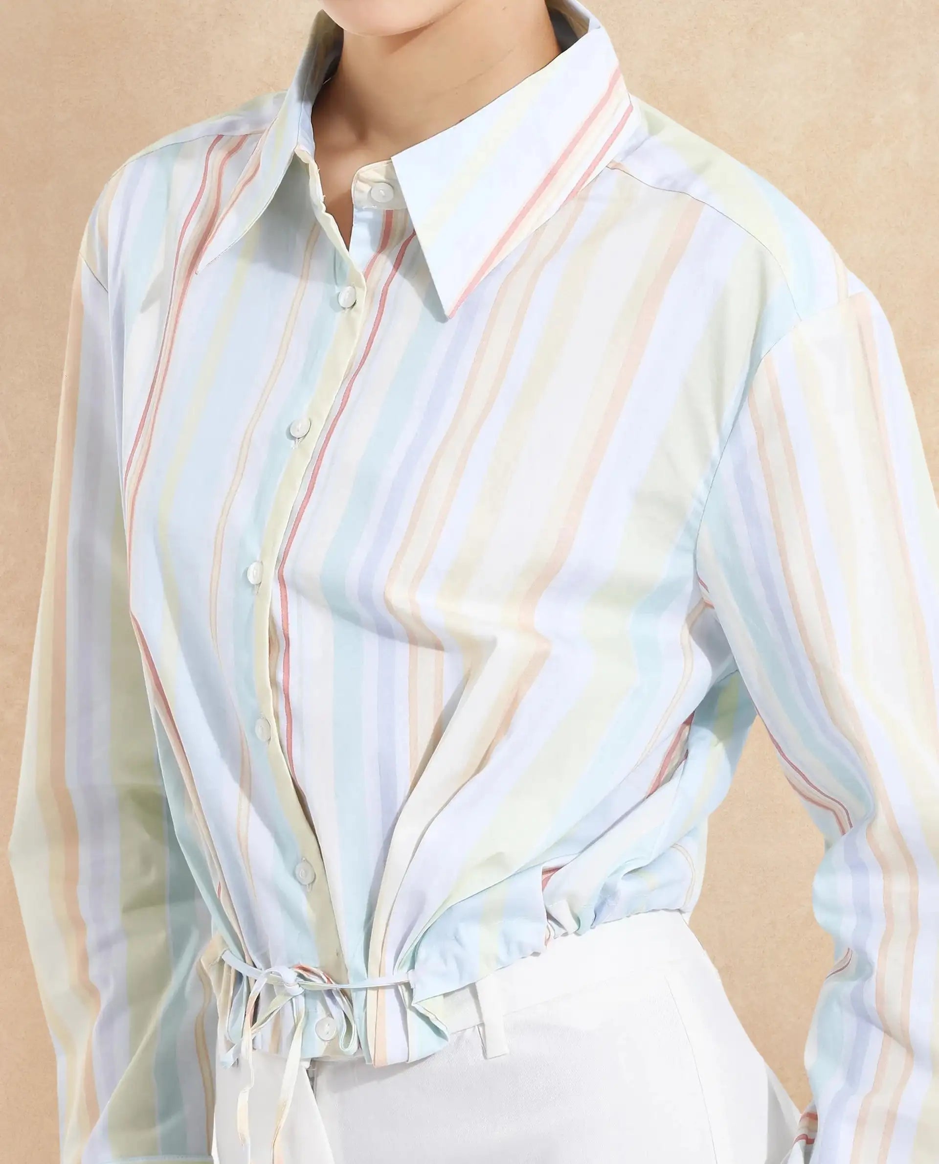 Rareism Women Kaylae Light Multi Cuffed Sleeve Collared Neck Button Closure Cropped Narrow Stripes Top
