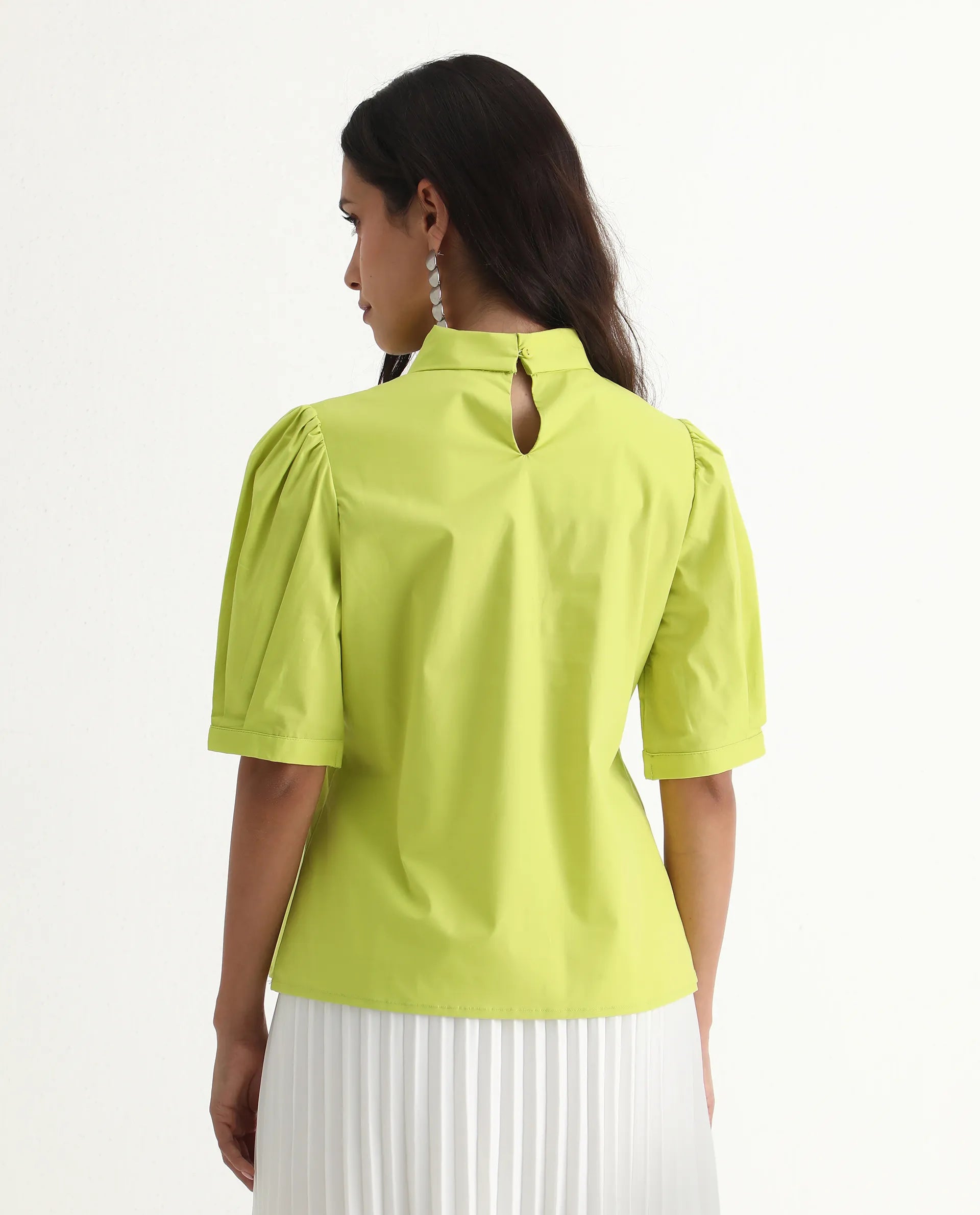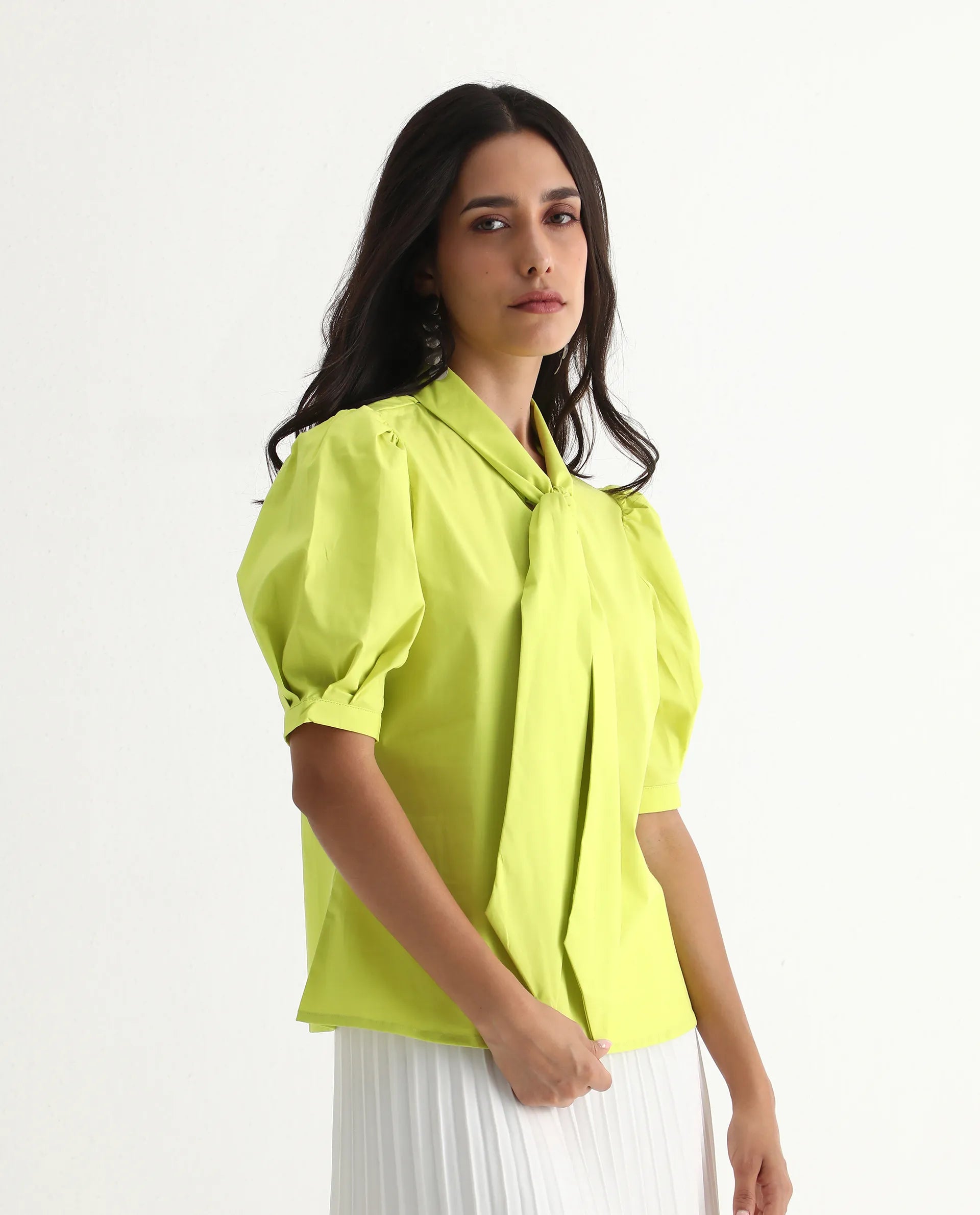 Rareism Women Kirv Green Cotton Blend Fabric Bishop Sleeve Tie Up Neck Button Closure Regular Fit Plain Top
