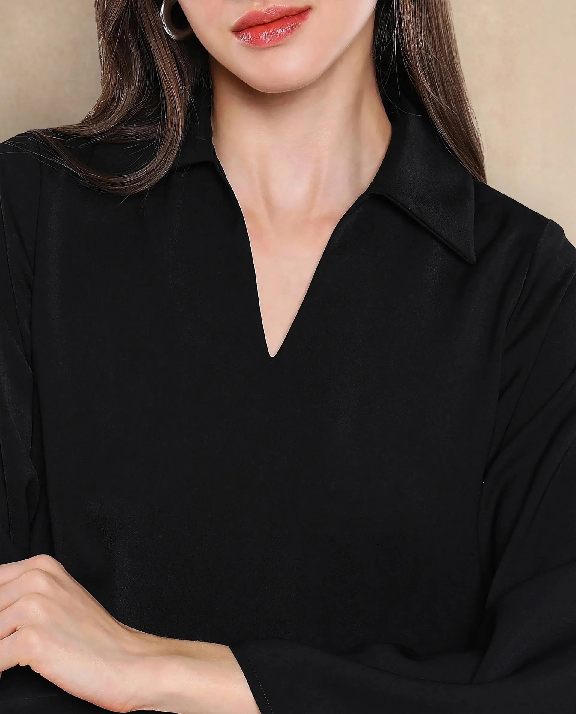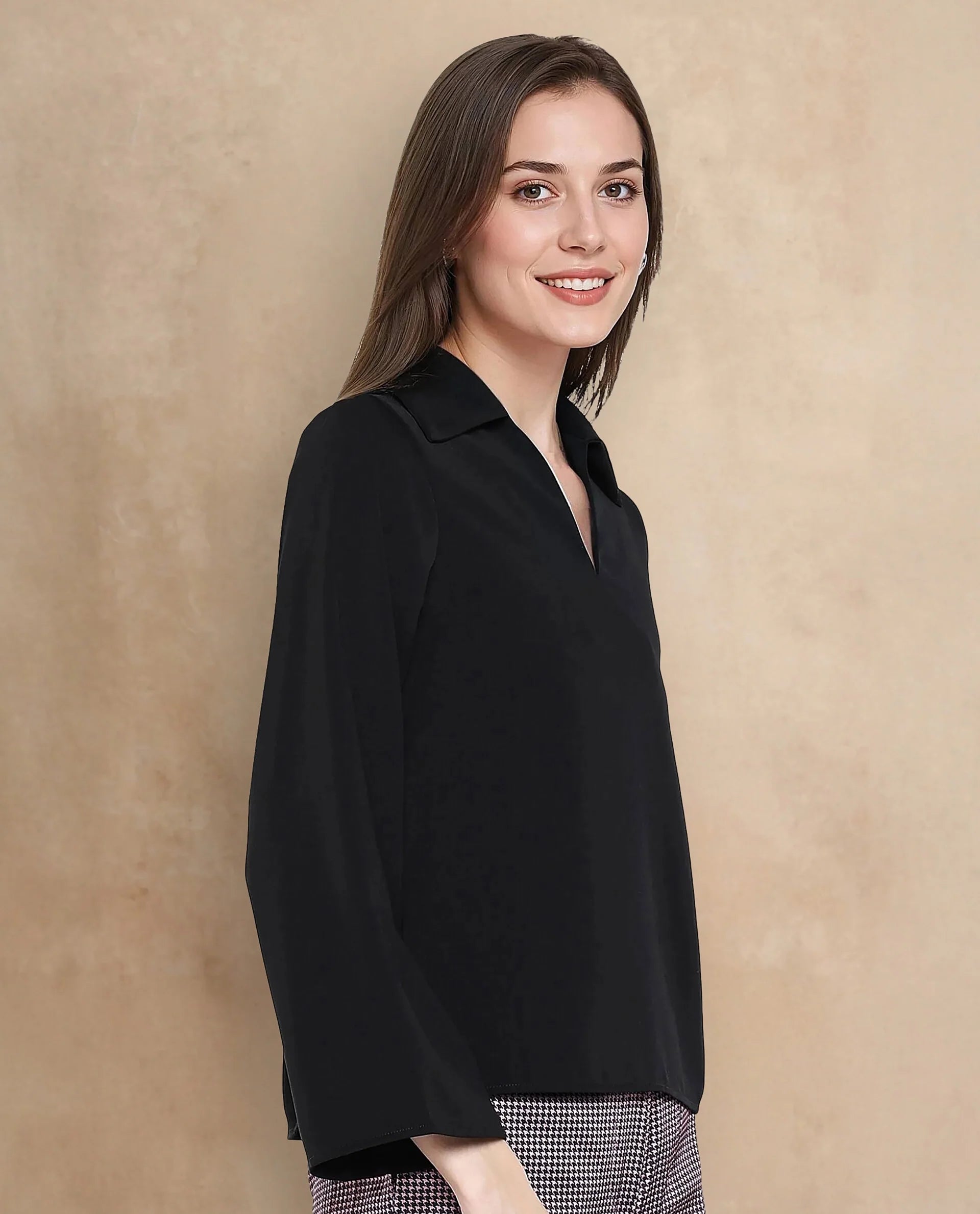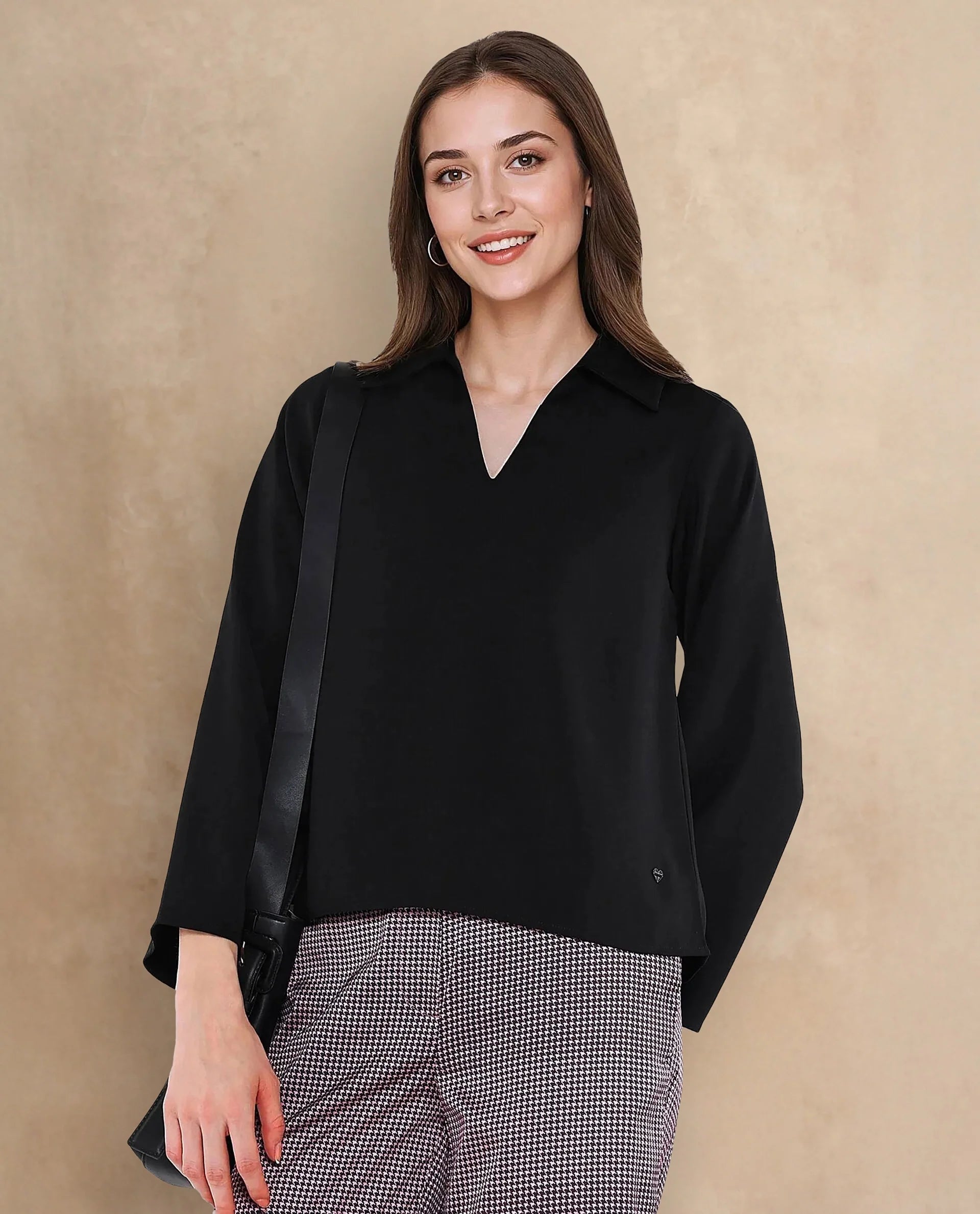 Rareism Women Klamma Black Satin Full Sleeve Jonny Collar Plain Top