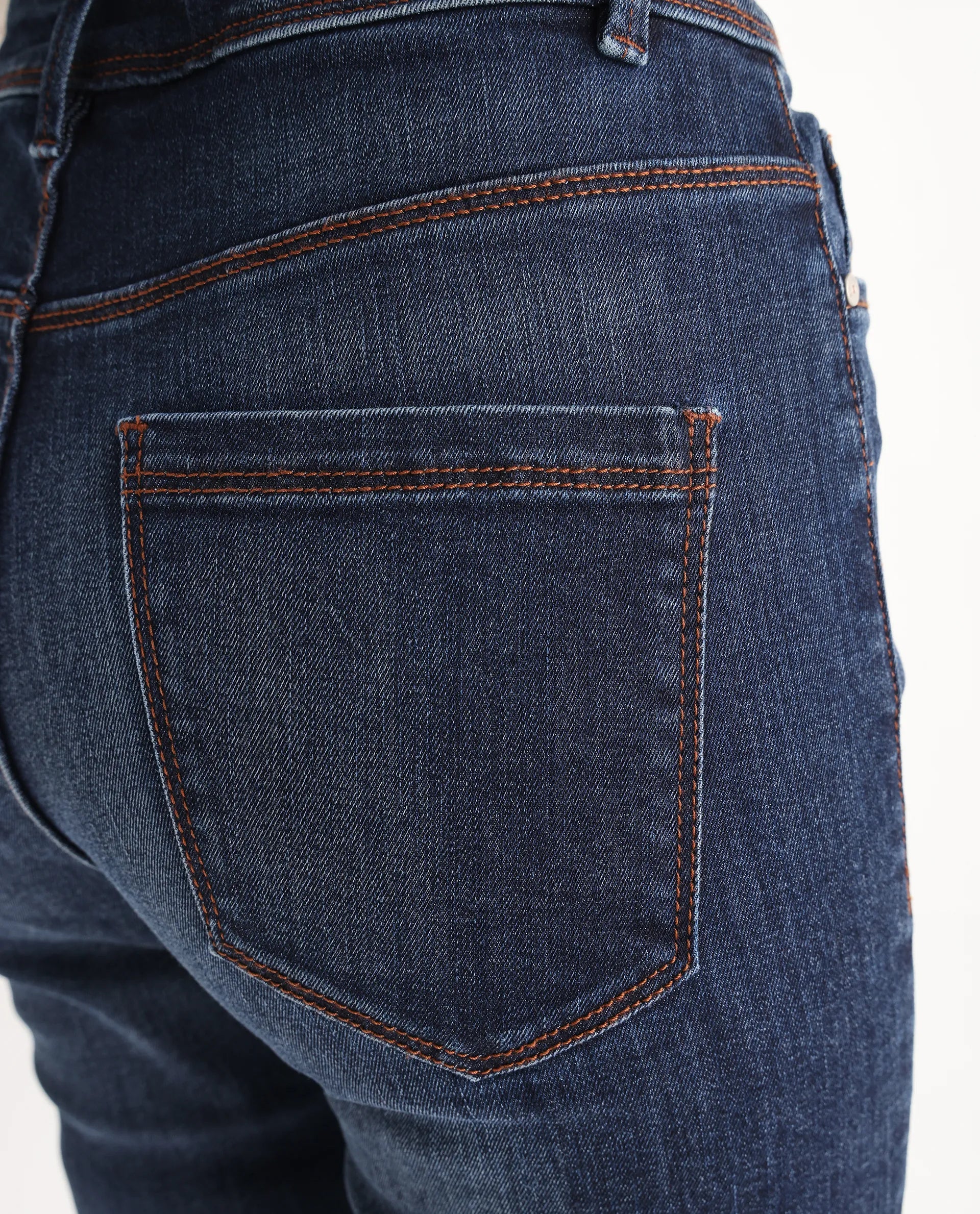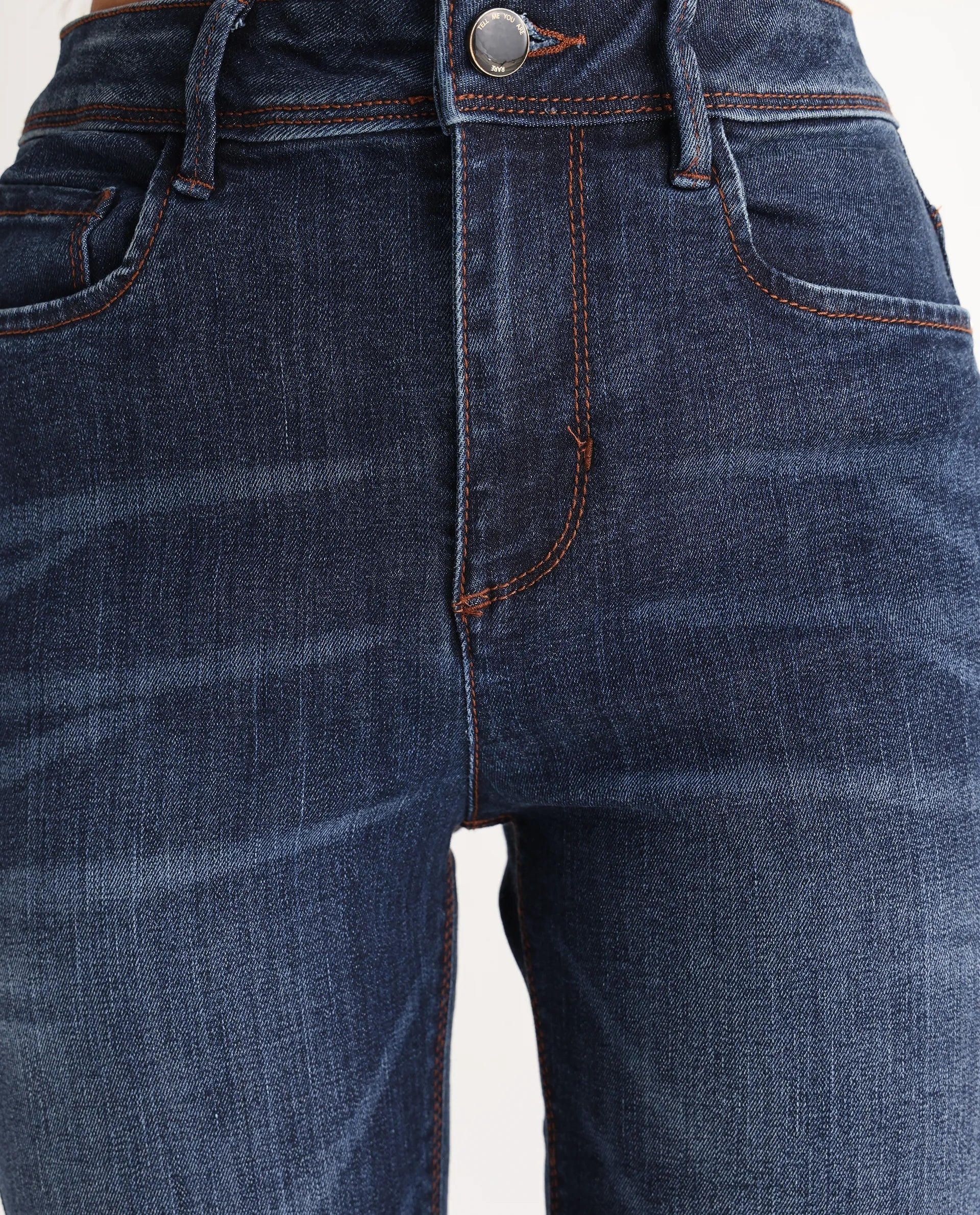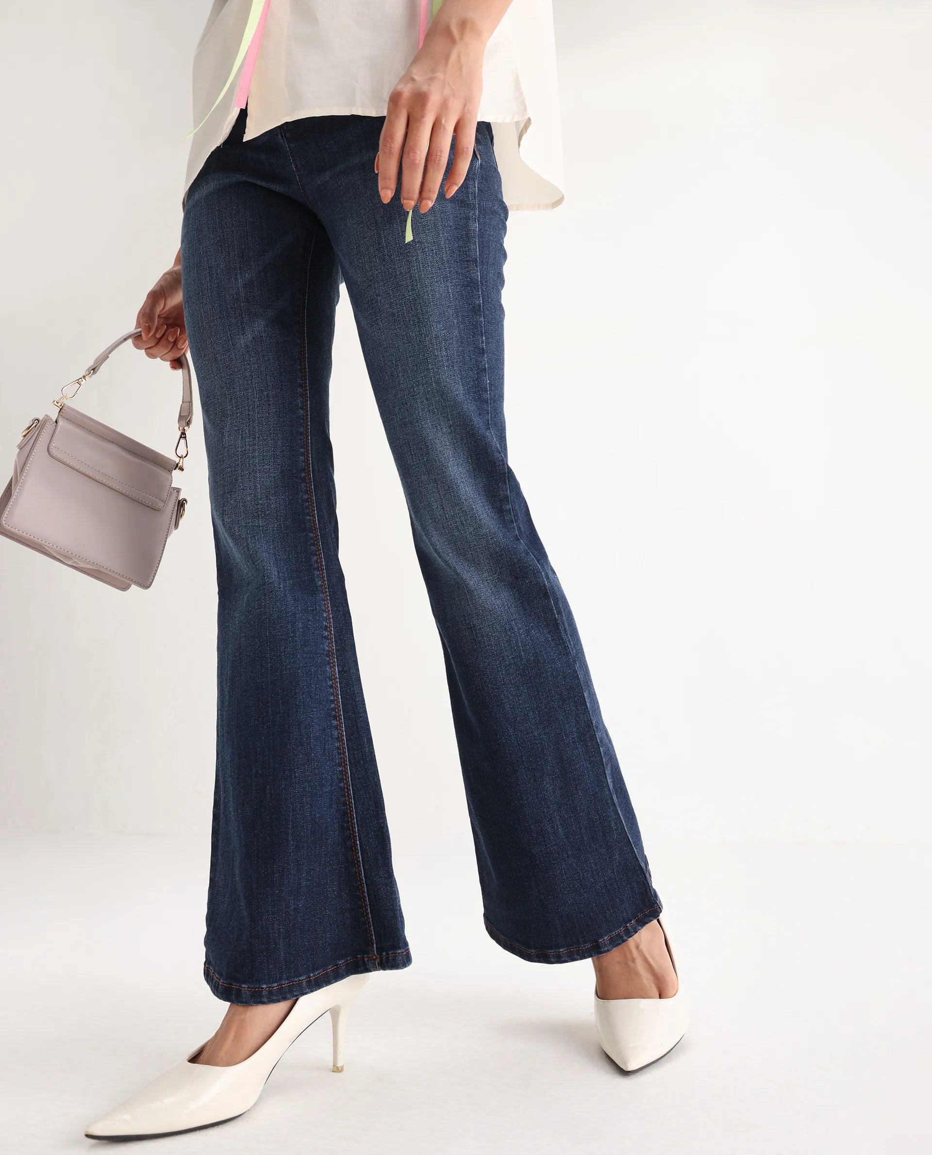 Rareism Women Grizzled Blue Cotton Lycra Fabric Mid Rise Solid Boot Cut Ankle Length Jeans