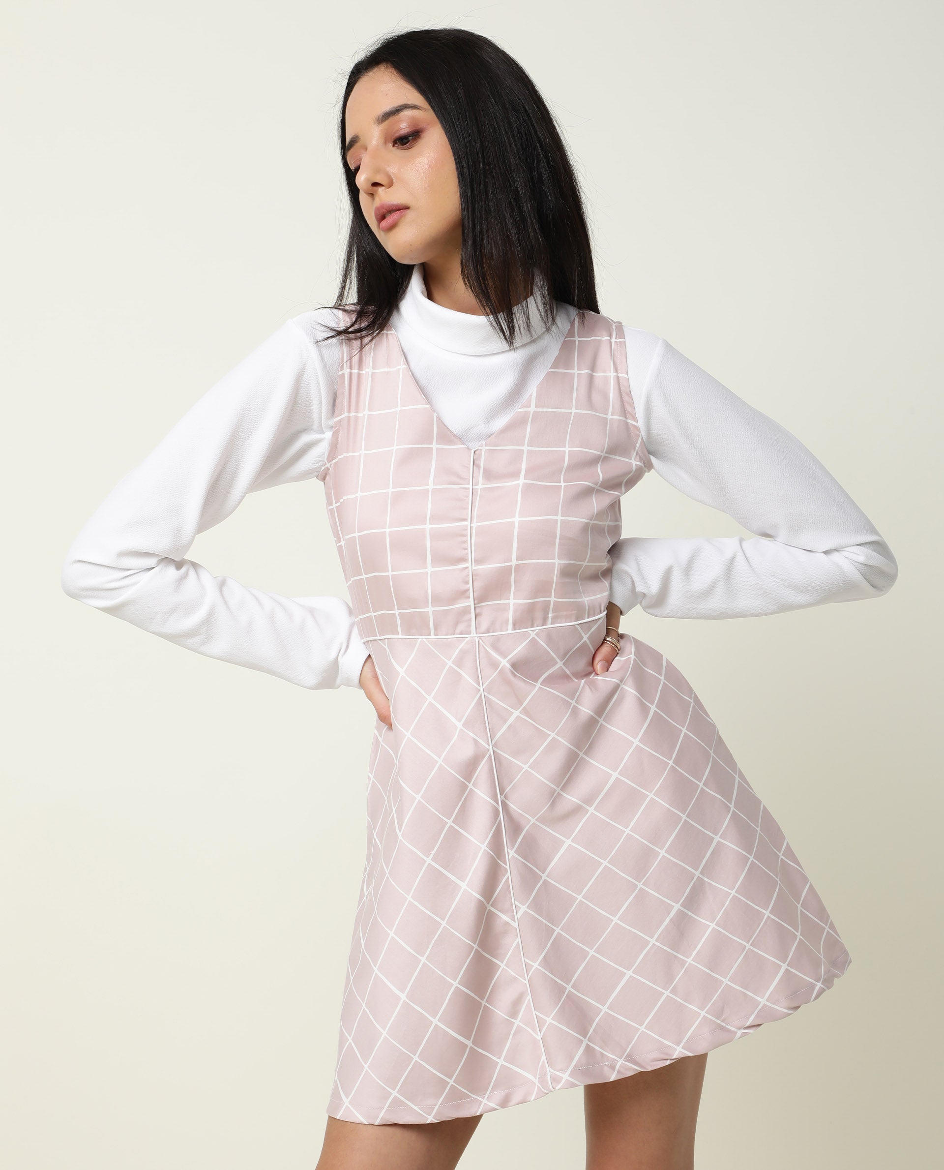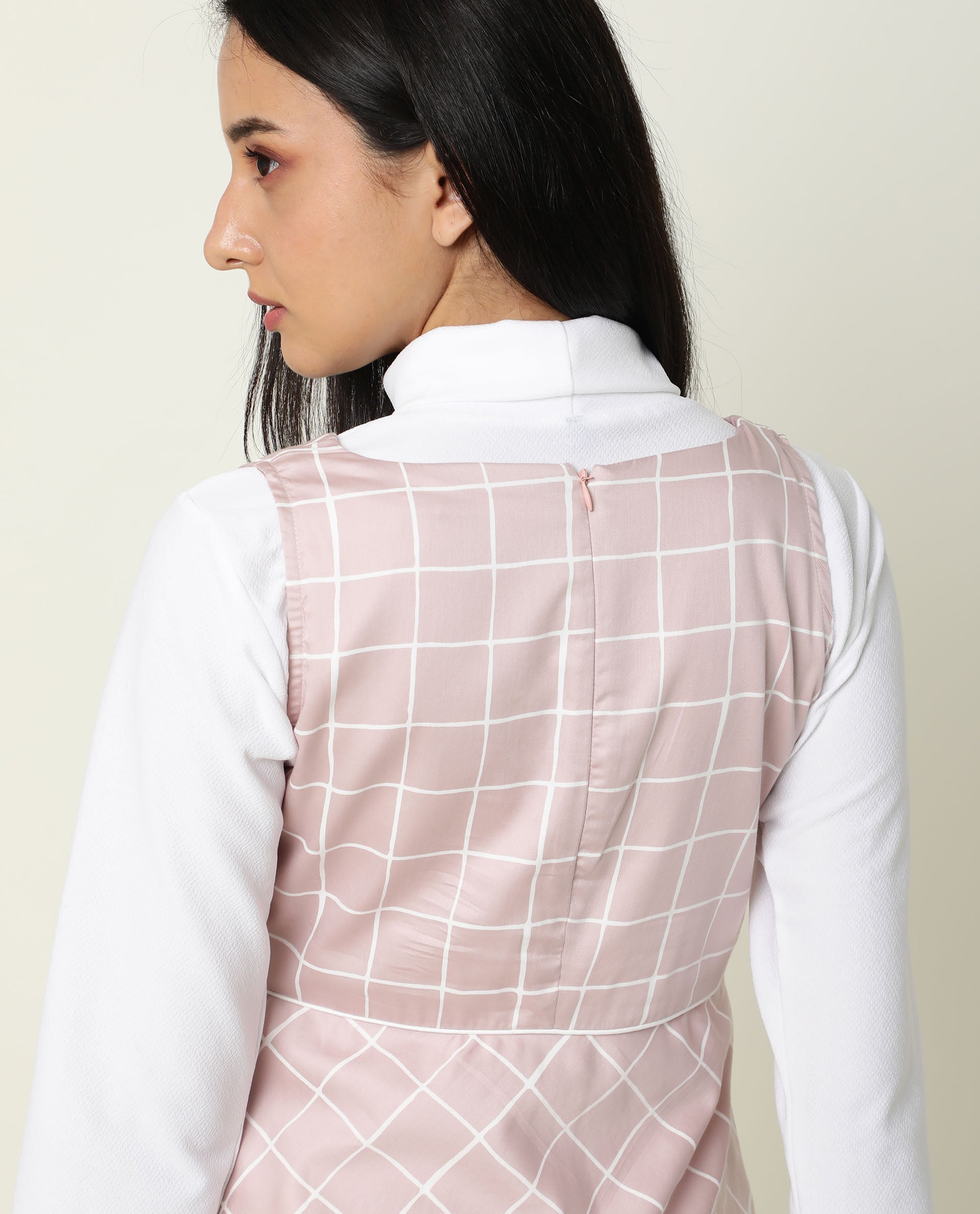 Rareism Women's Akal Pink Cotton Blend Fabric V-Neck Zipper Closure Sleeveless Checked Mini Dress