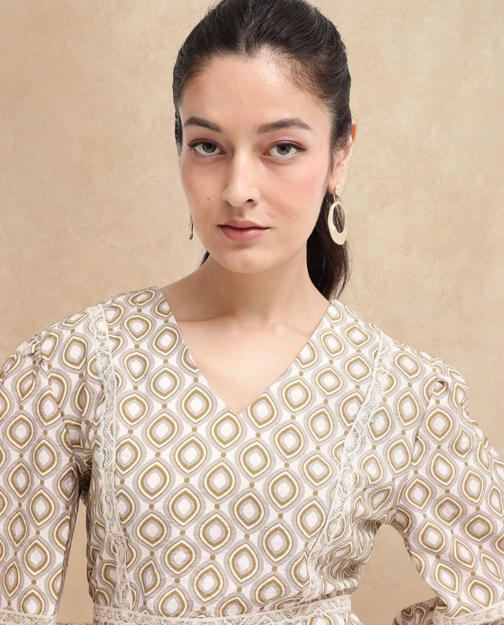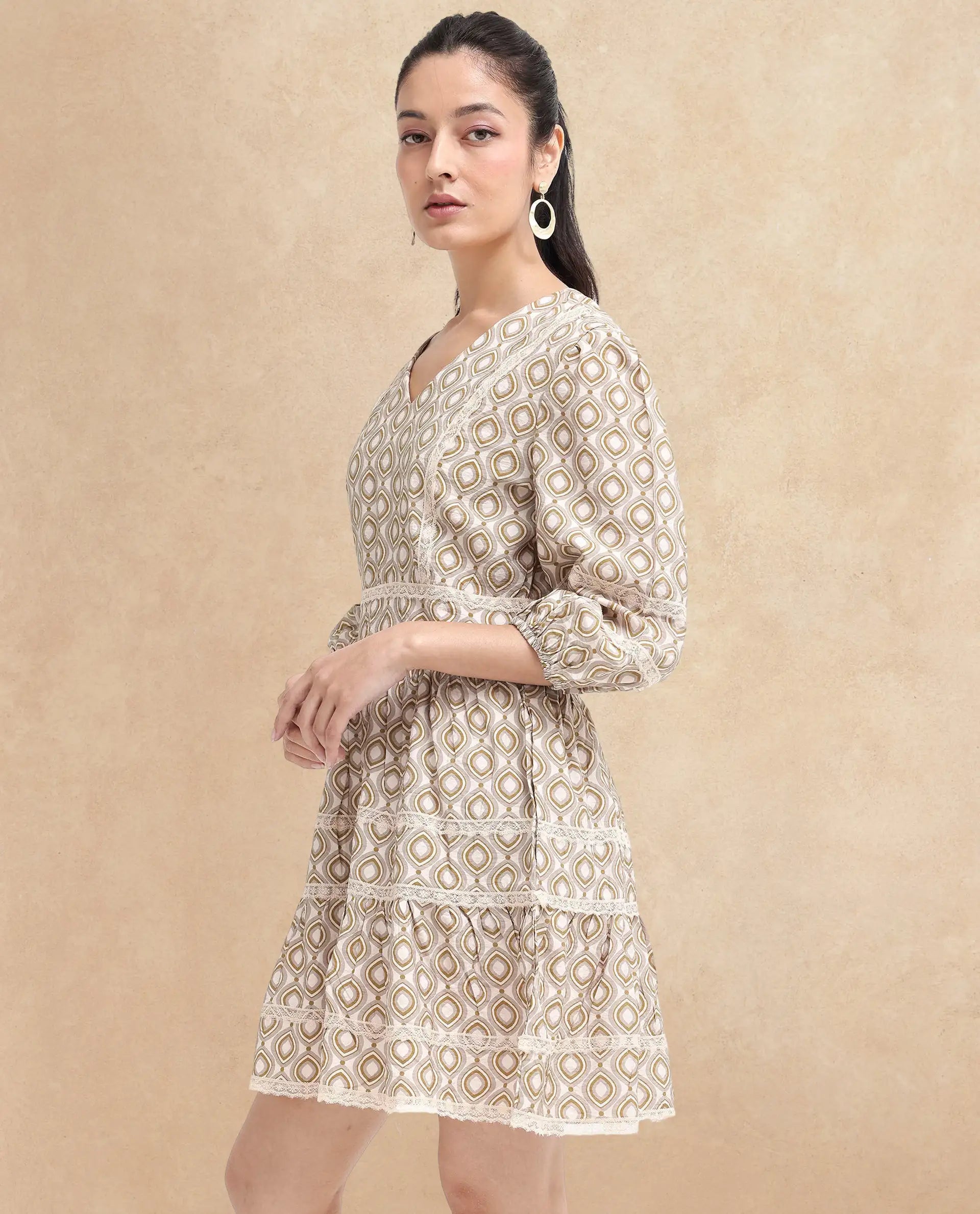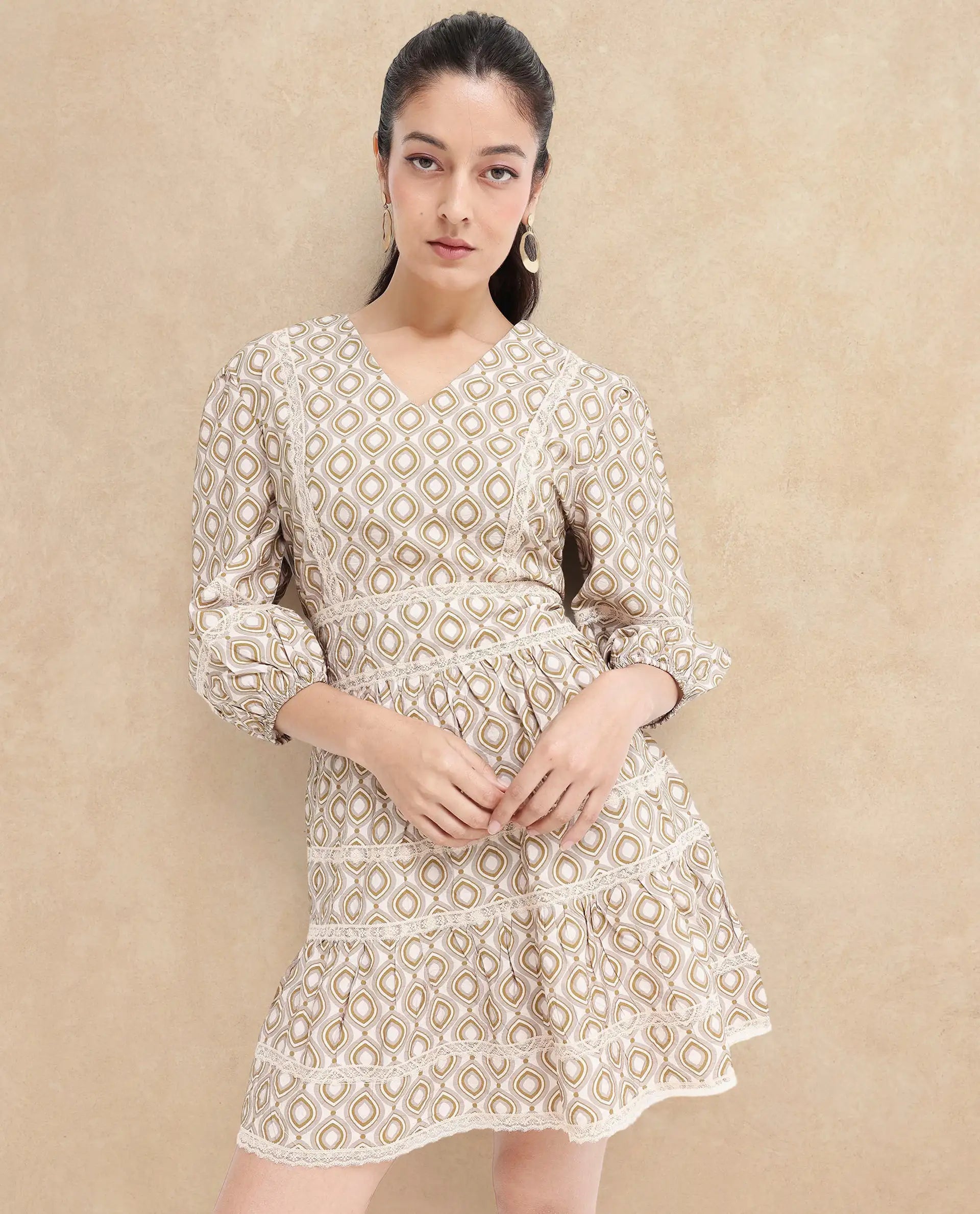 Rareism Women Alexo Beige Puff Sleeves V-Neck Zipper Closure Fit And Flare Geometric Print Fit and Flare Mini Dress