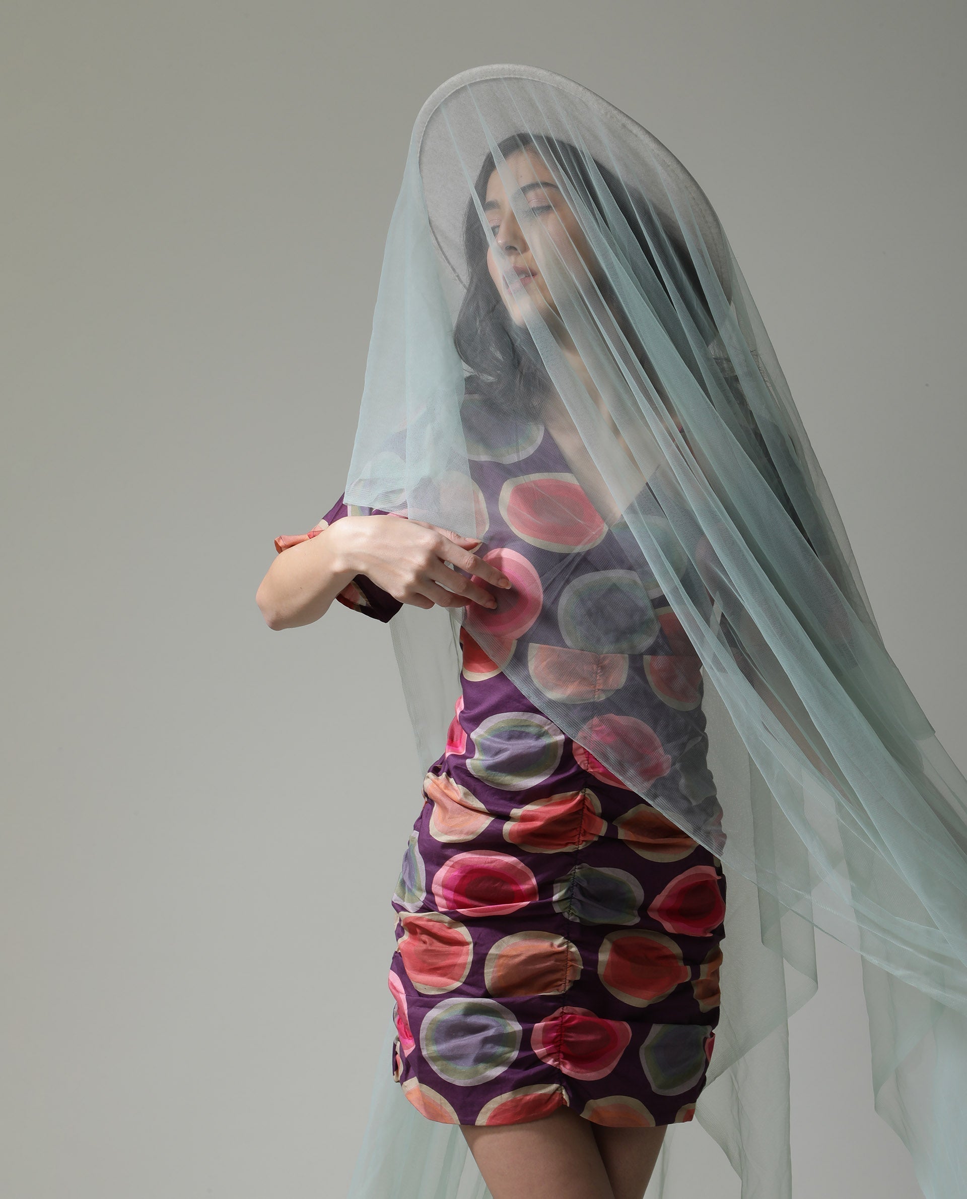 FITTED RUCHED STRETCH ABSTRACT PRINT DRESS