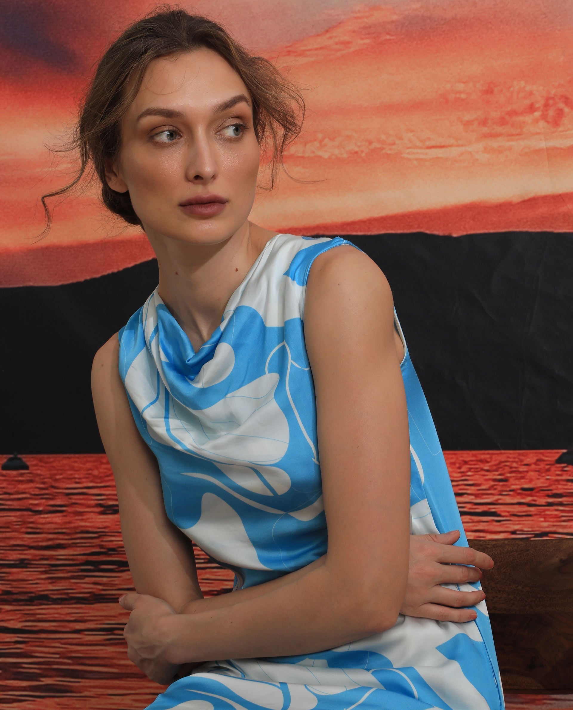 1. Stay chic in this sleeveless satin dress adorned with an abstract print.