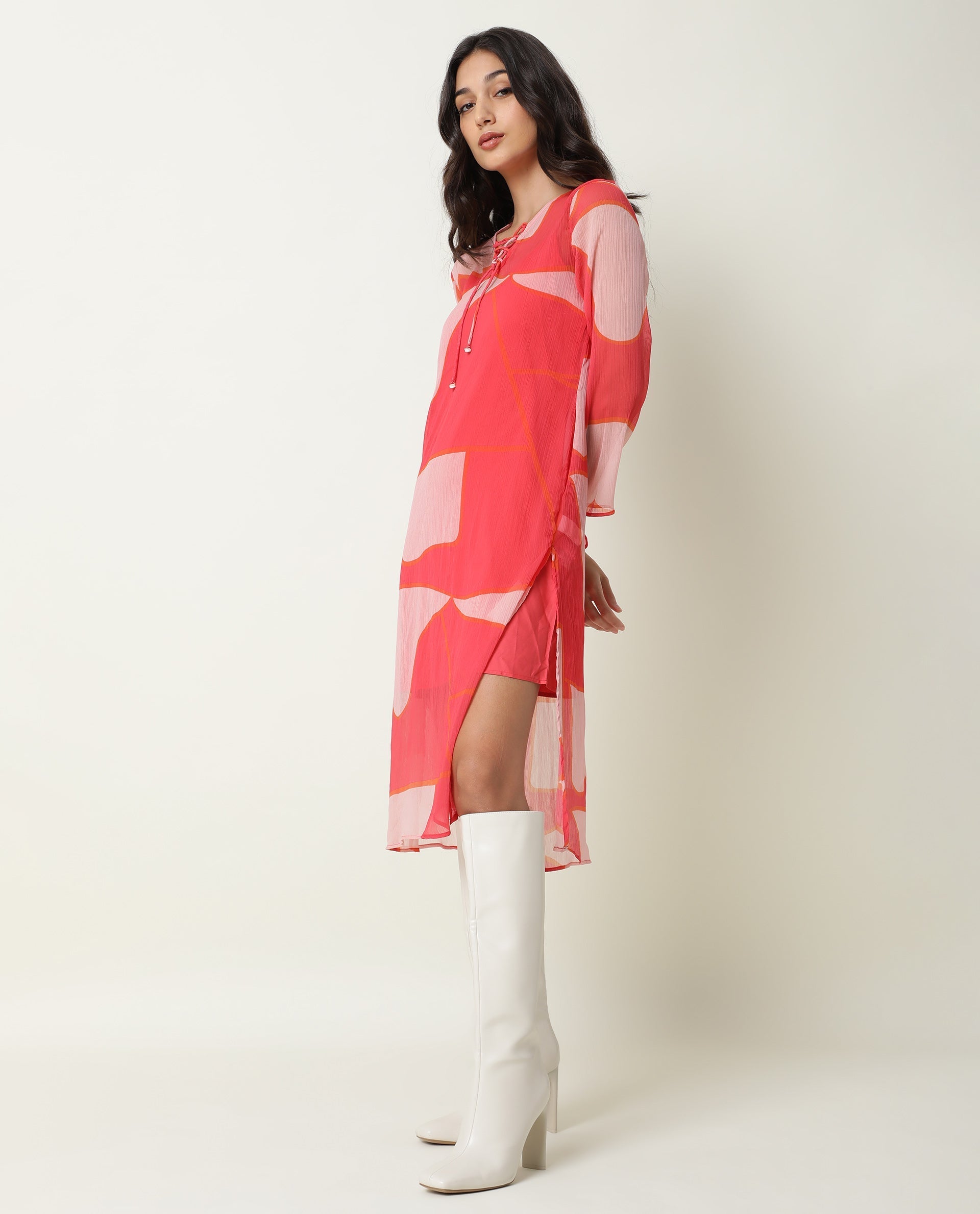 Rareism Women Benett Pink Abstract V Neck With Criss Cross Tie Up Full Sleeves Midi Dress