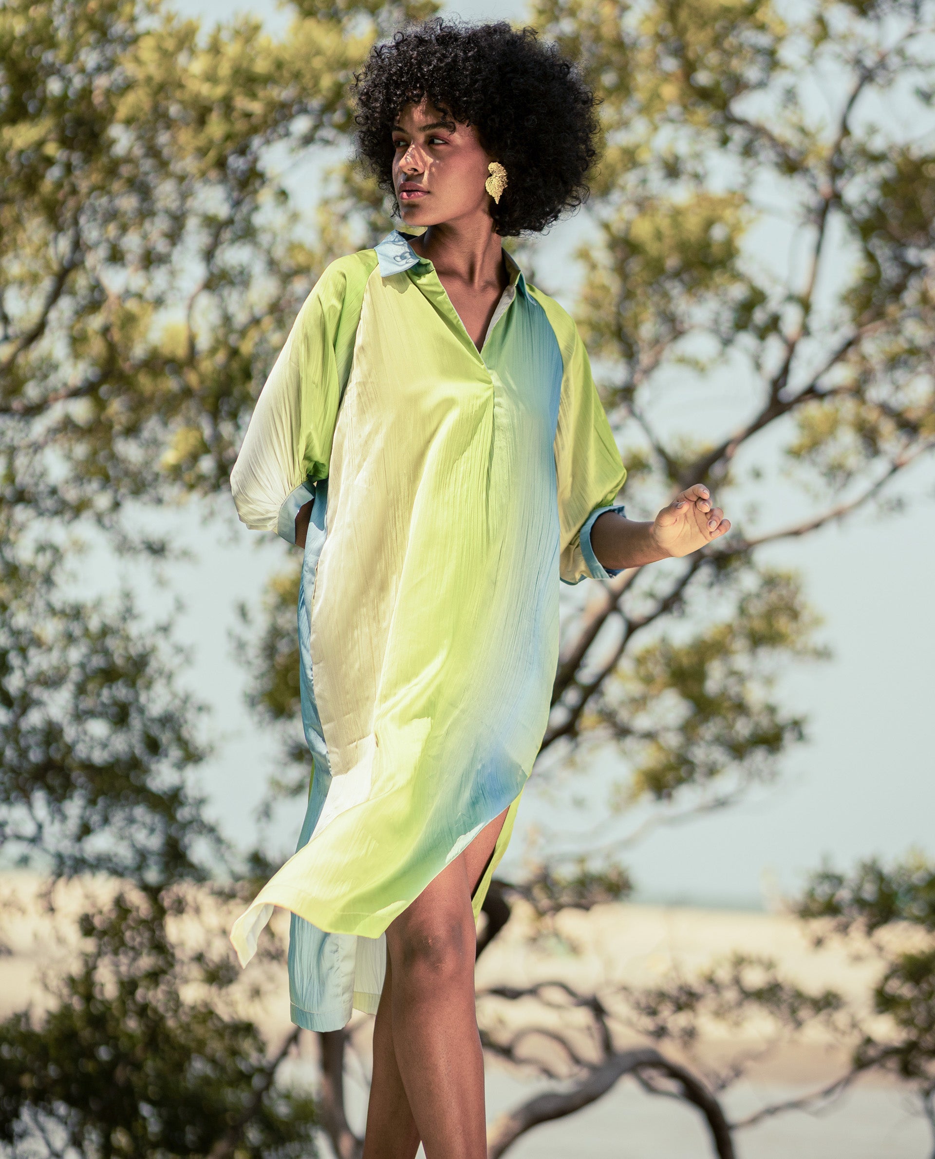 Rareism Women Boris Multi Polyester Fabric Cap Sleeve Collared Neck Ombre Longline Dress