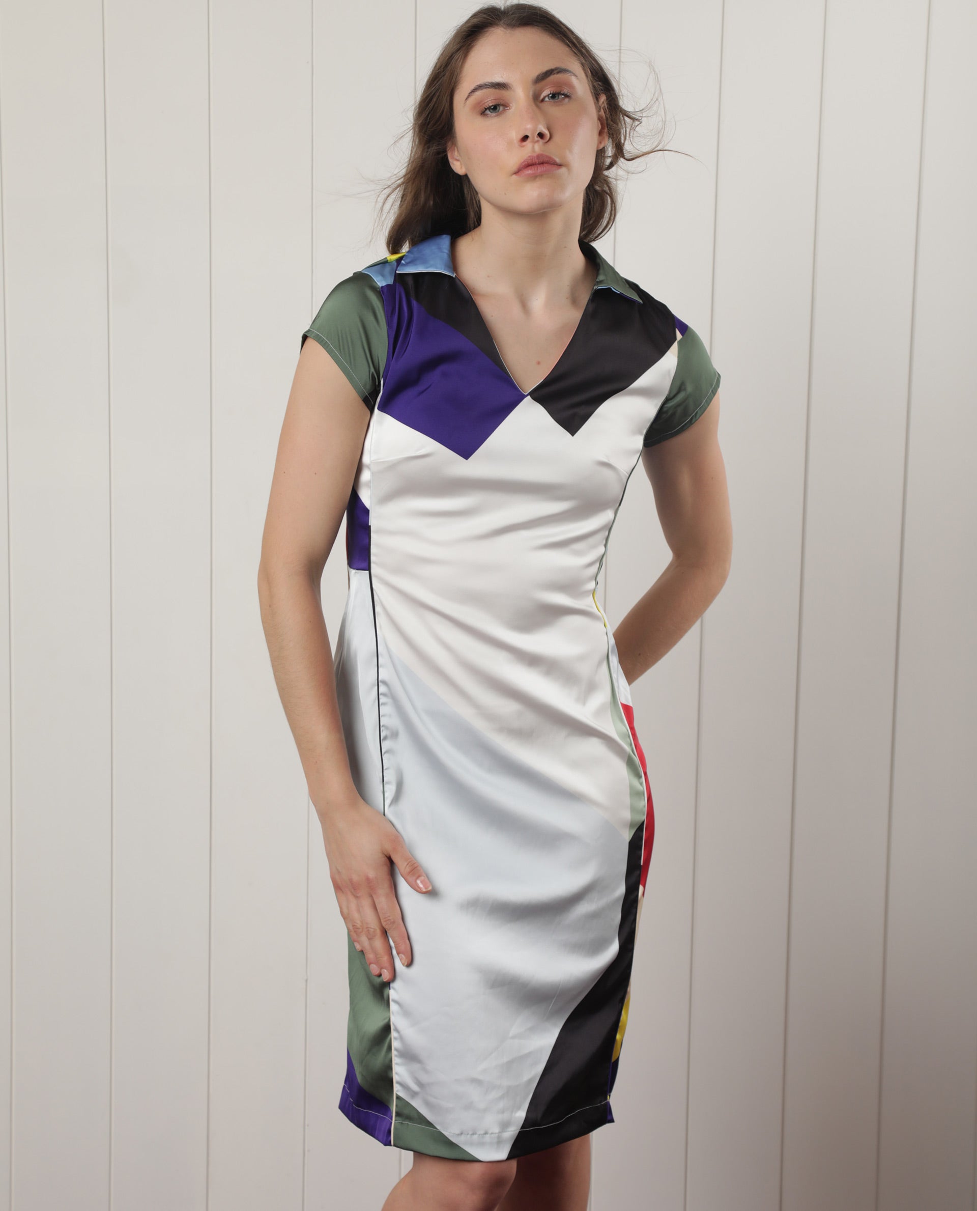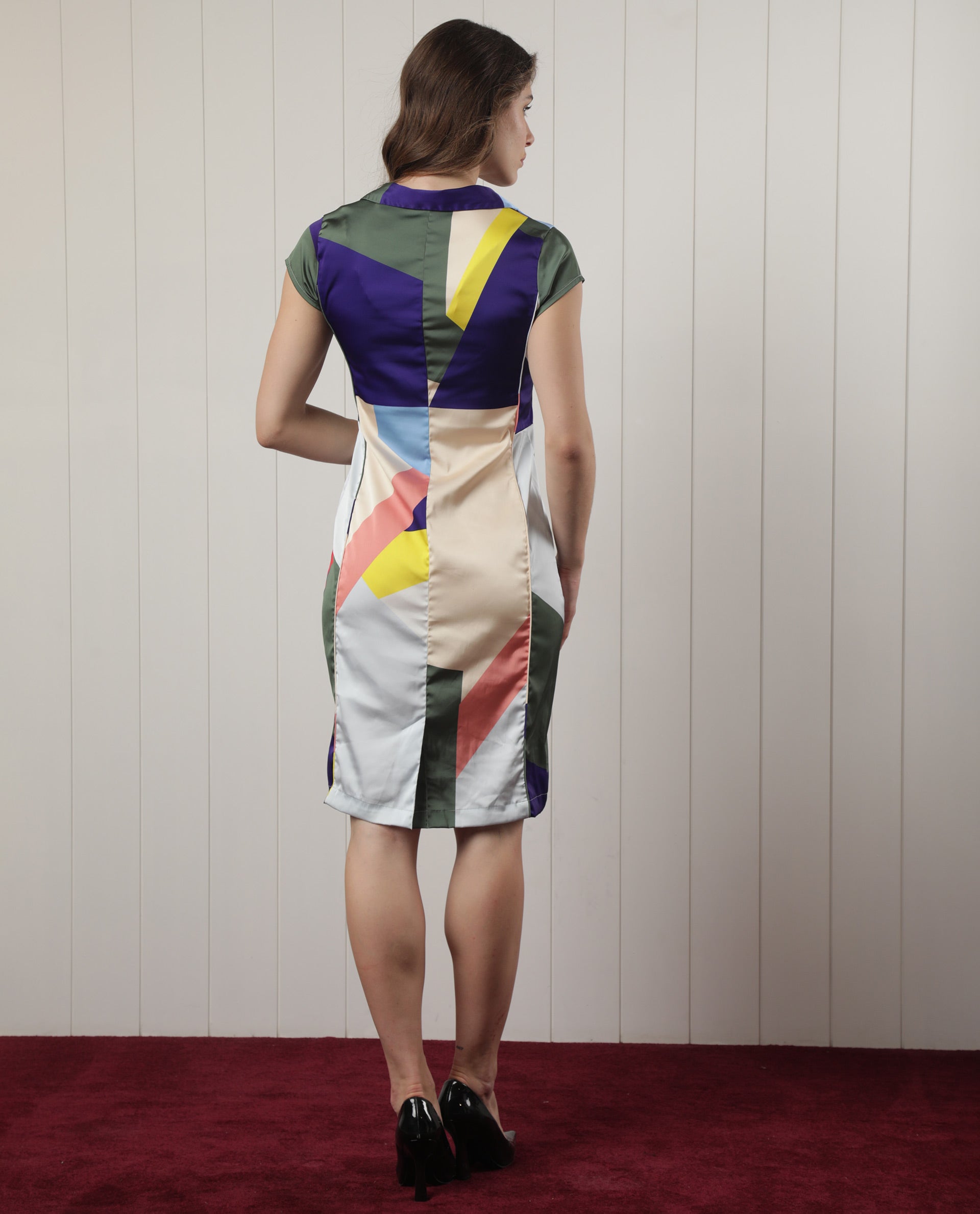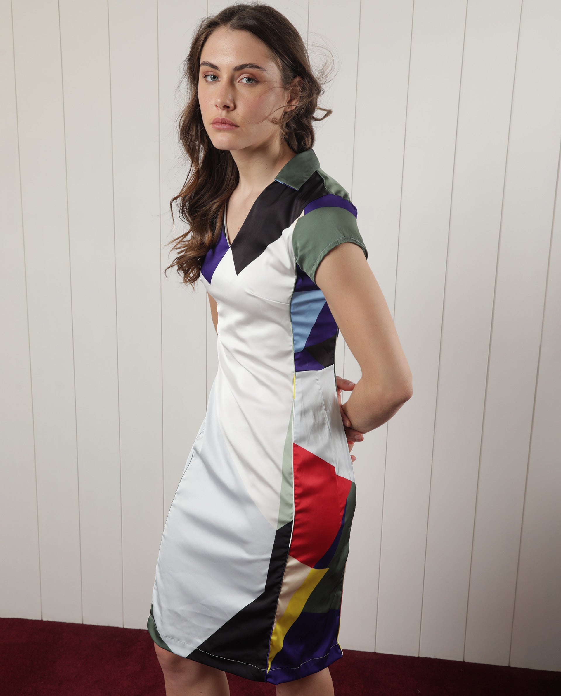 1. Elevate your wardrobe with our striking V-neck short dress, featuring an eye-catching abstract print and chic collar detail.