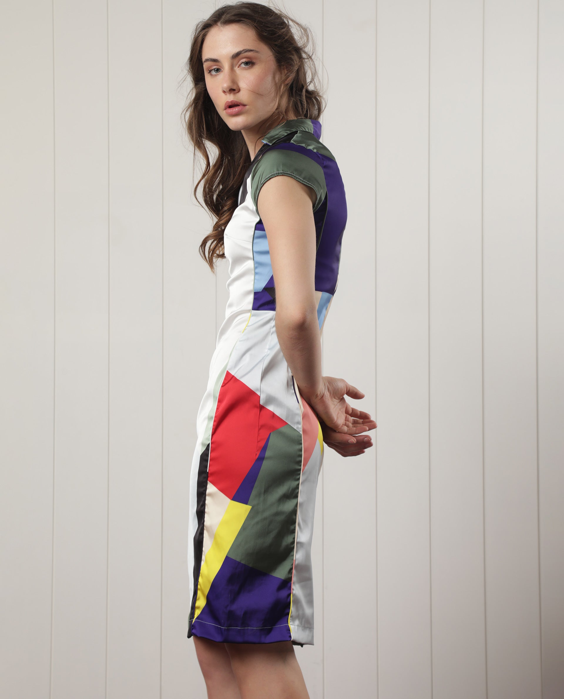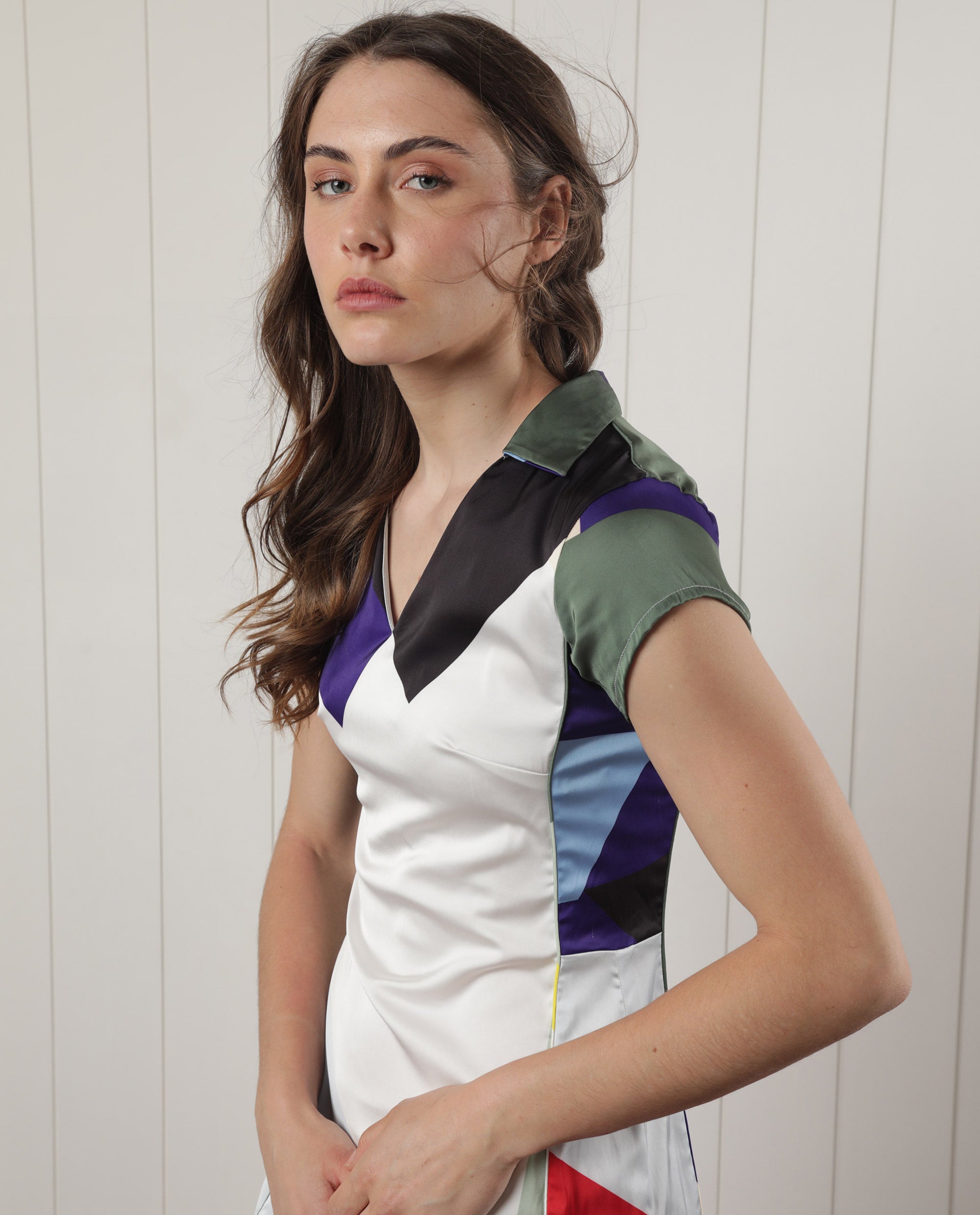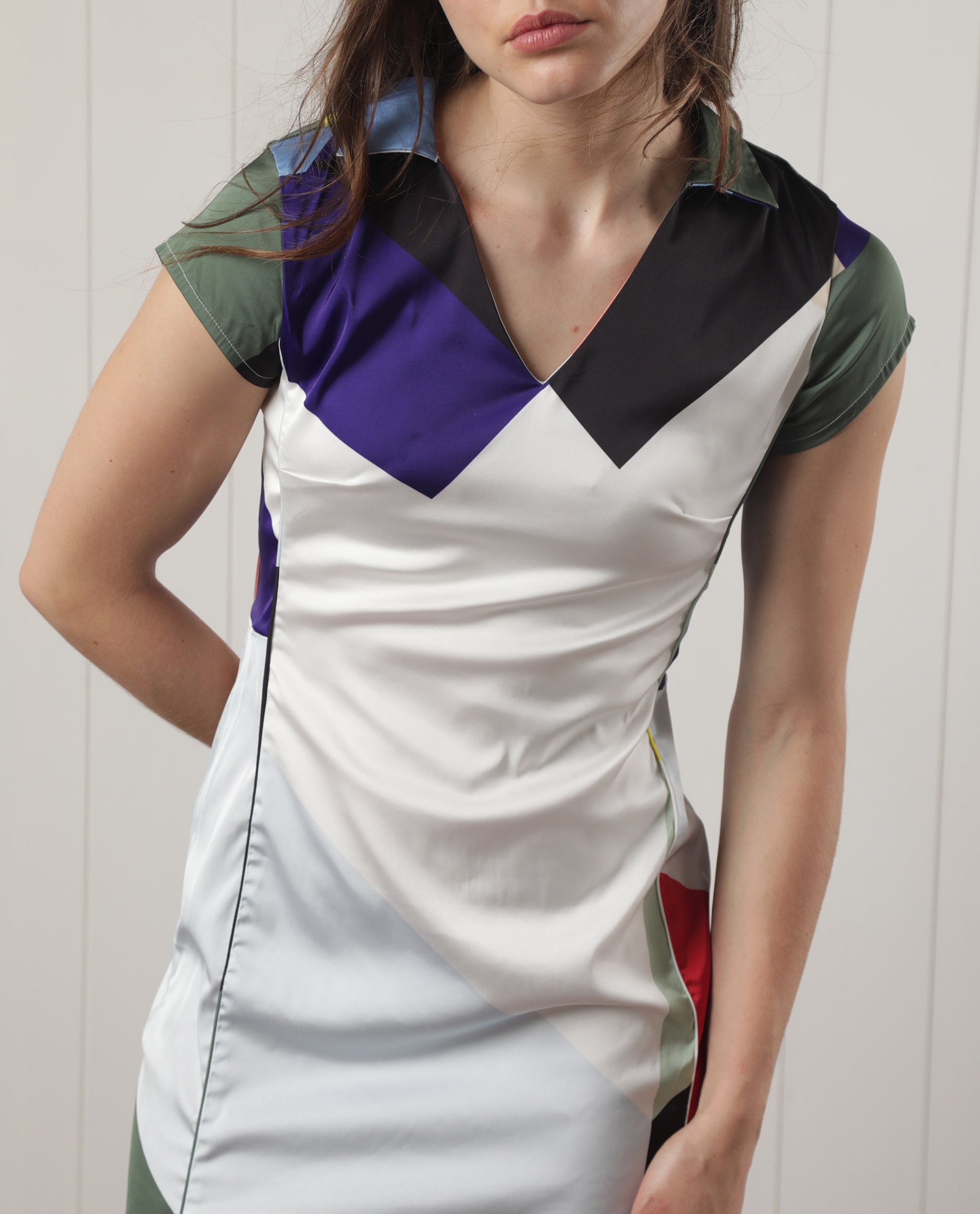 1. Elevate your wardrobe with our striking V-neck short dress, featuring an eye-catching abstract print and chic collar detail.
