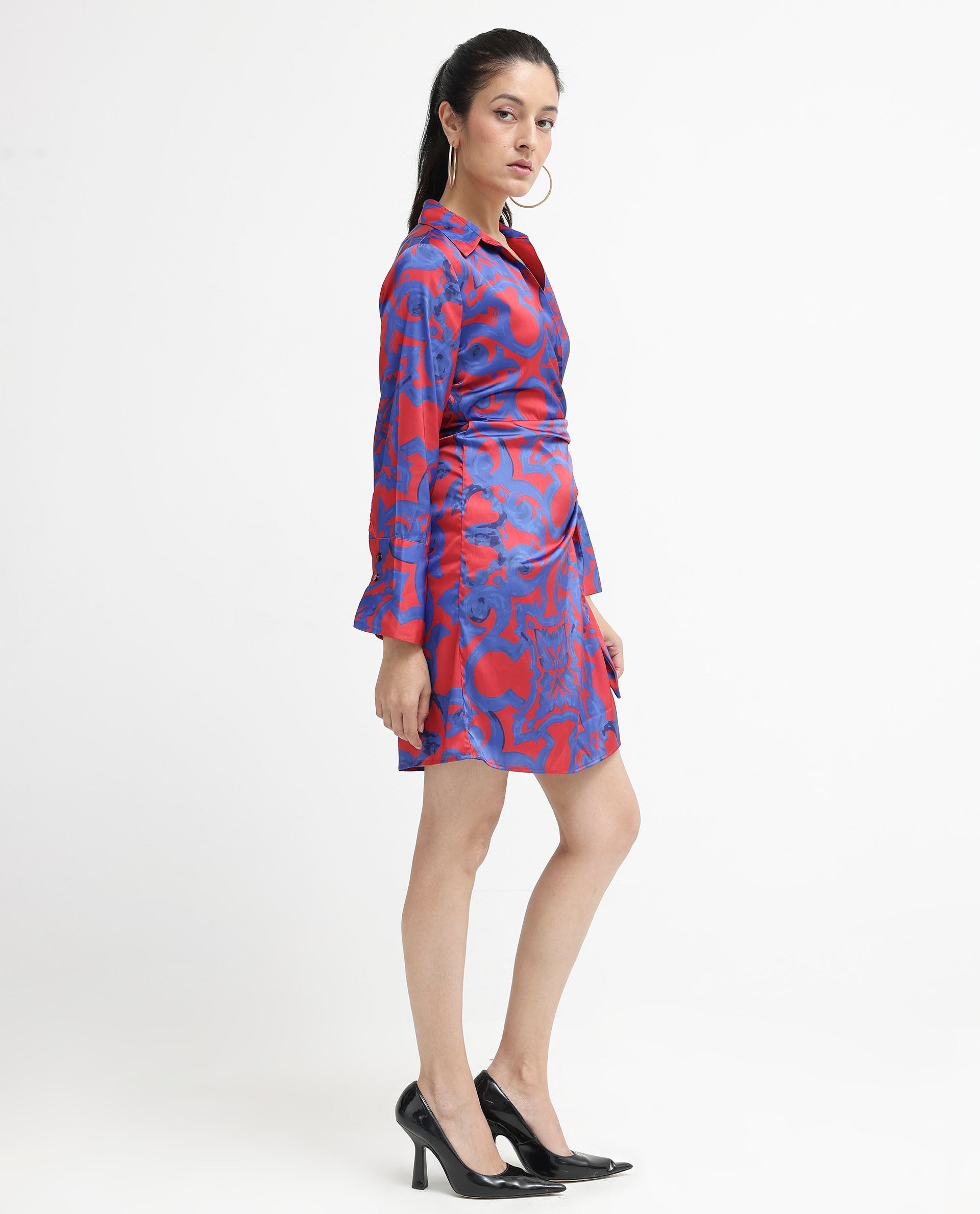 Rareism Women Cager-SC Red Cuffed Sleeve Regular Collar Loop Wrap Abstract Print Mini Dress