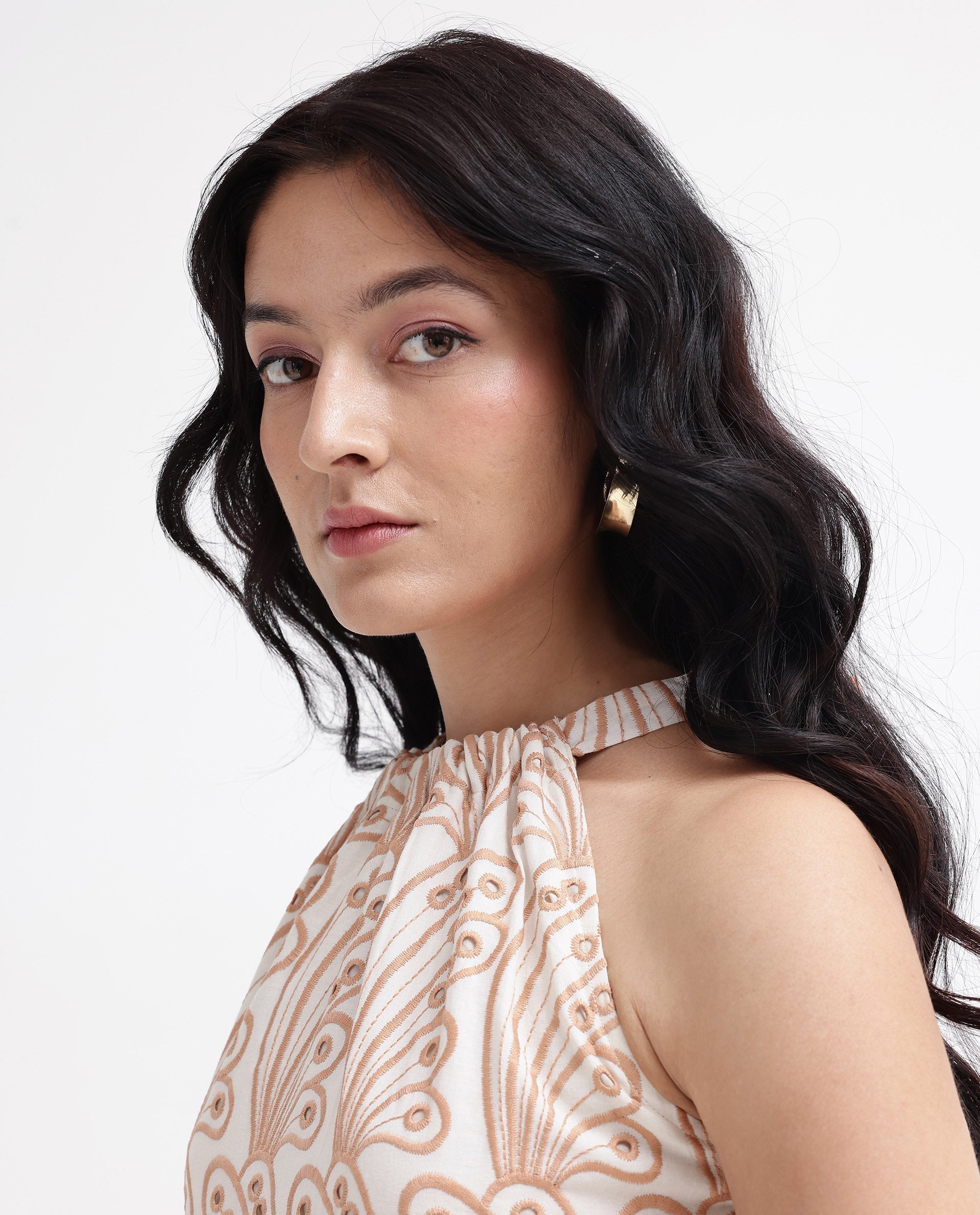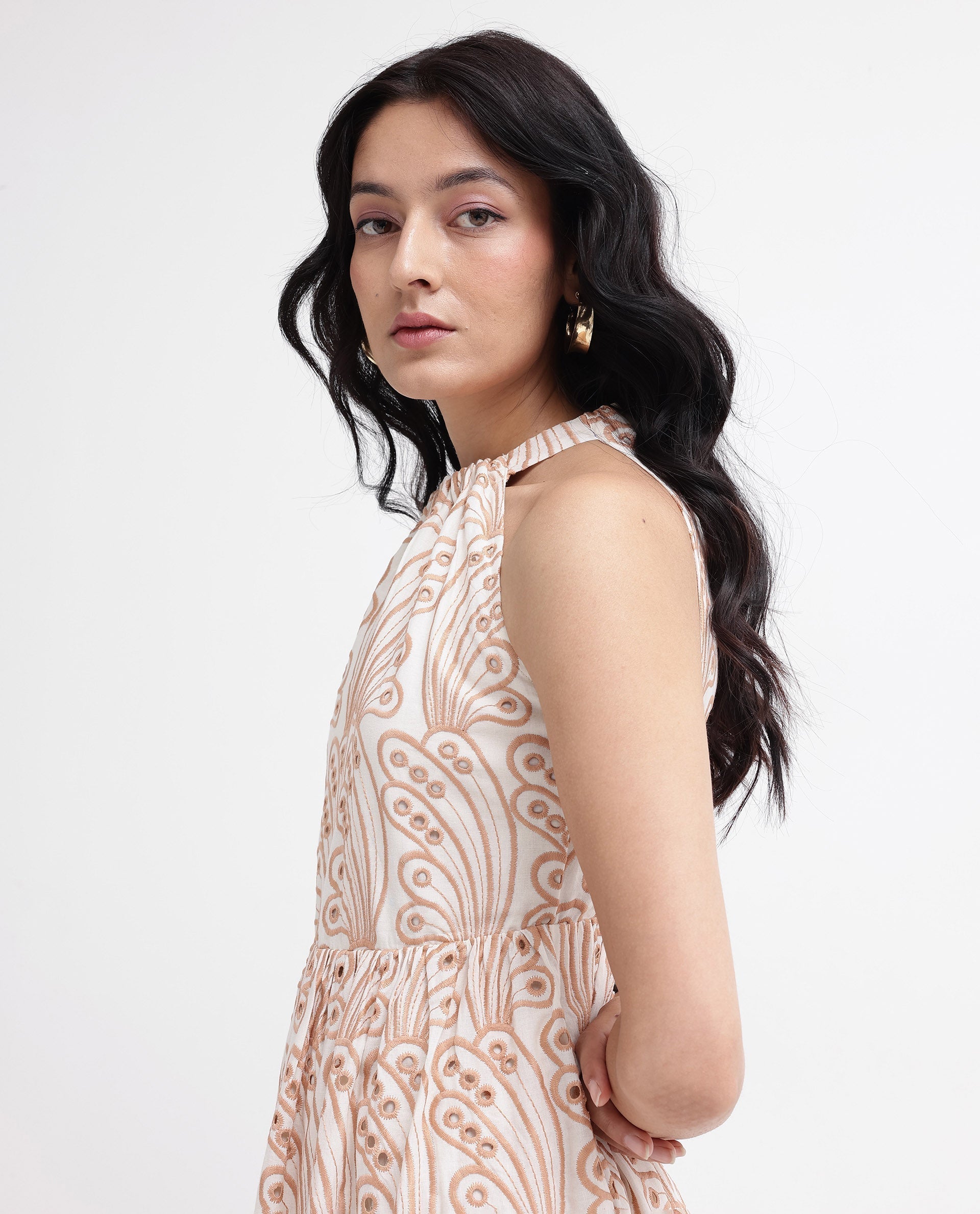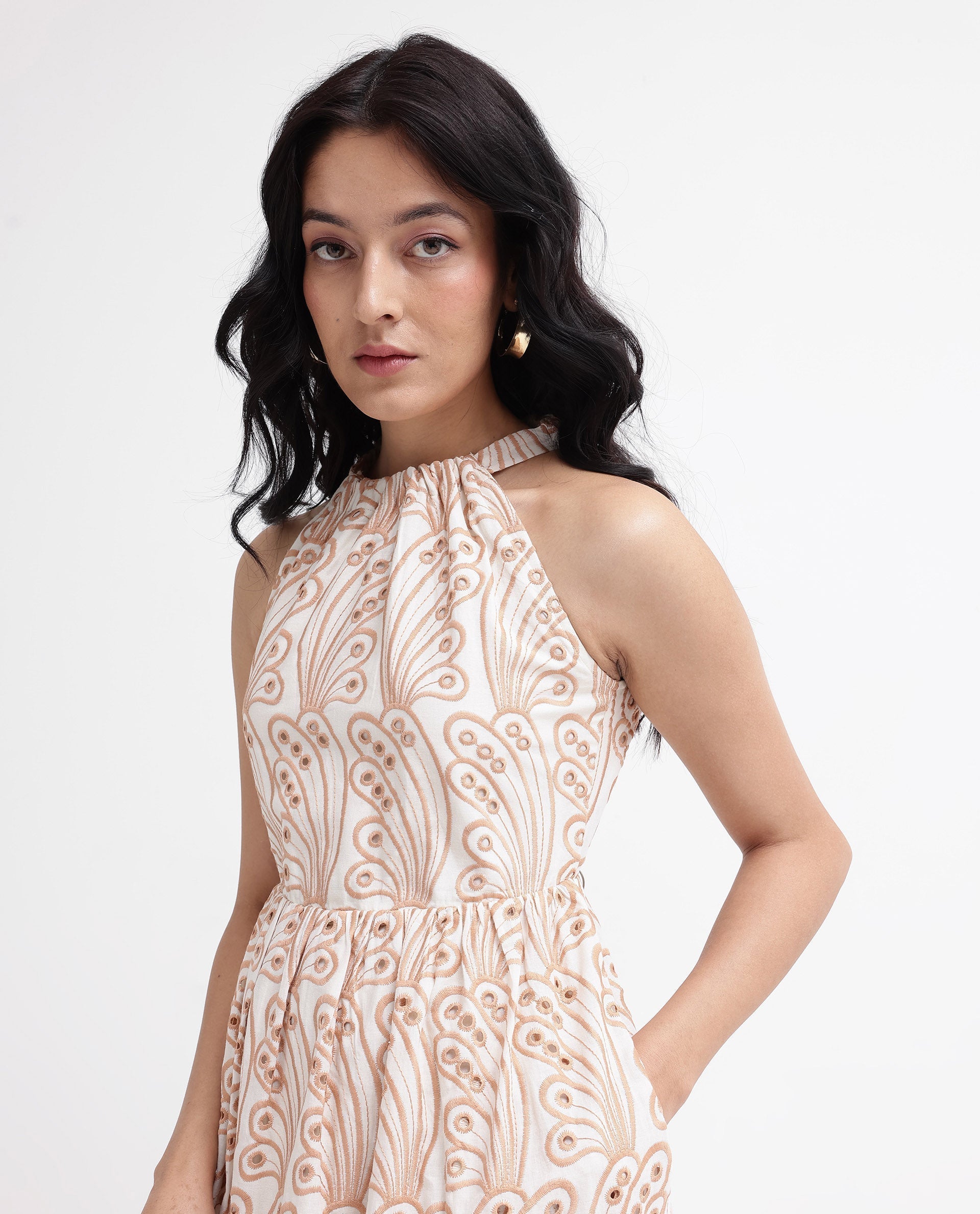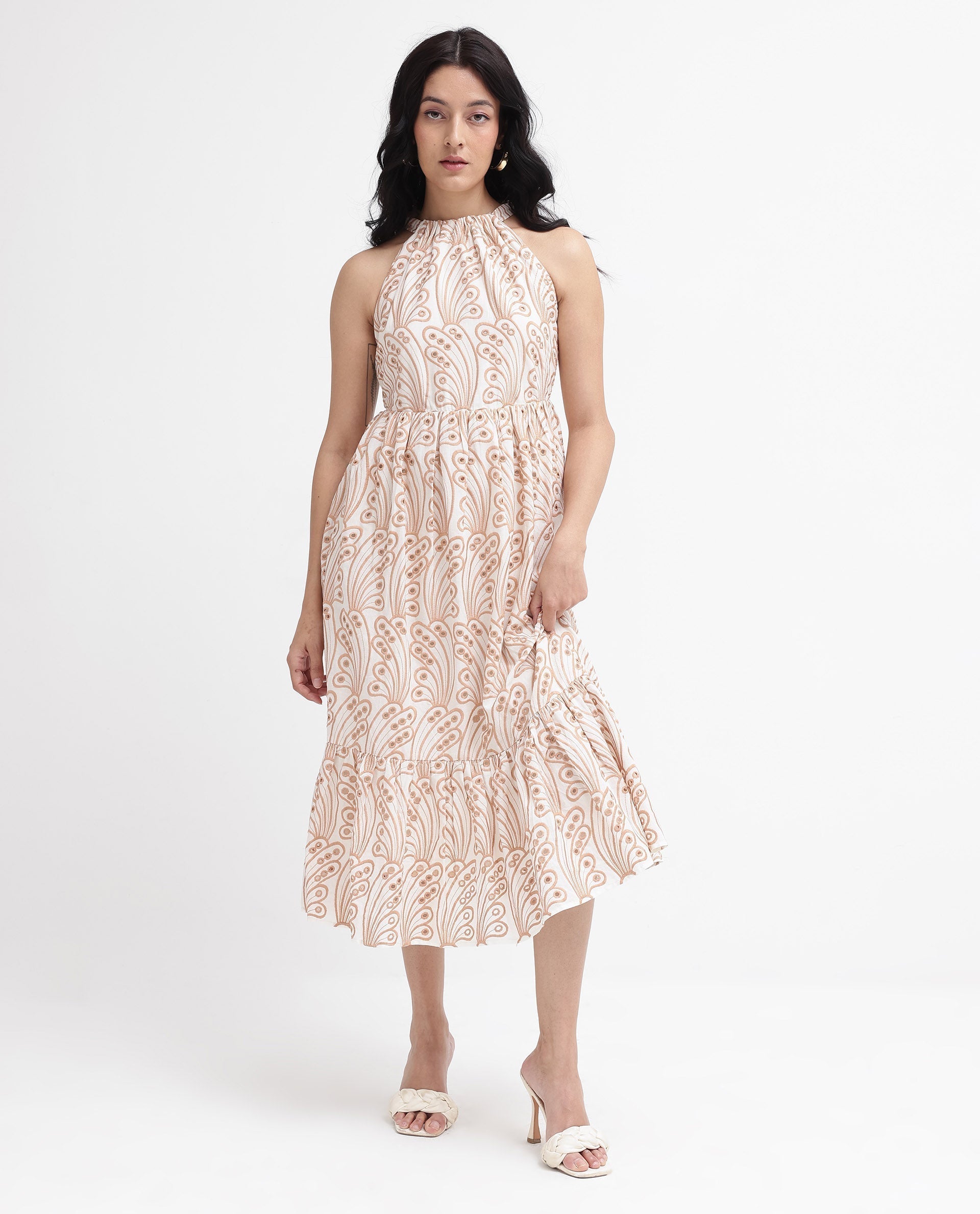 Rareism Women Chalco-SC Beige Sleeveless Halter Neck Fit And Flare Plain Maxi Dress