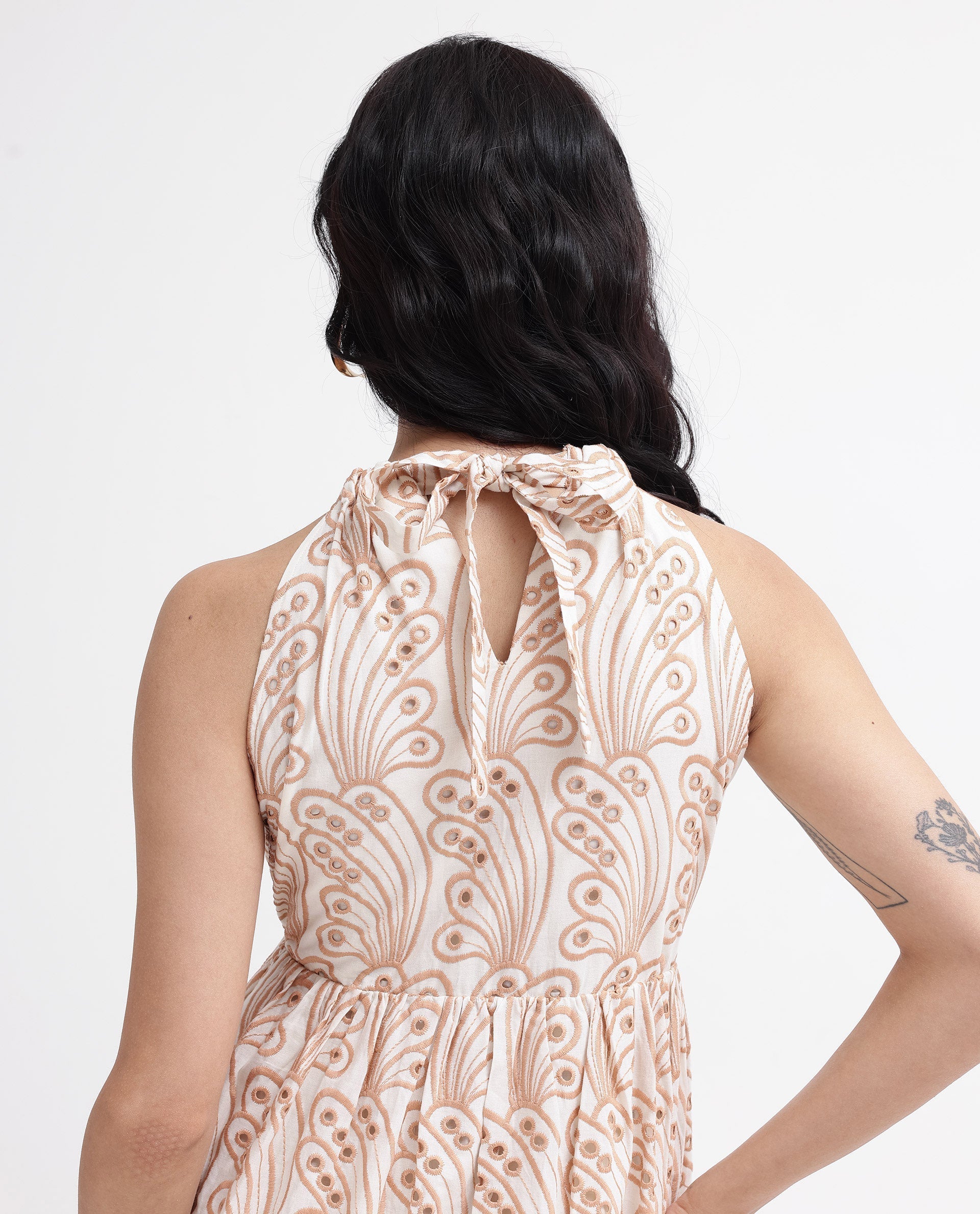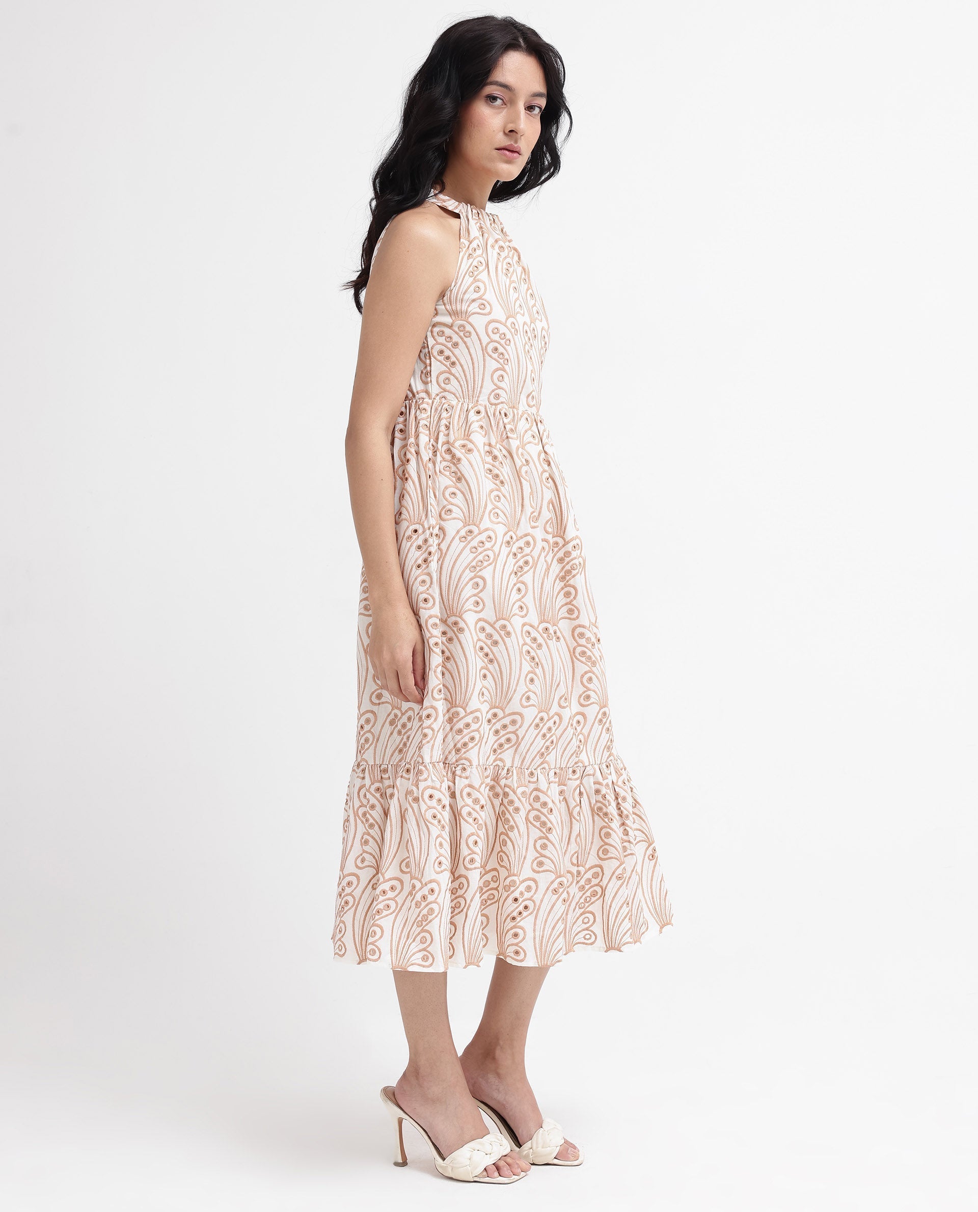 Rareism Women Chalco Beige Sleeveless Halter Neck Fit And Flare Plain Maxi Dress