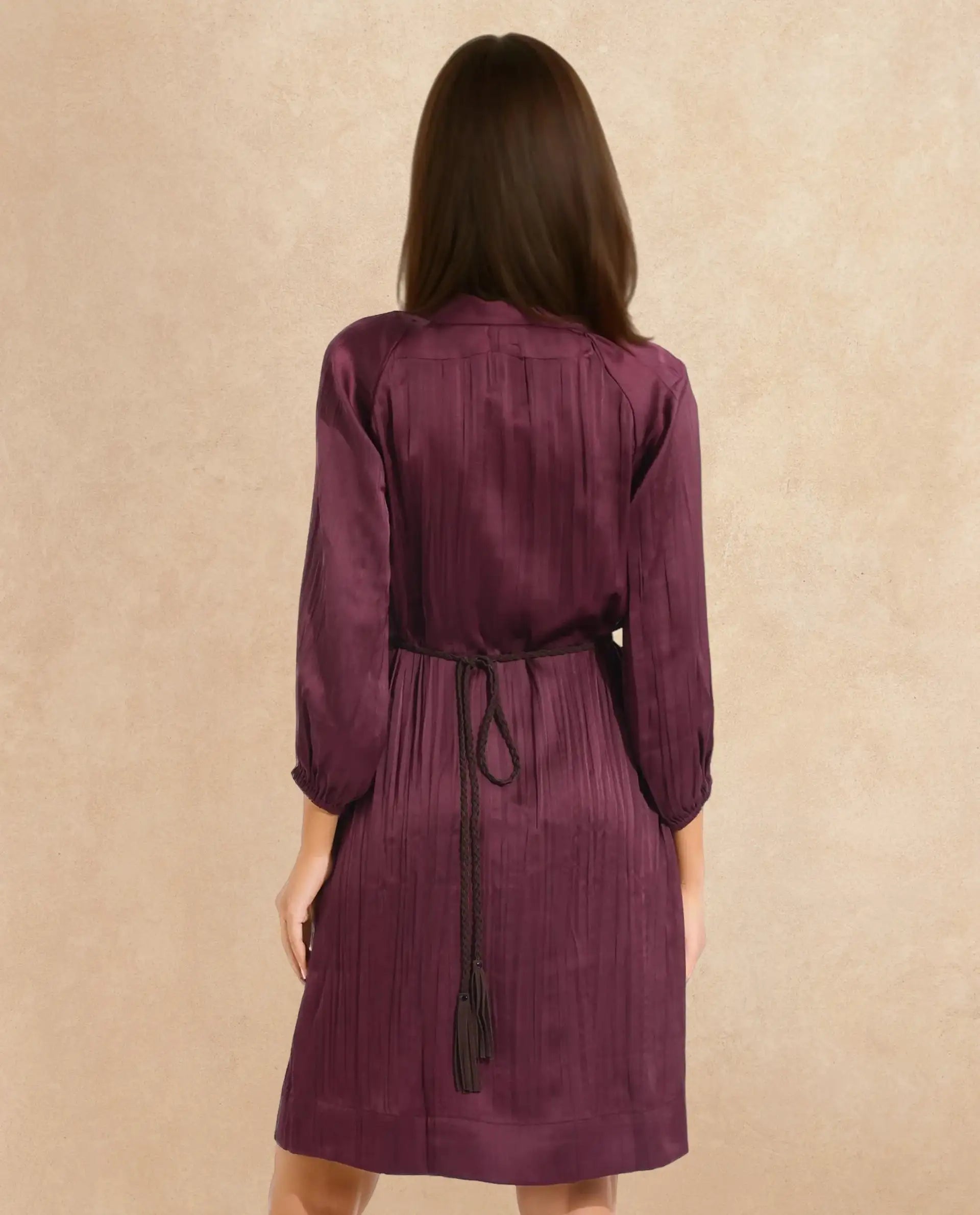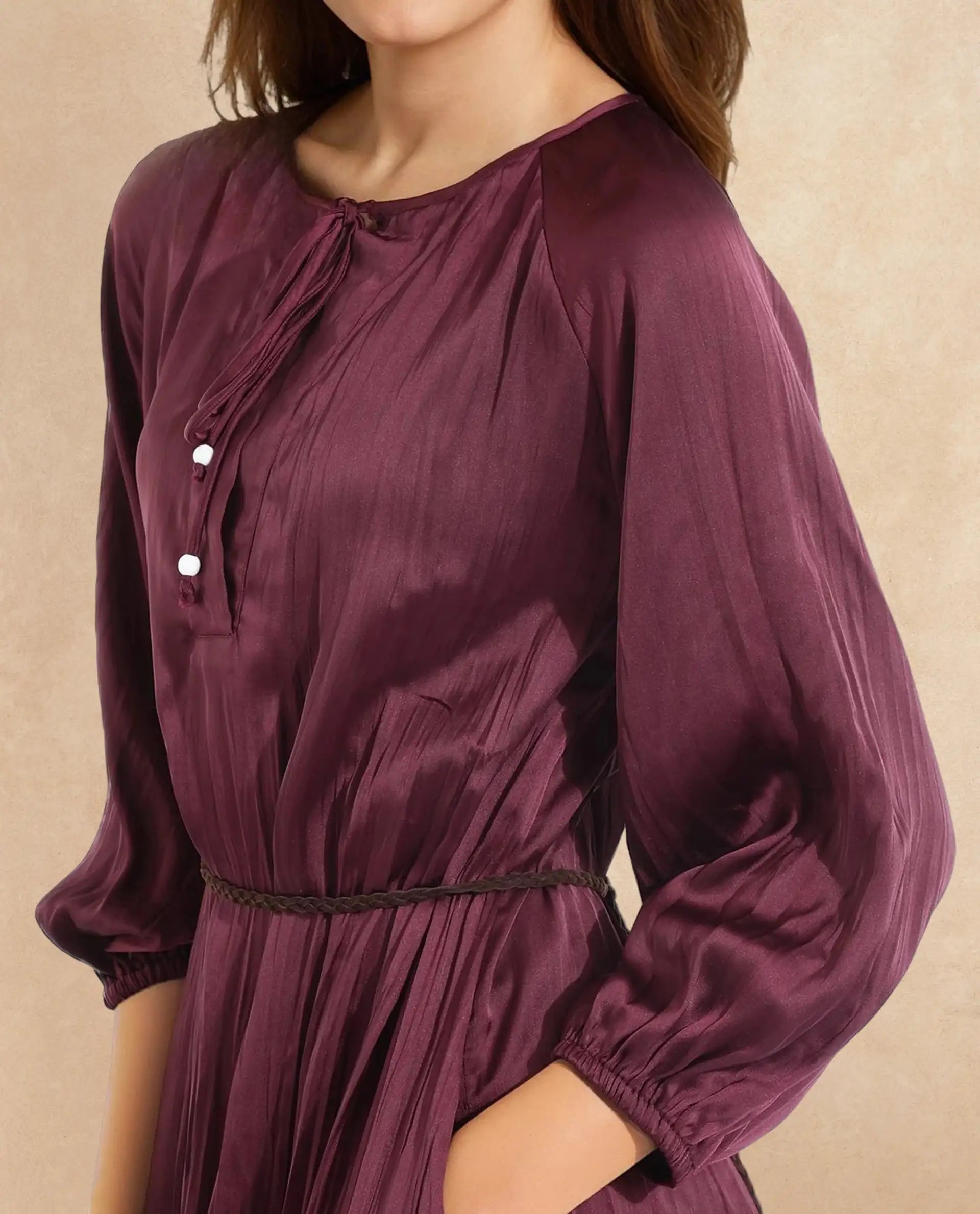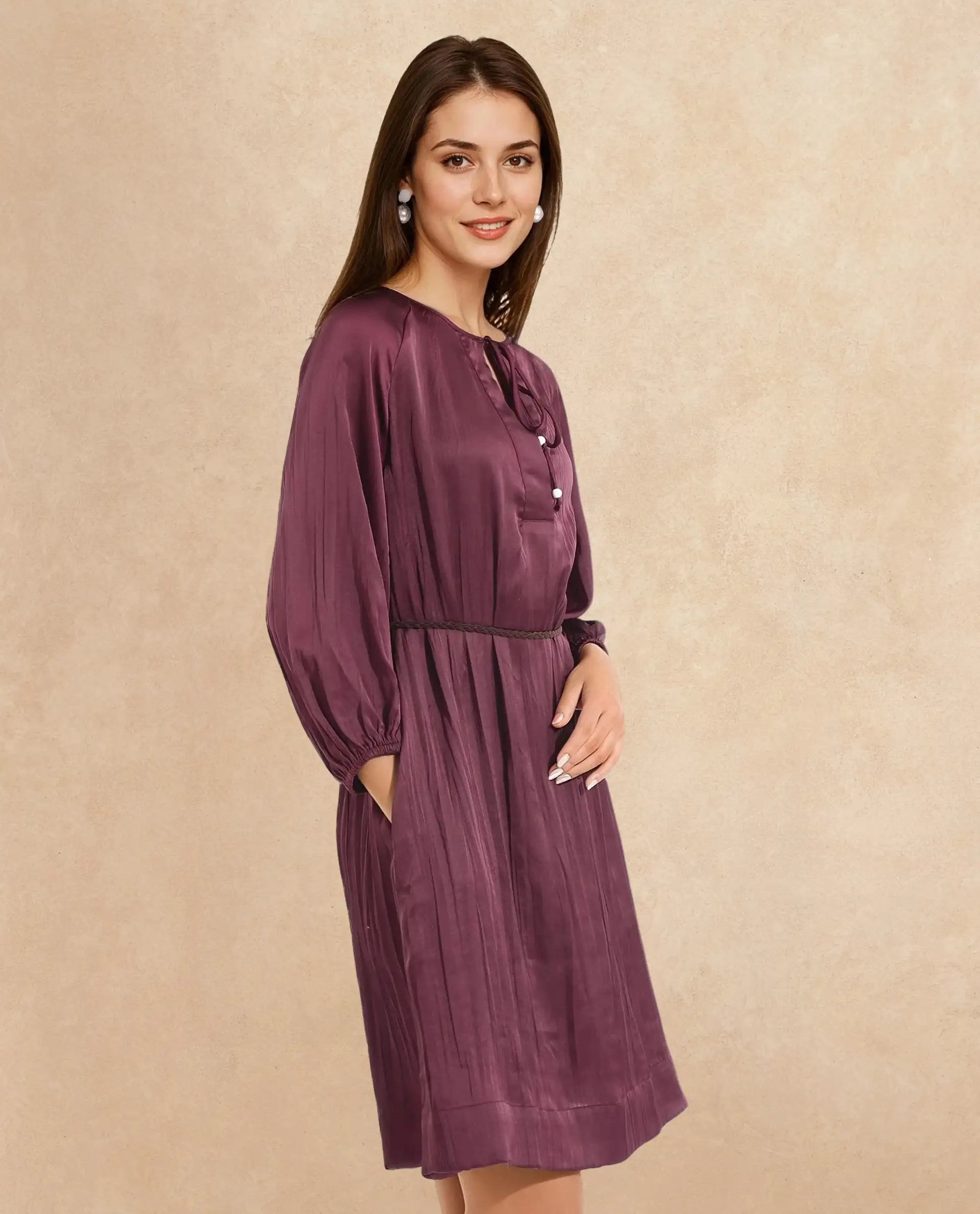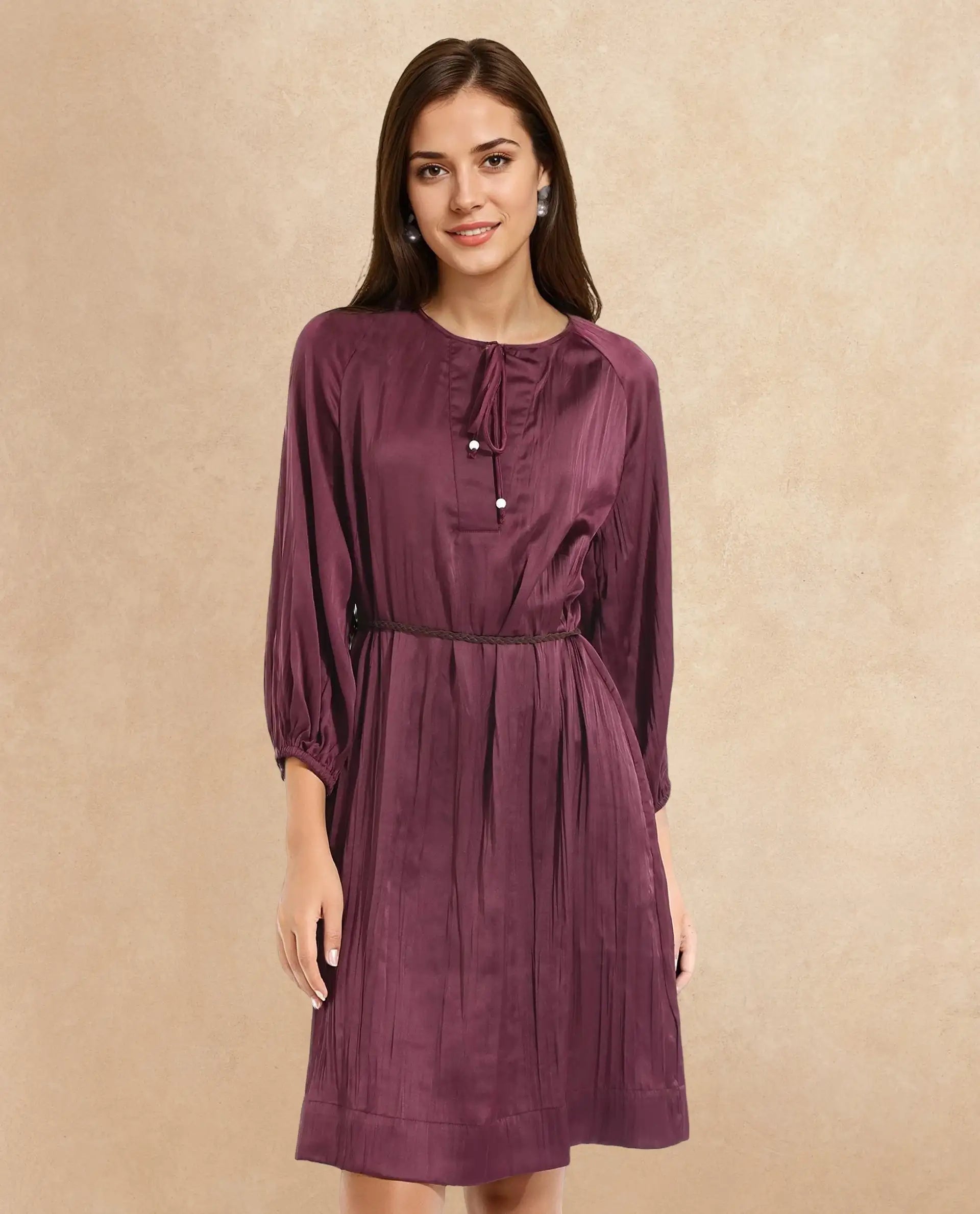 Rareism Women Choki Dark Purple Raglan Sleeves Tie-Up Neck Tie Up Closure Relaxed Fit Mini Plain Dress