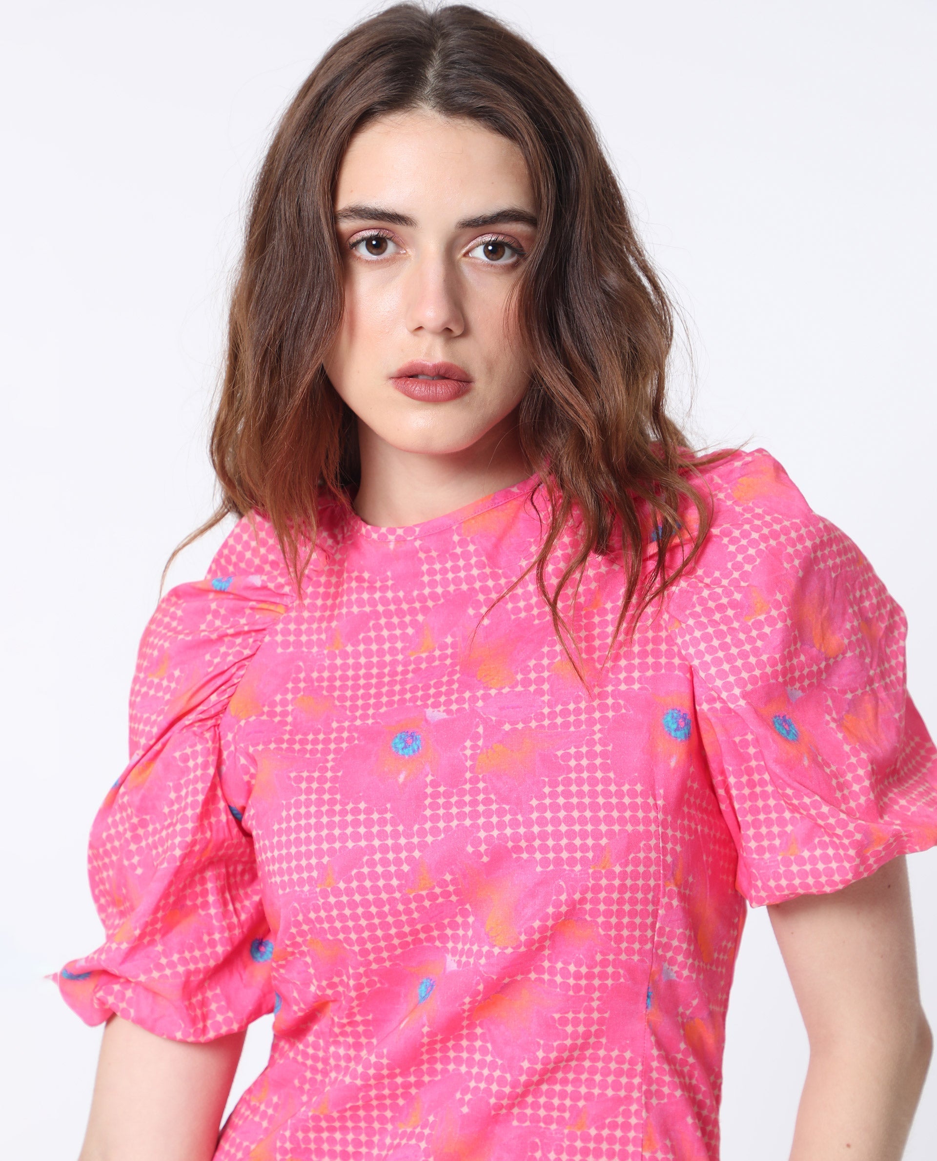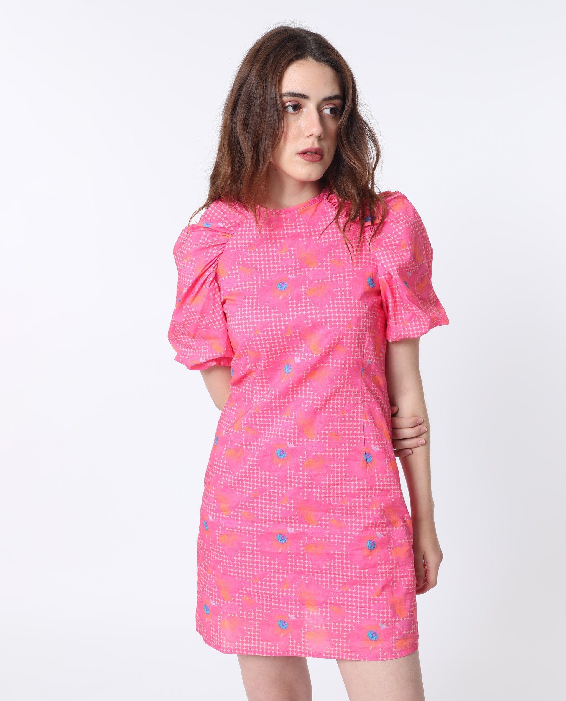 Rareism Women Clark Fluorescent Pink Cotton Fabric Short Sleeves Zip Closure Round Neck Puff Sleeve Slim Fit Floral Print Short Asymmetric Dress