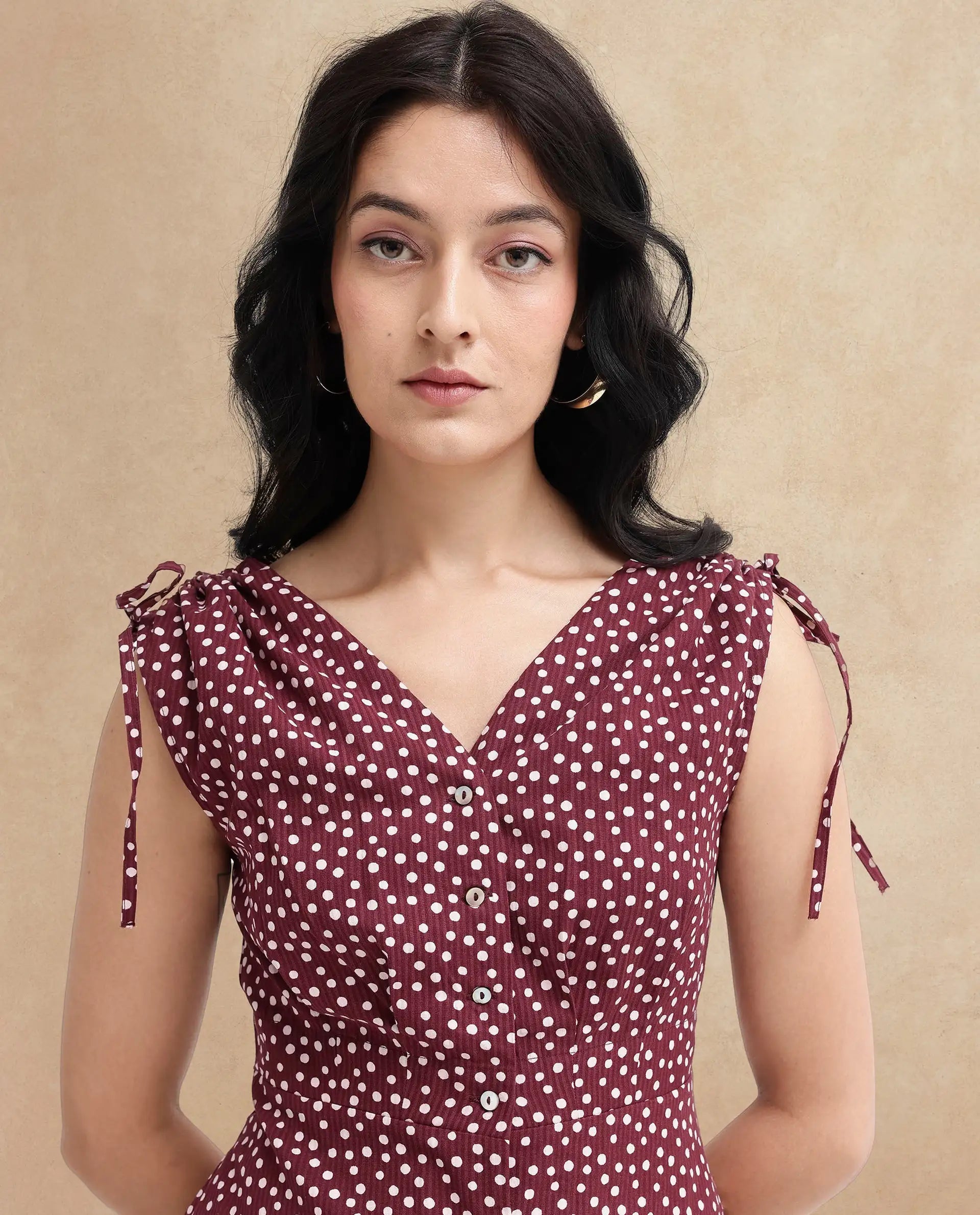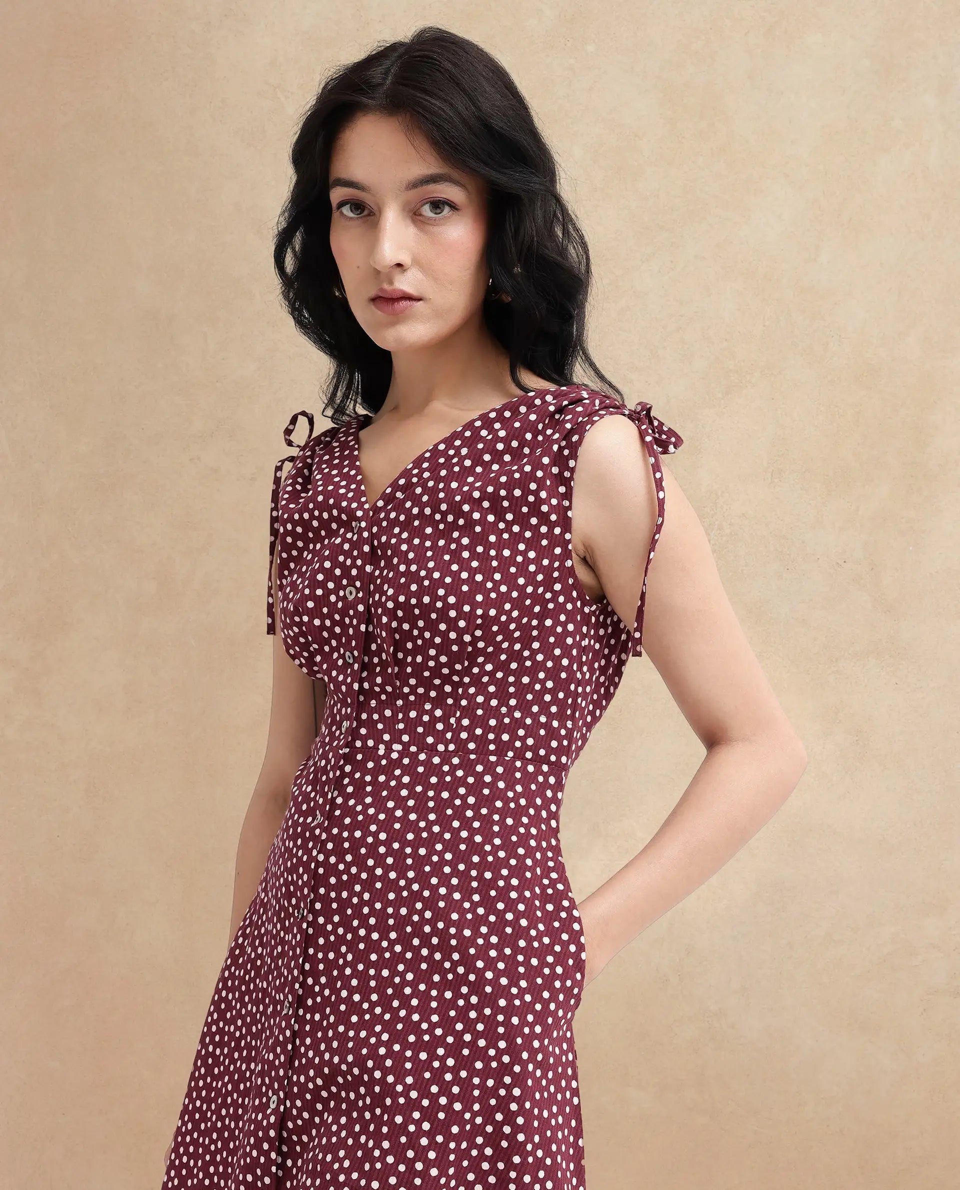 Rareism Women's Clarta Brown  V-Neck Button Closure Sleeveless Polka A-Line Midi Dress