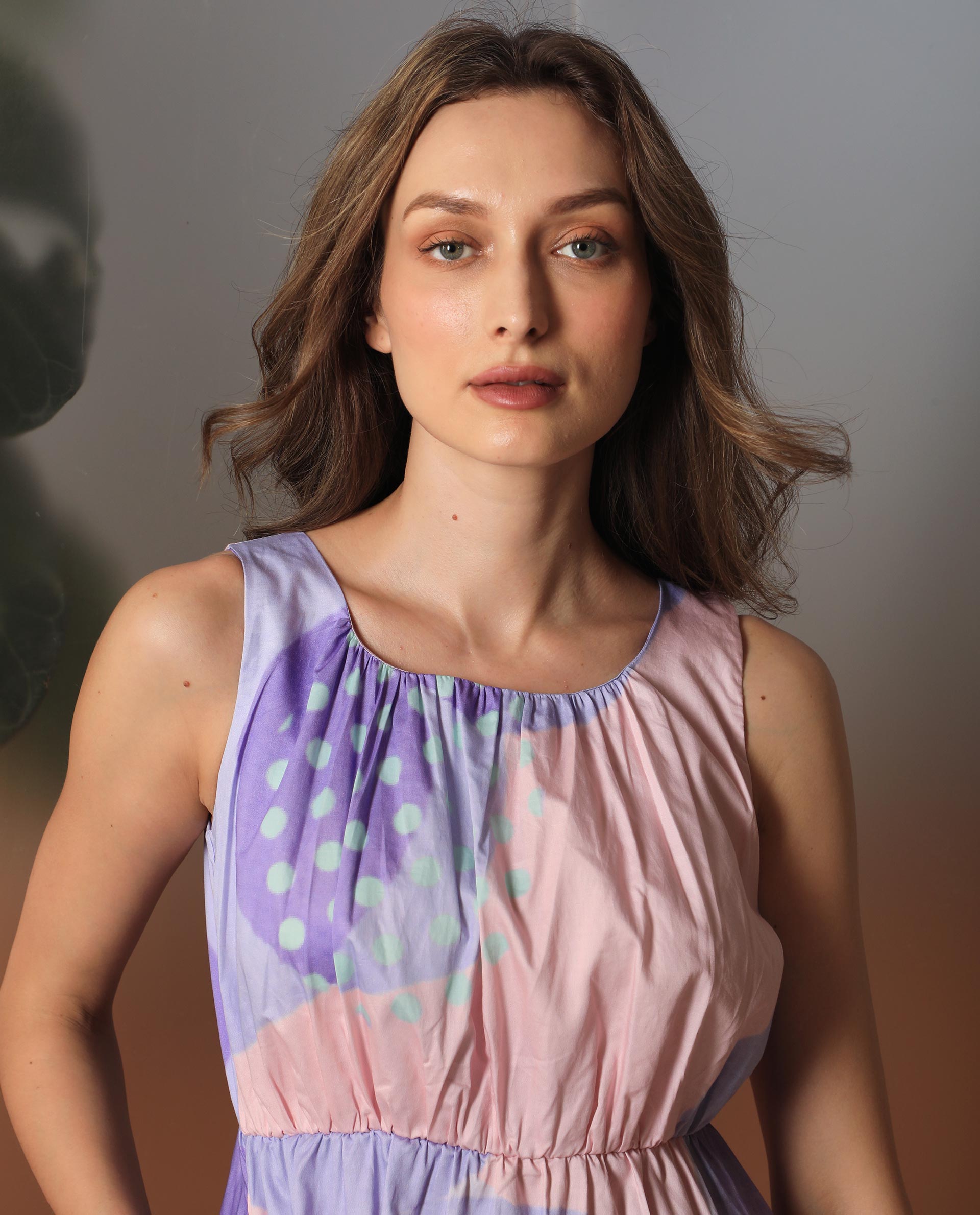 Rareism Women Cordova Pink Cotton Fabric Boat Neck Sleeveless Tailored Fit Polka Knee Length Empire Dress