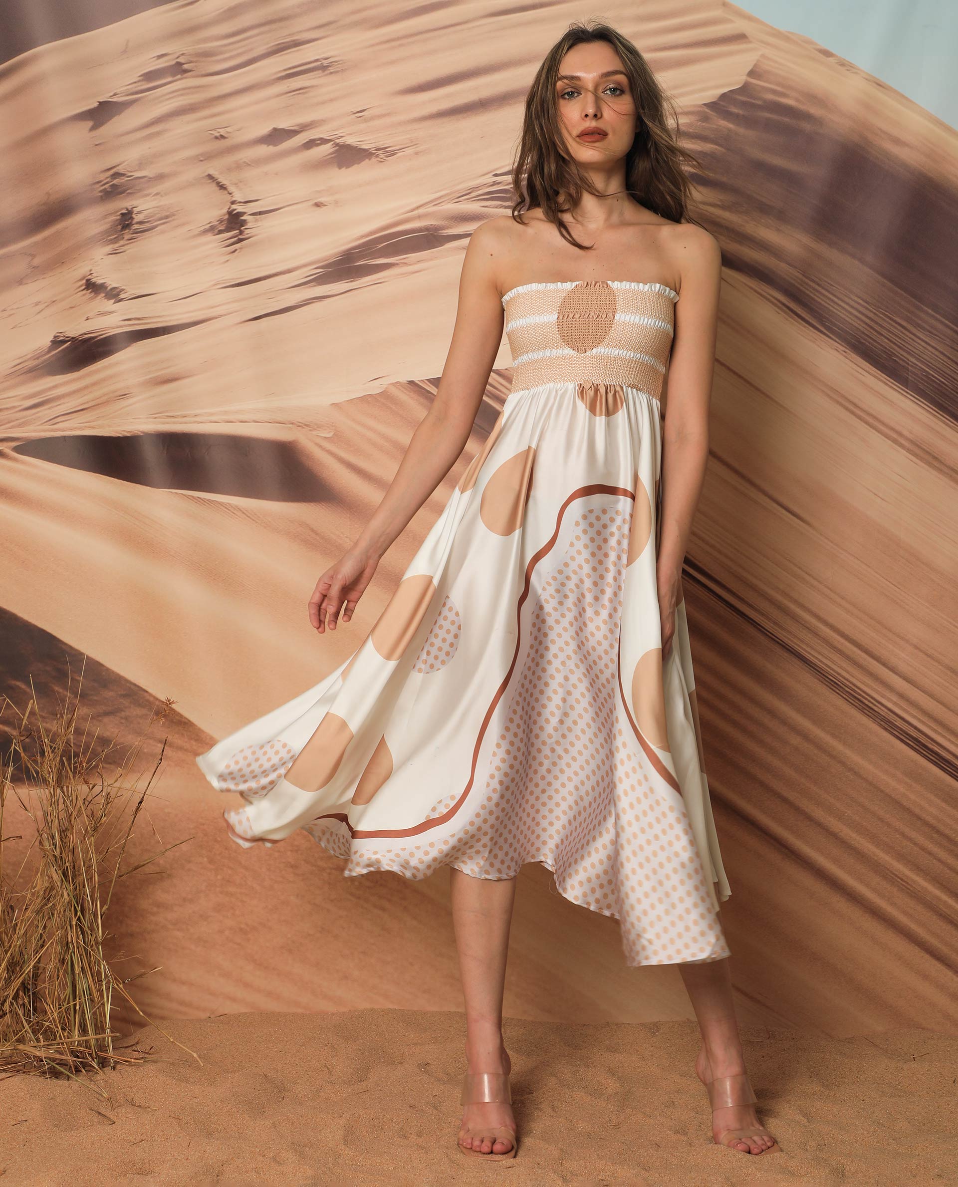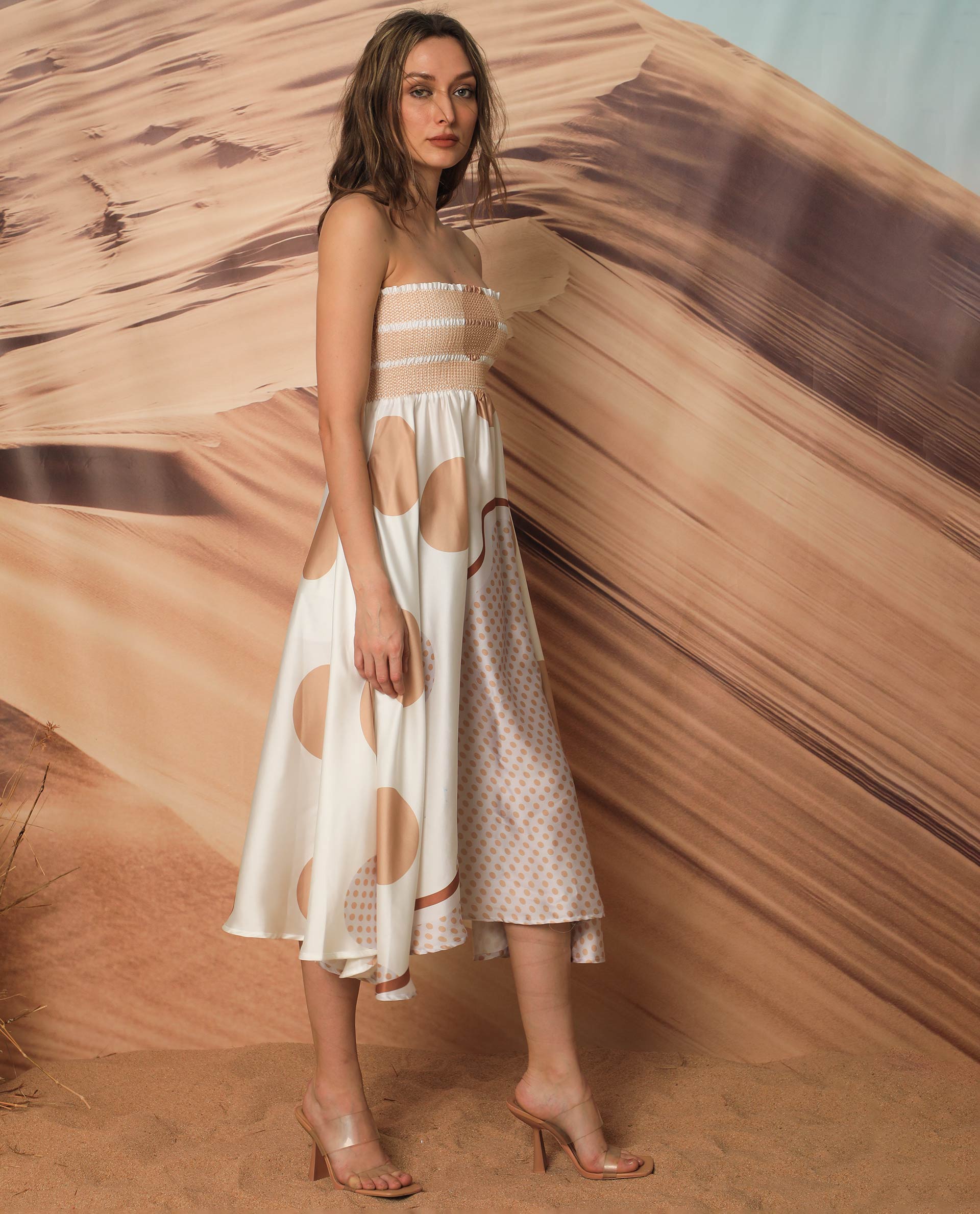 Rareism Women Culliete Beige Cotton Fabric Sleeveless Tube Neck Shoulder Straps Regular Fit Polka Midi Empire Dress