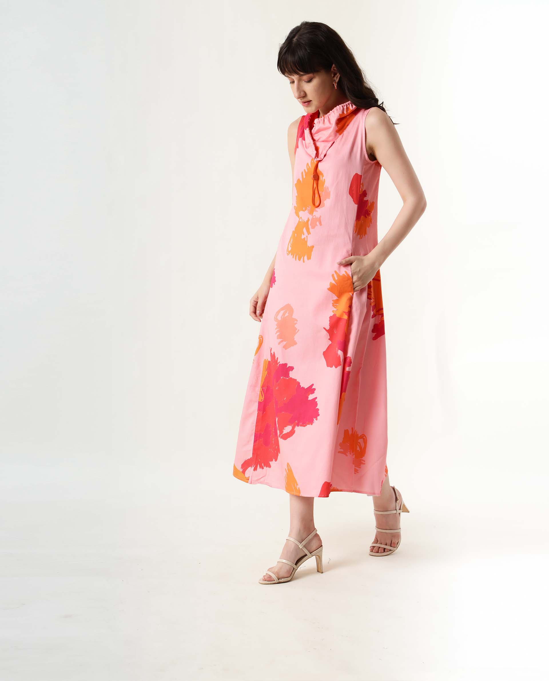 PULL IN GATHER NECK ABSTRACT PRINT A LINE MIDI DRESS