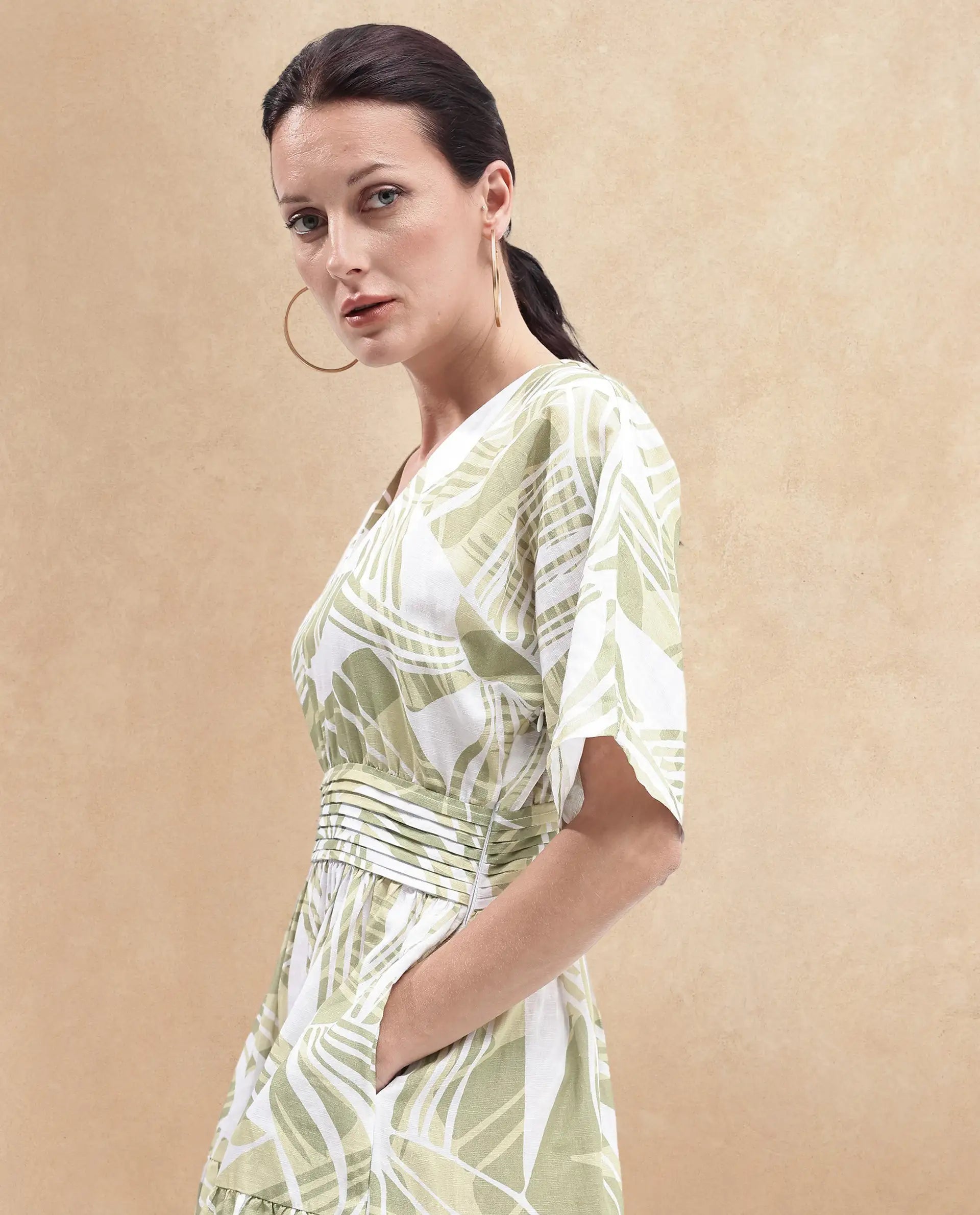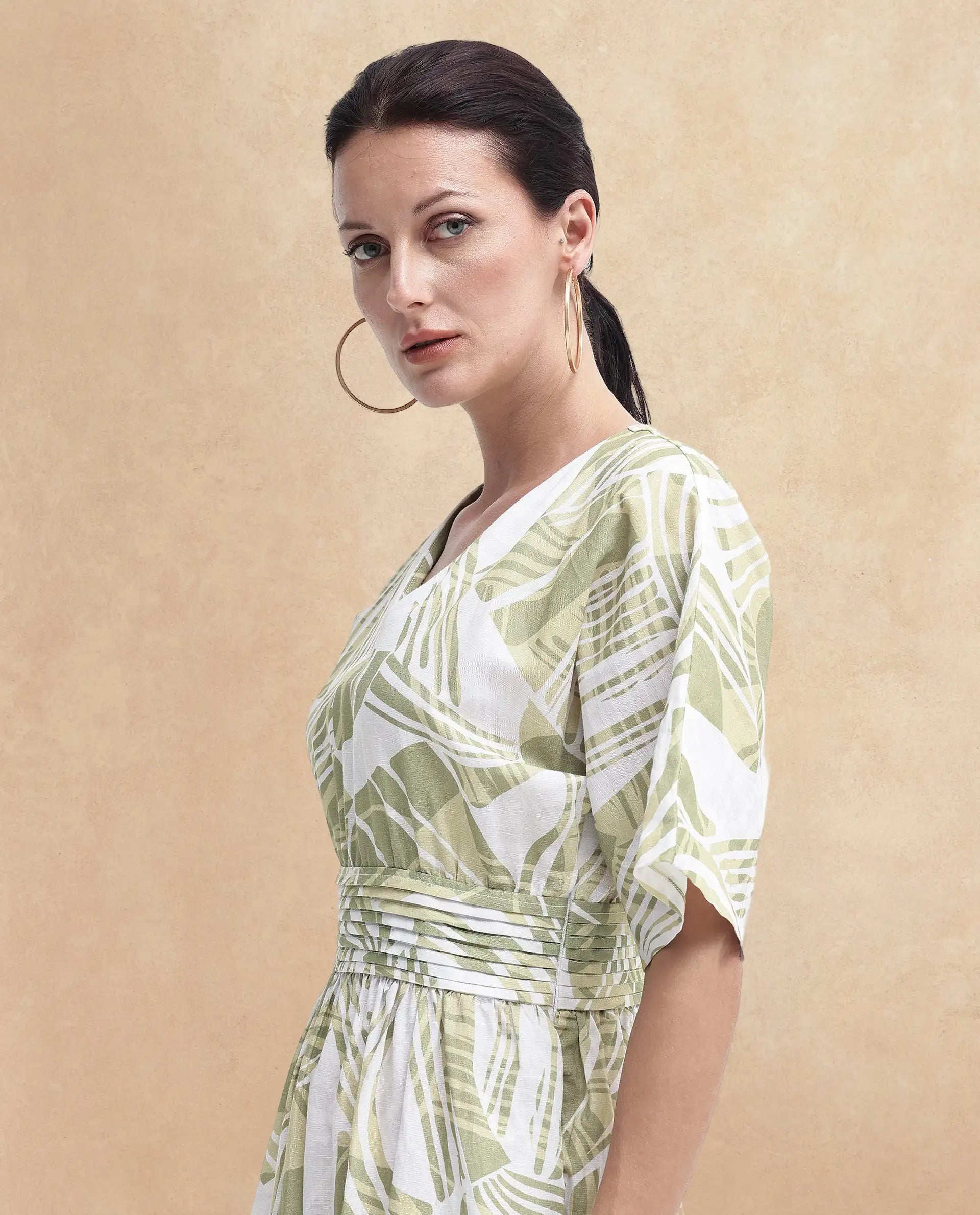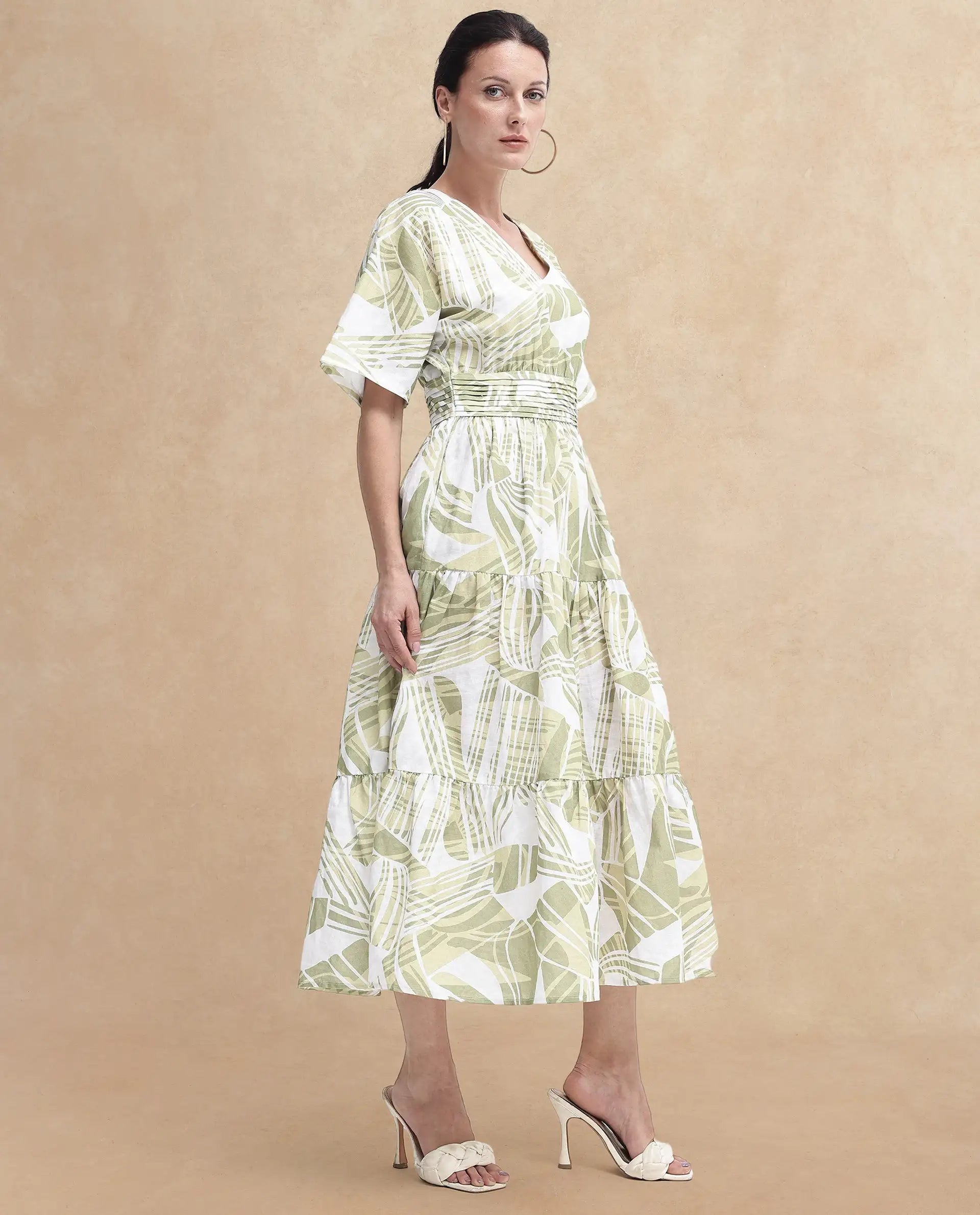 Rareism Women Eltuz Light Green Extended Sleeves V-Neck Fit And Flare Maxi Abstract Print Dress