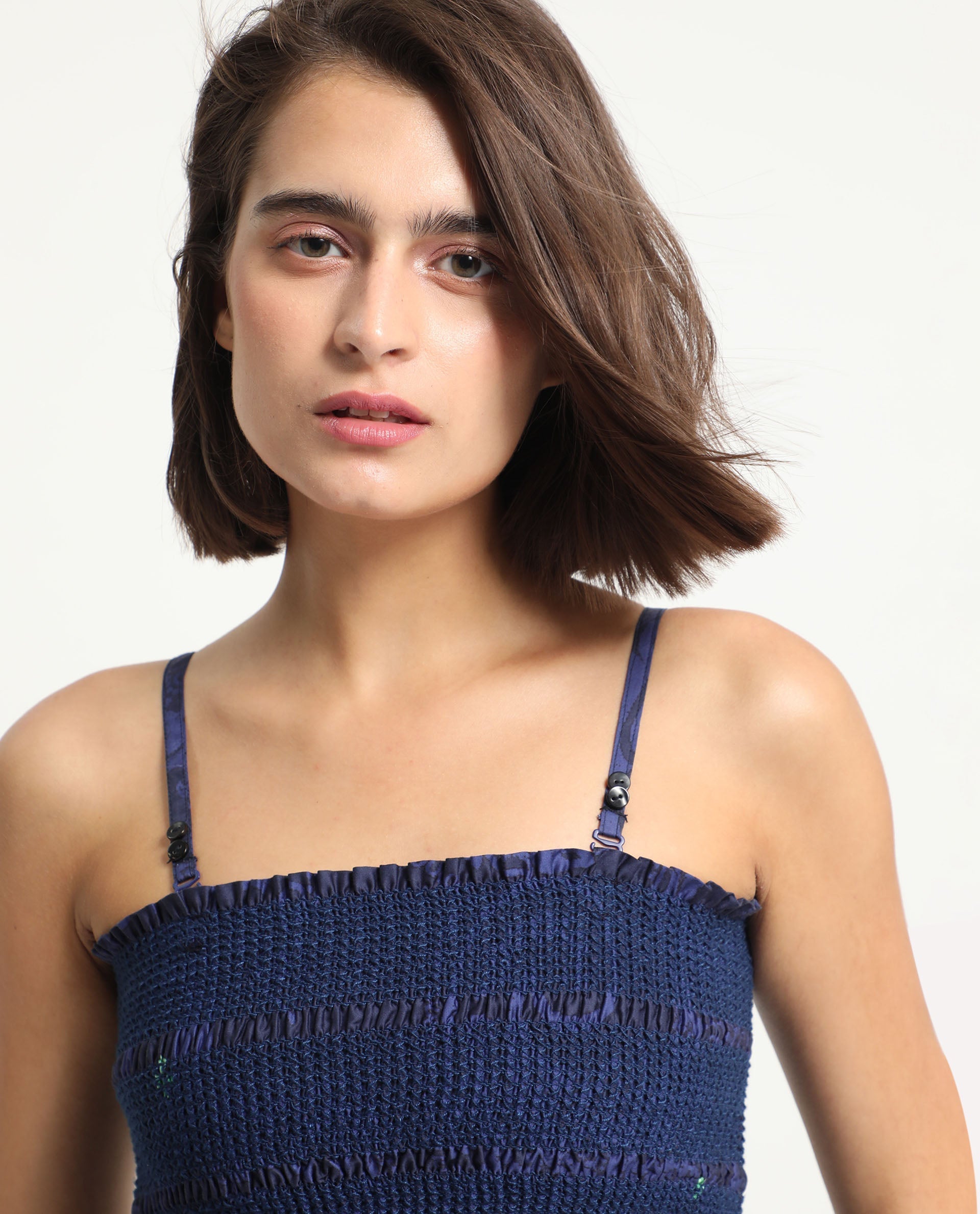- The model (Chest-34, Waist-28, Hips-38, Height-178 cms) is wearing a size XS.