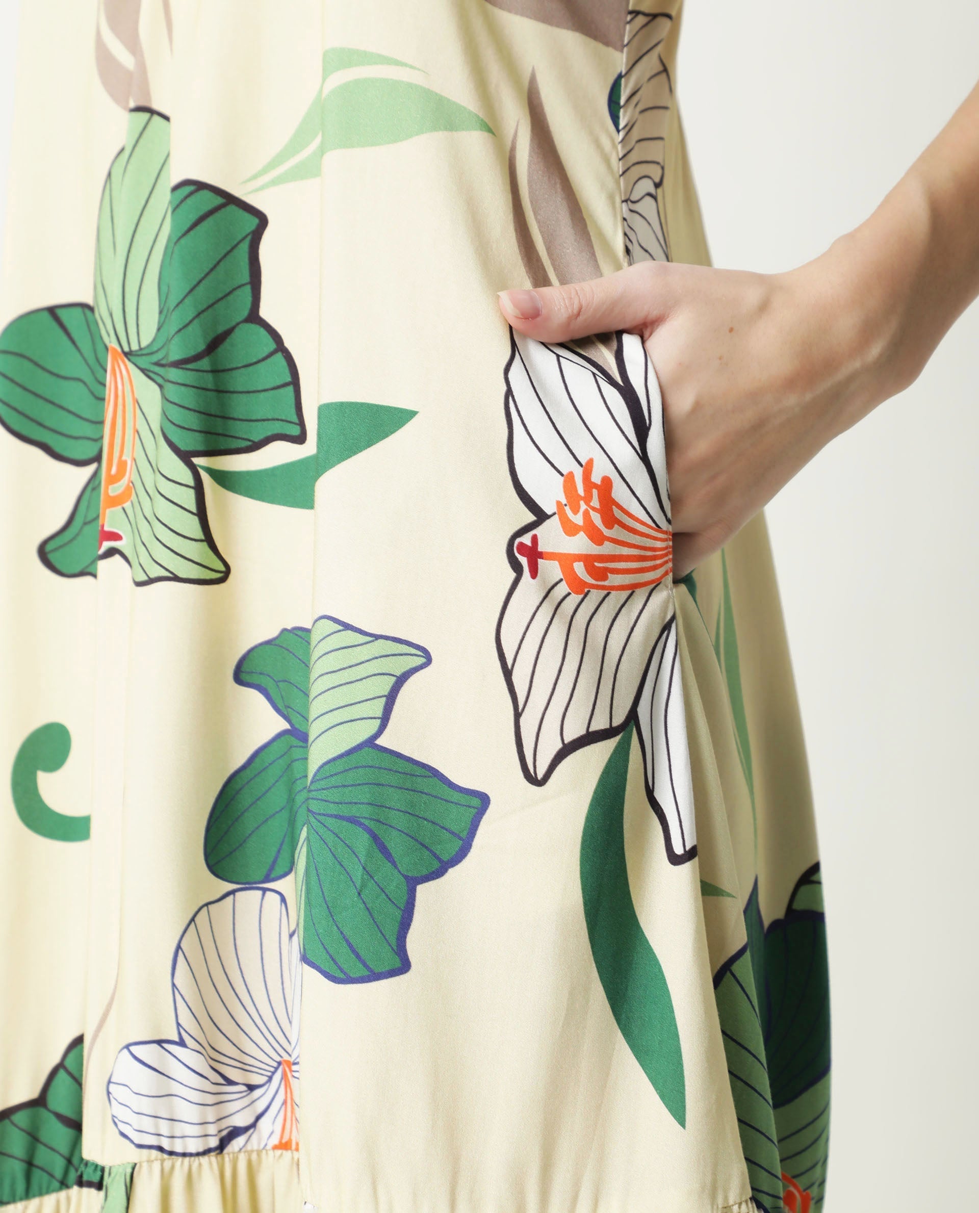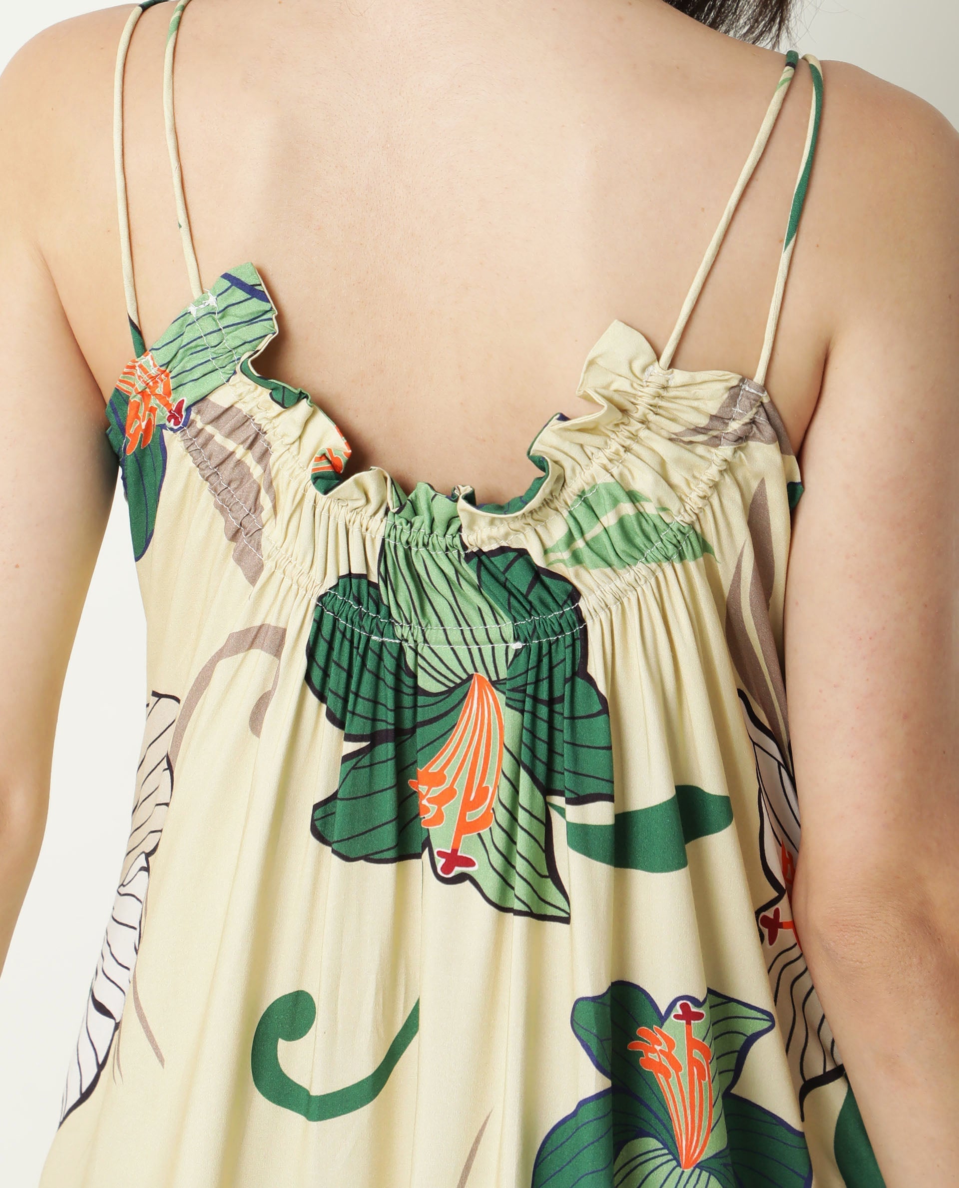 -in Floral all over print with a gathered panel at hem and v neck and a criss cross spaghetti strap.