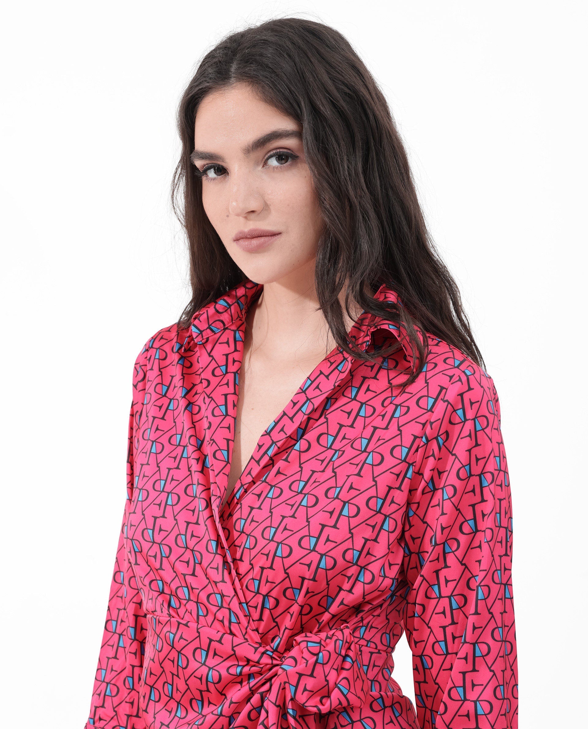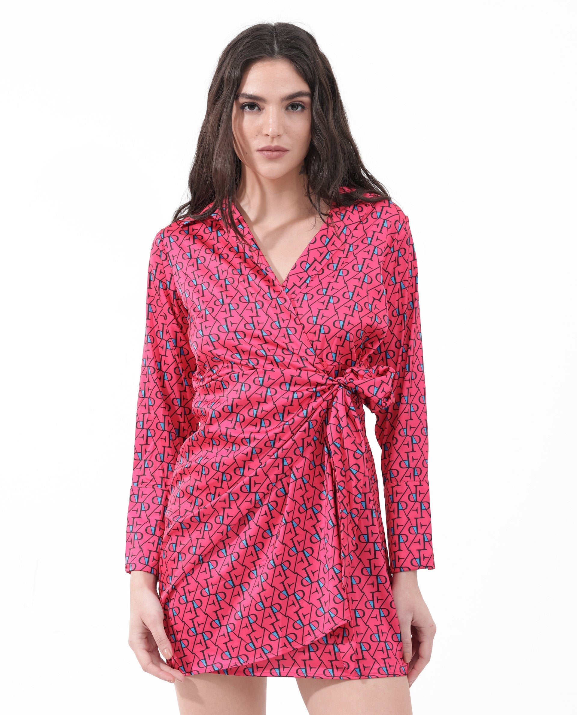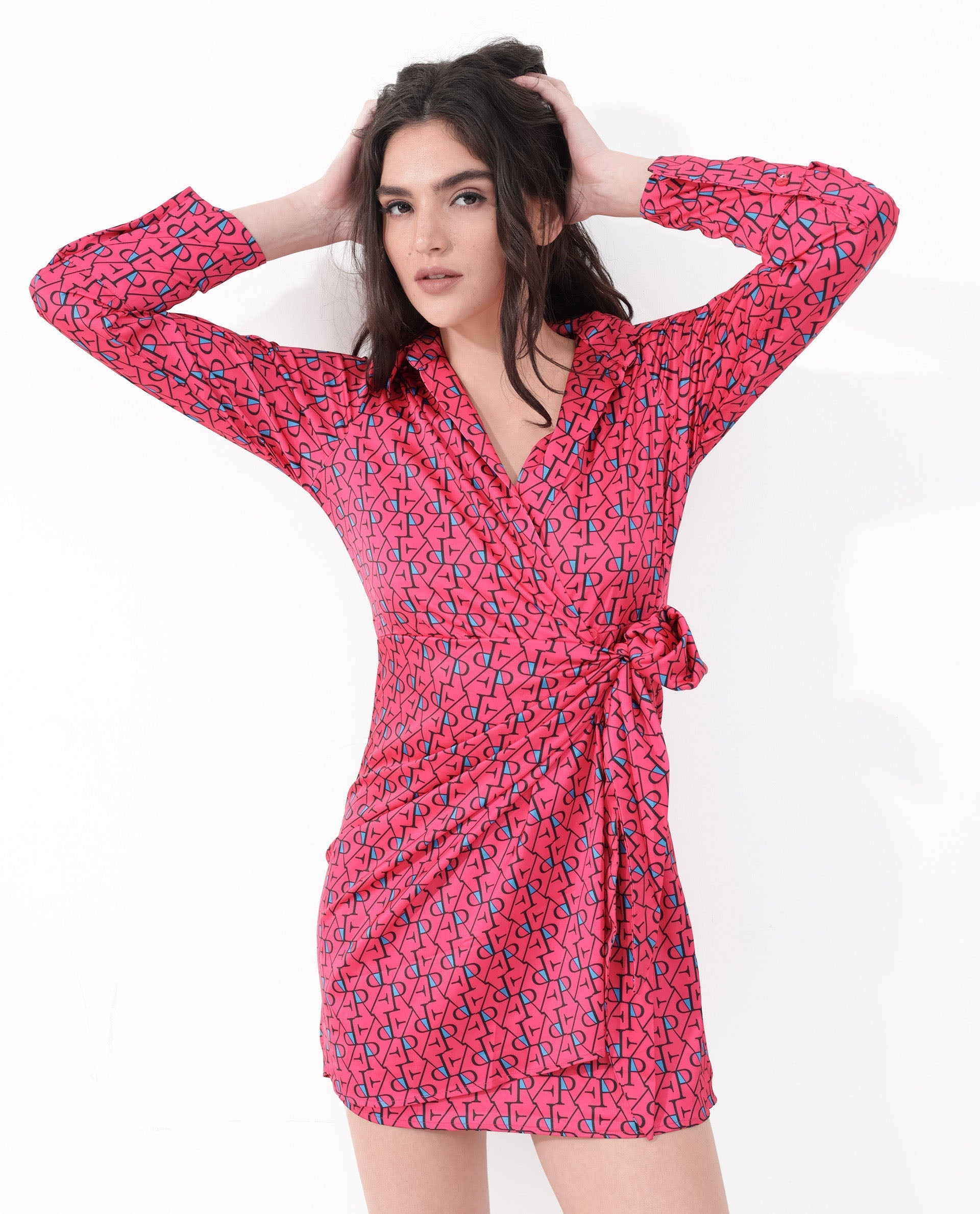 Rareism Women's Gangiv Flouroscent Pink Overlap Neck Tie-Up Closure Cuffed Sleeve Monogram Print Wrap Mini Dress