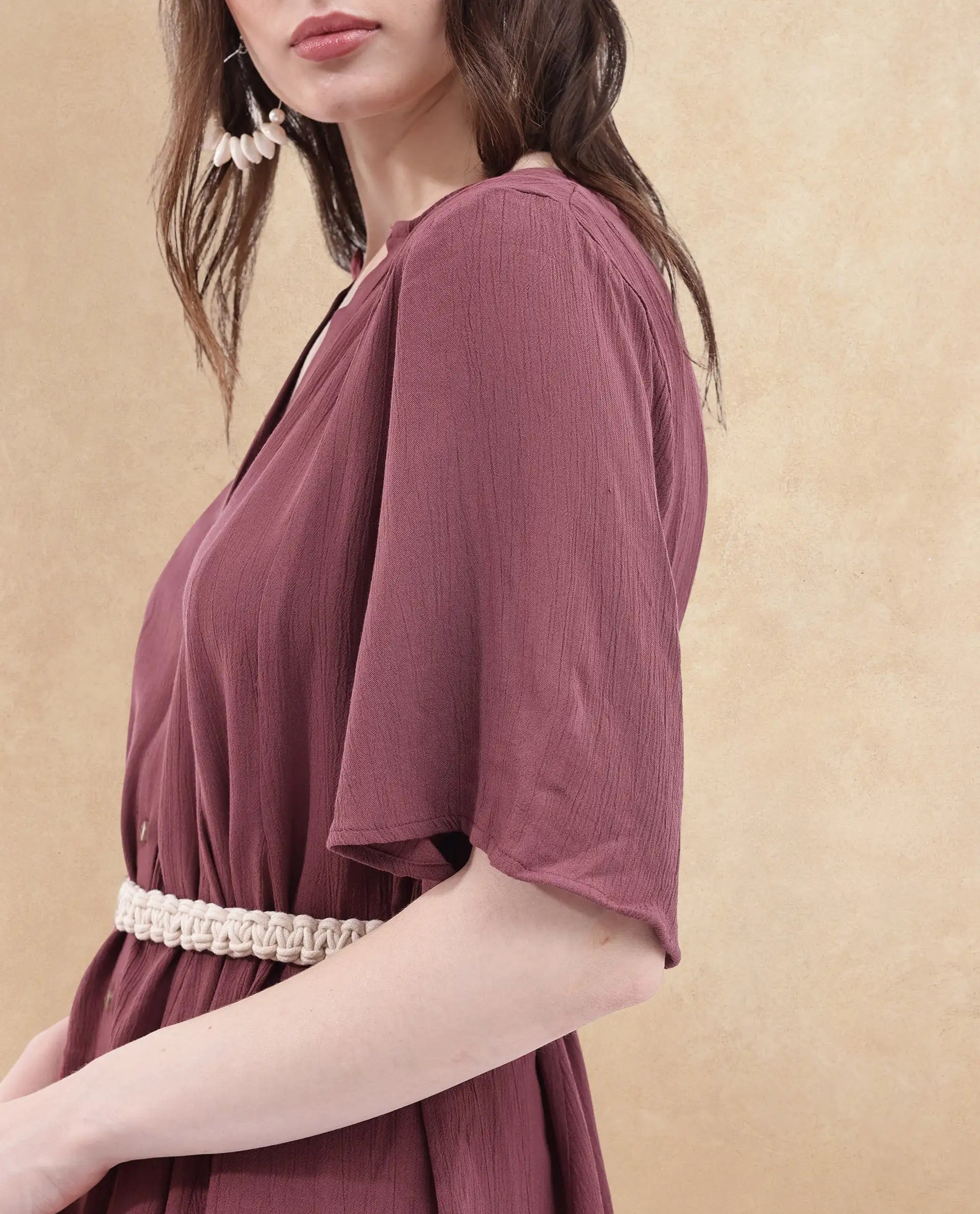 Rareism Women's Gildmore Maroon Rayon Fabric V-Neck Button Closure Flared Sleeve Plain Flared Mini Dress