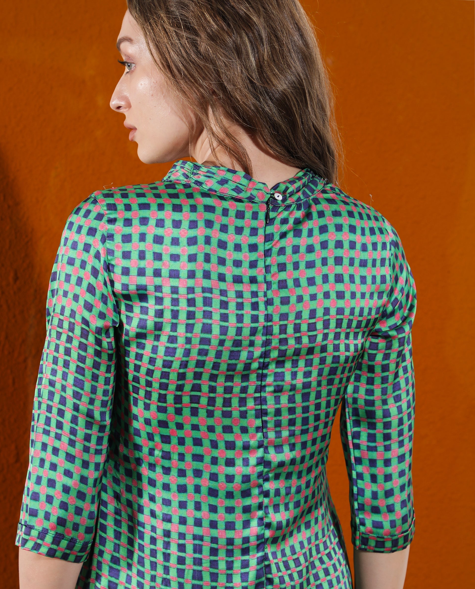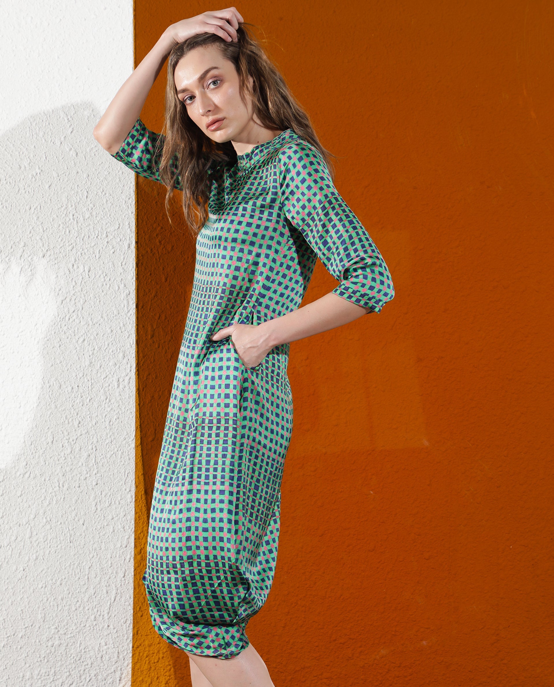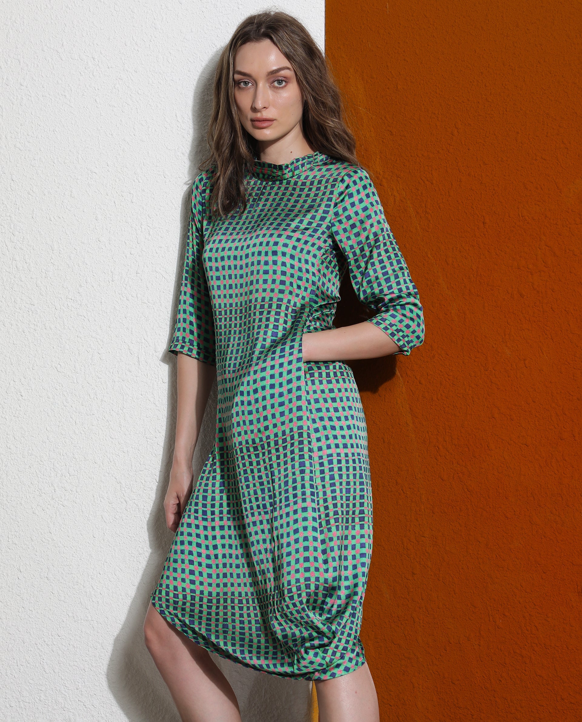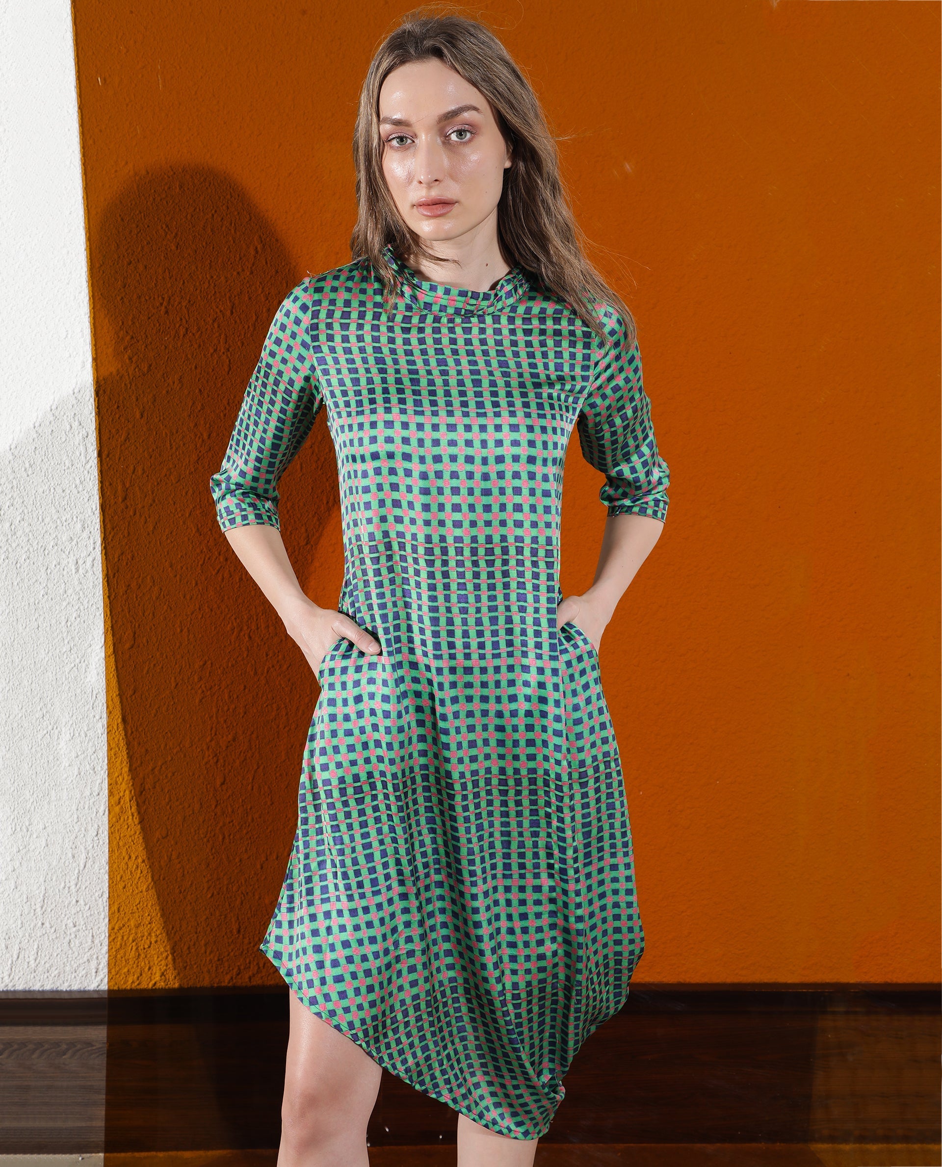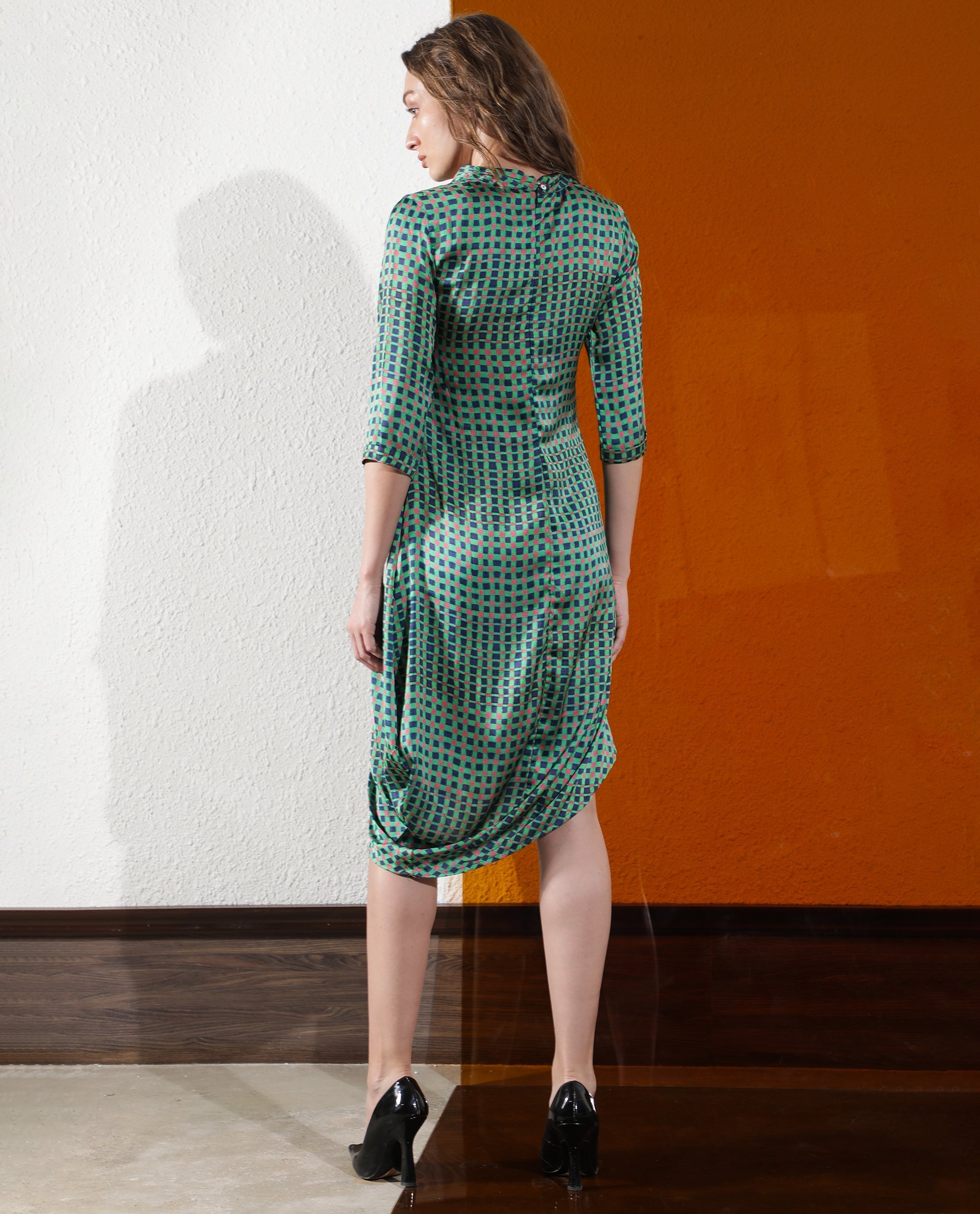 Rareism Women Gleam Green Polyester Fabric 3/4Th Sleeves Zip Closure High Neck Regular Fit Geometric Print Knee Length Asymmetric Dress