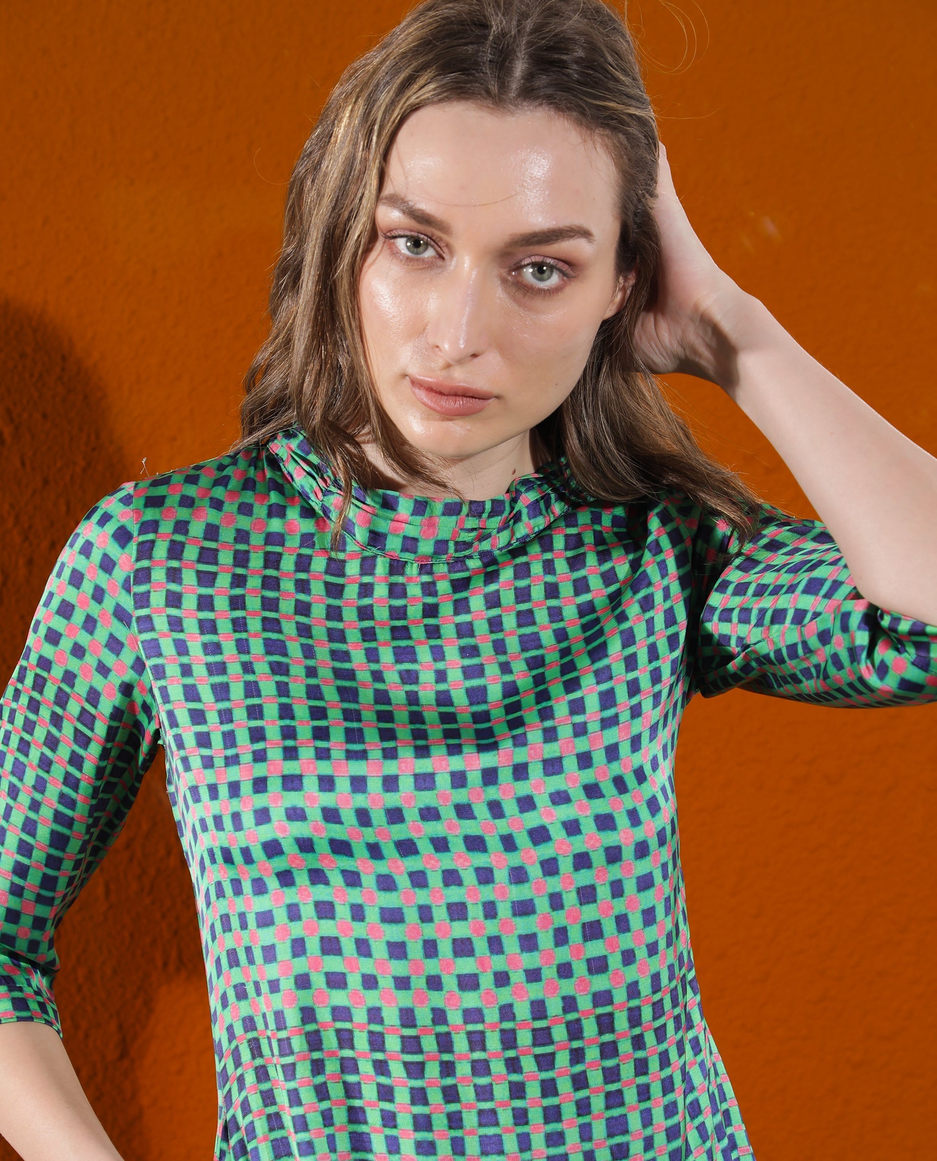 1. Embrace asymmetry with this dress featuring a scrunched-up neck and 3/4th sleeves.
